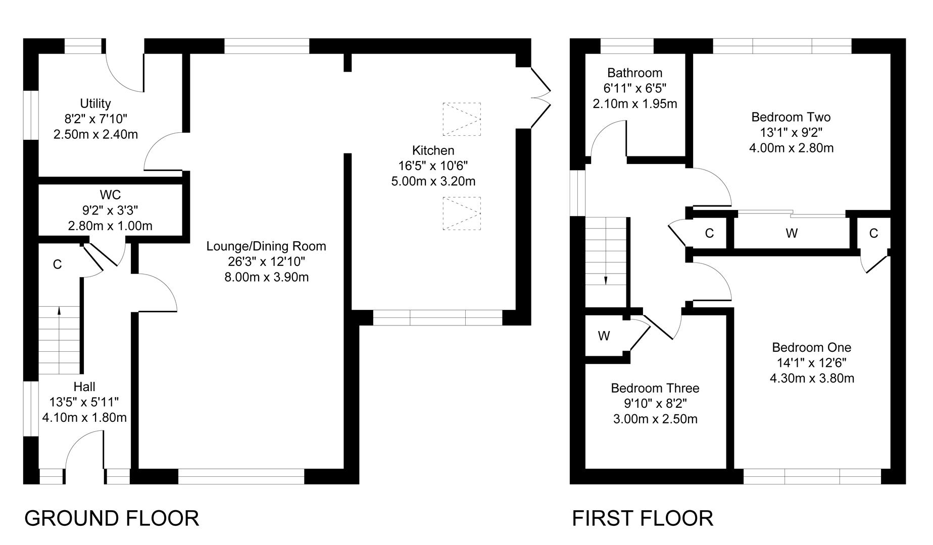 Split over two levels with the ground floor comprising of a welcoming entrance hallway, a bright and airy spacious lounge/dining area with hardwood flooring and dual aspect windows allowing for plenty of natural light, a stunning kitchen forming part of the extension with modern floor and wall mounted units, breakfast bar, integrated appliances and French doors. Completing the ground floor is a convenient WC and utility room with ample storage and space for appliances with separate door access to rear garden area.
