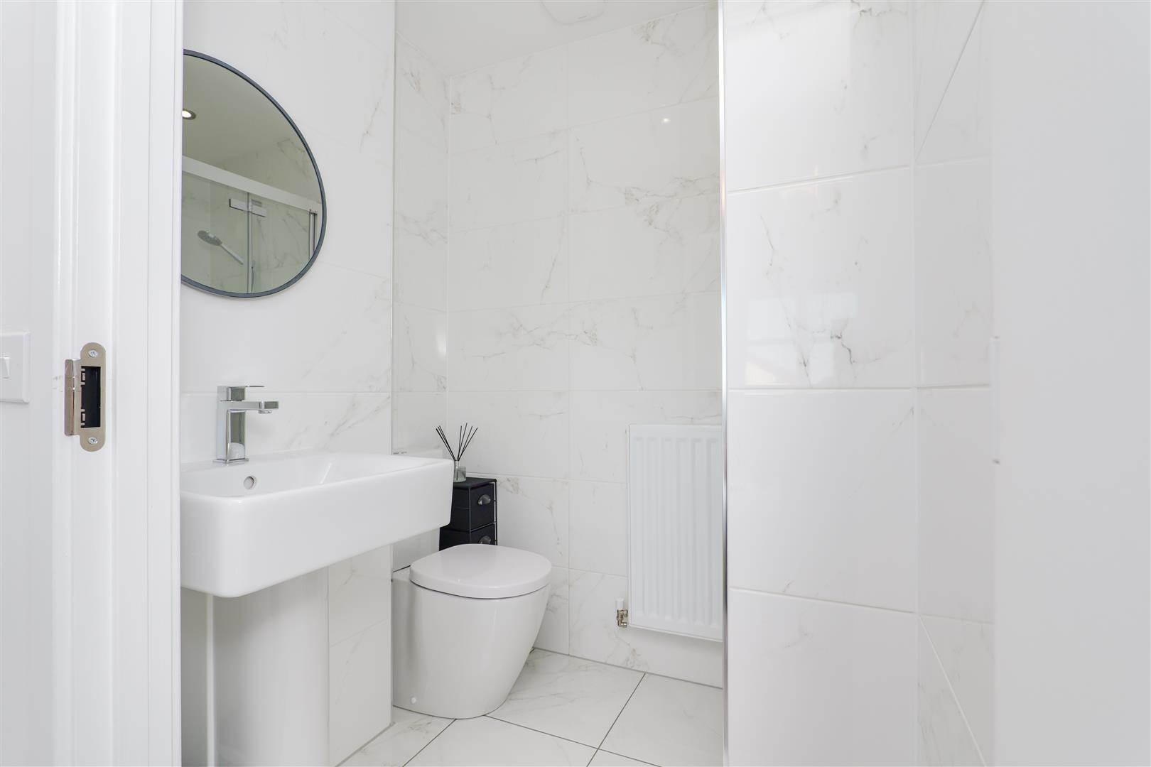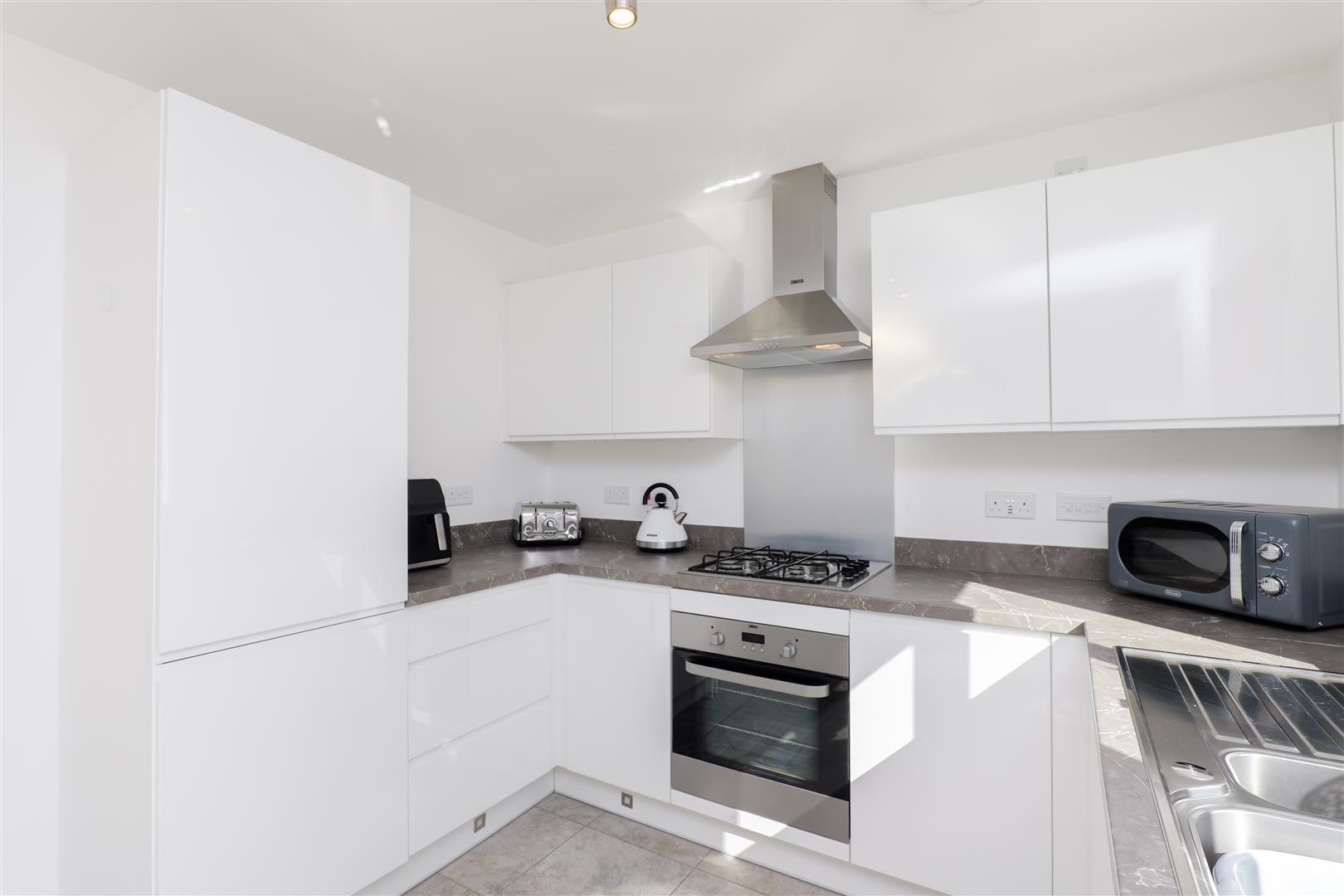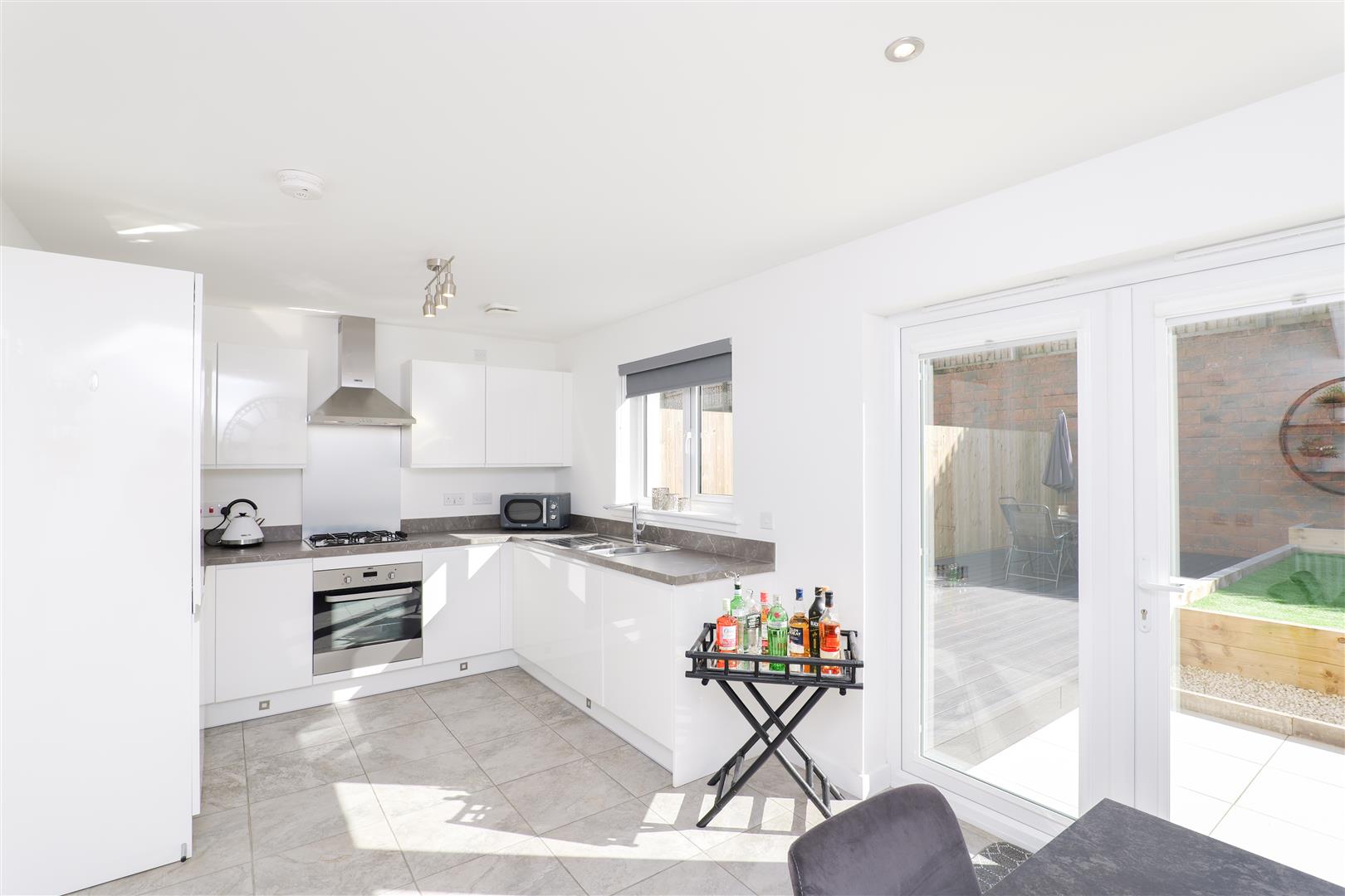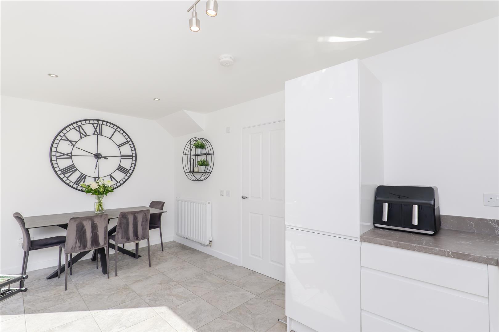 Upon entering, you're greeted by a welcoming hallway that leads to a bright and airy front-facing lounge. The modern kitchen/dining area is fully equipped with ample storage, a built-in oven and gas hob, and French doors that open to the private rear garden. Completing the ground floor is a convenient cloakroom WC.