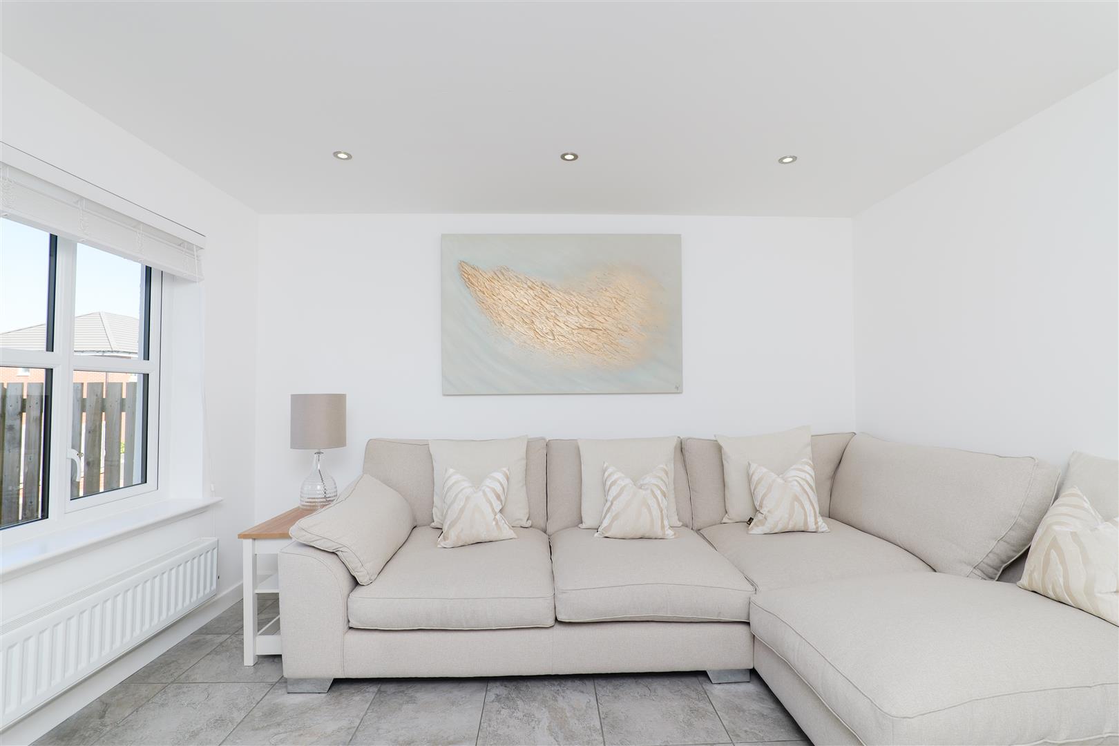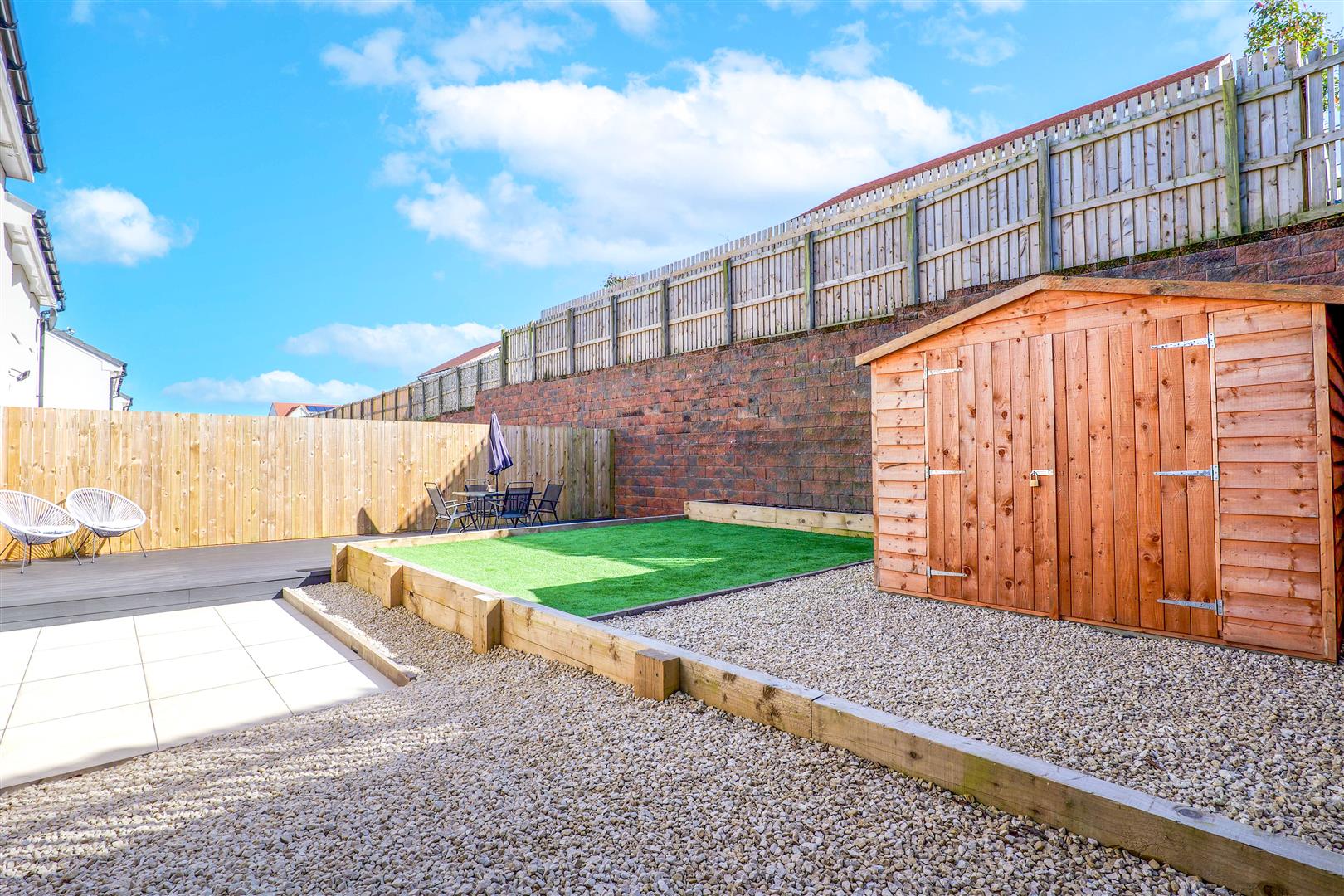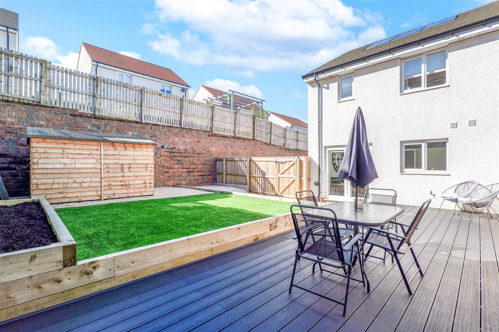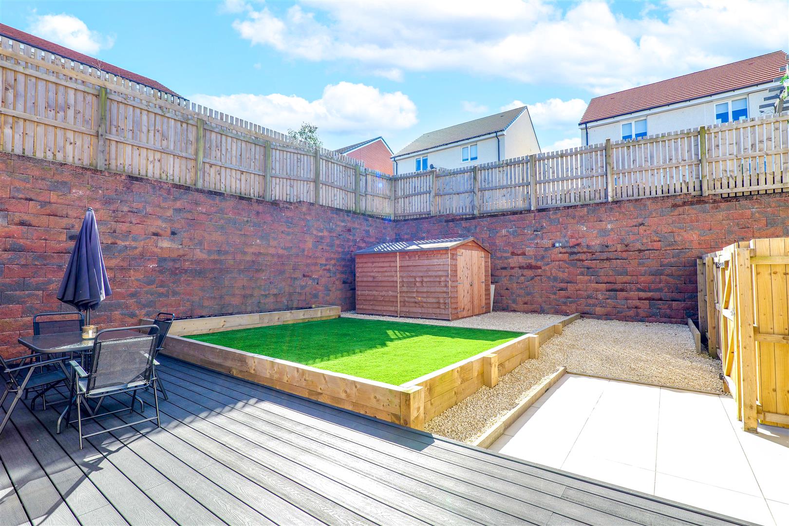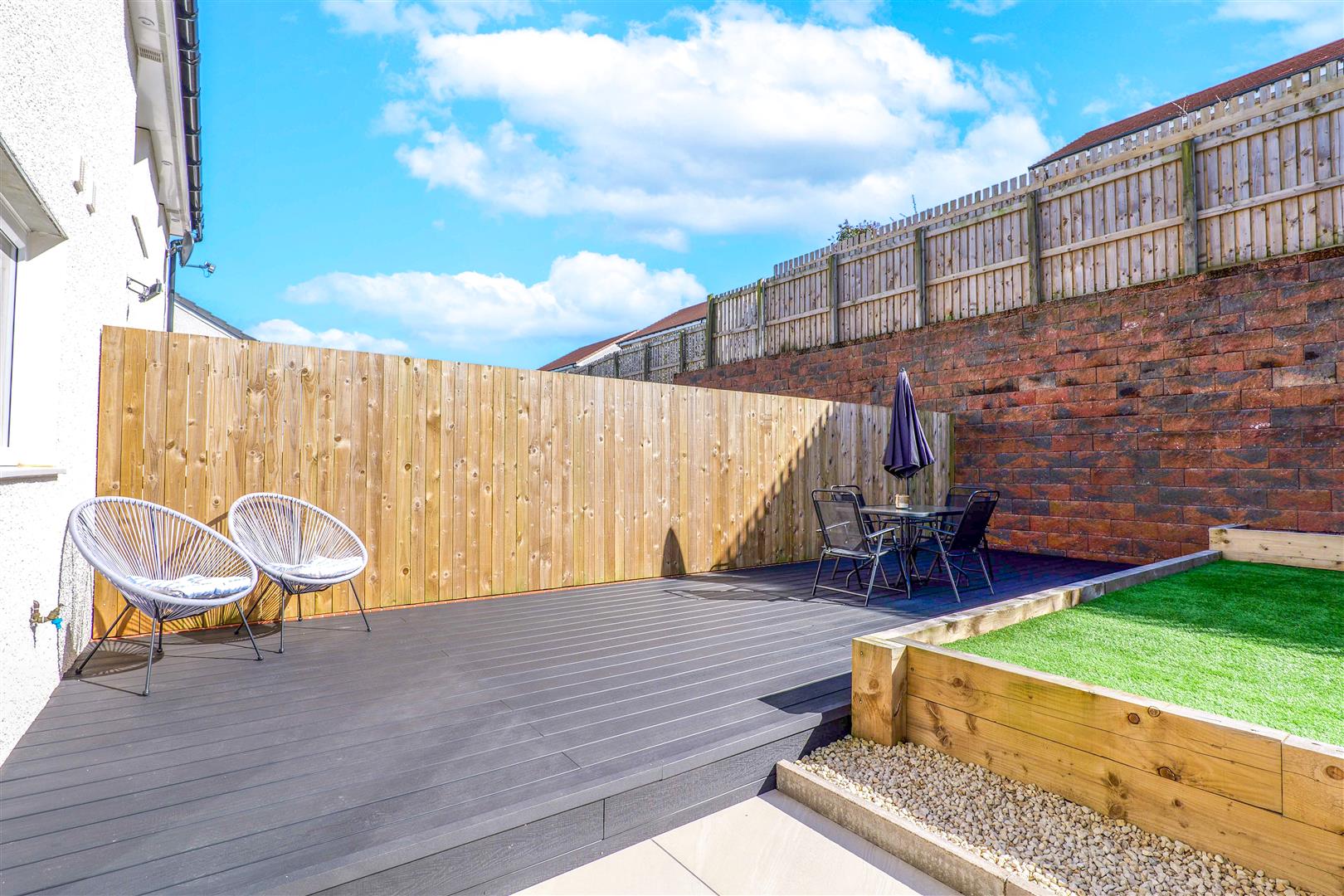 Additional highlights include gas central heating, double-glazed windows, and a spacious monoblocked driveway. The generously sized private rear garden is fully enclosed and features a slabbed patio, artificial lawn, and a separate raised decked area, perfect for outdoor entertaining.