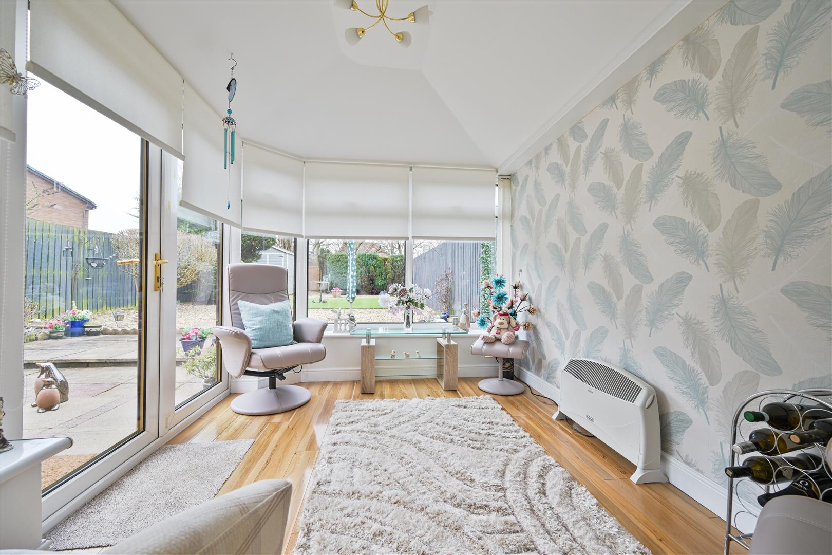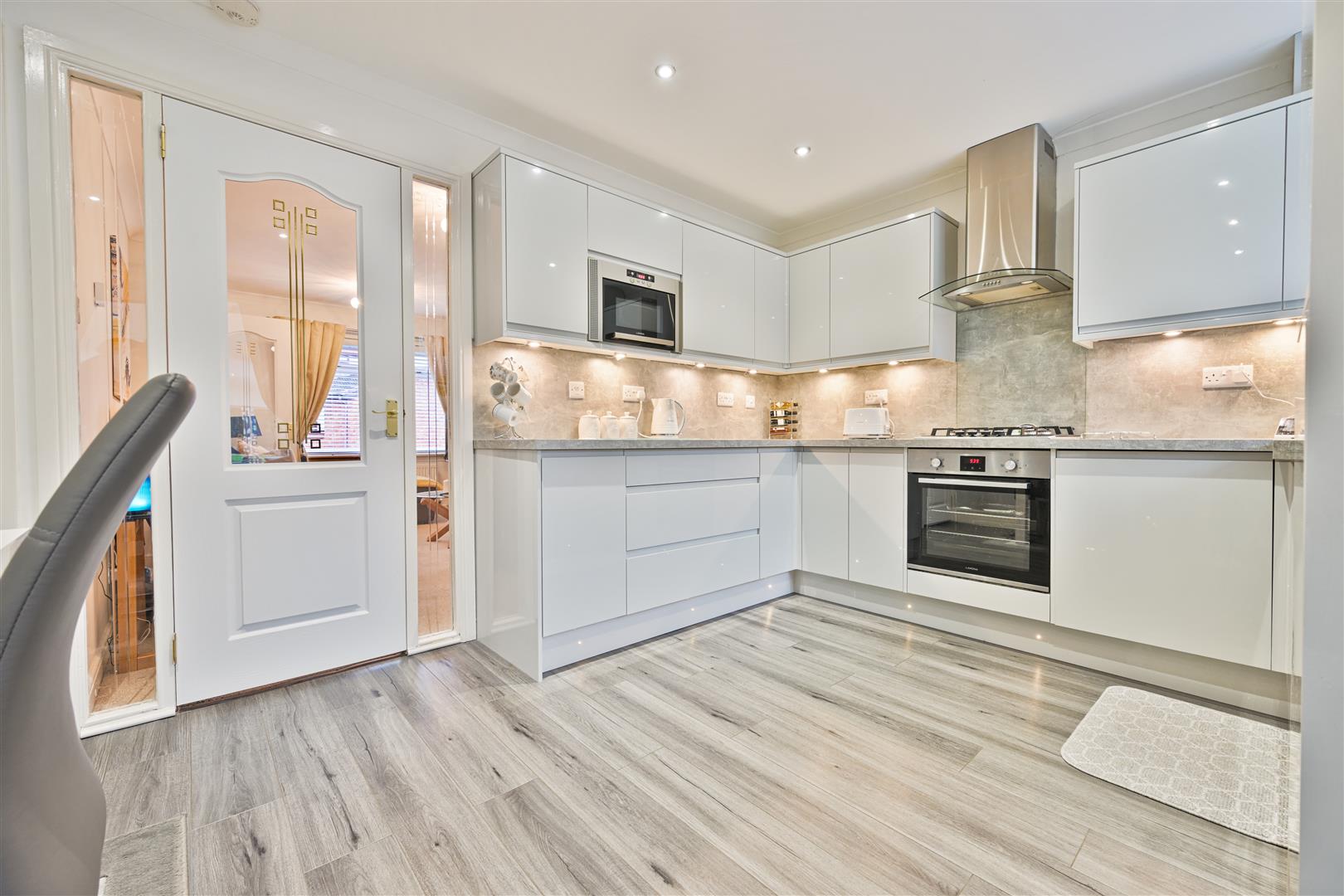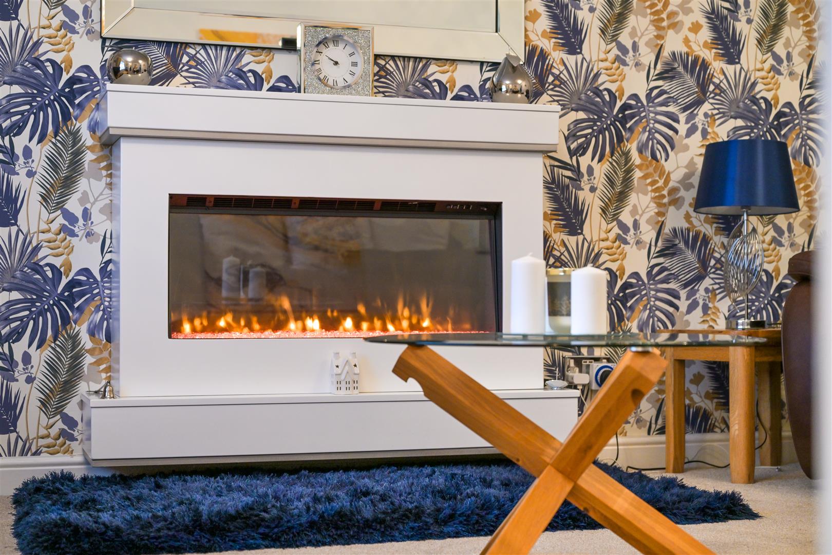 The ground floor opens with a welcoming entrance vestibule leading into a bright, front-facing lounge featuring soft carpet flooring, a large window that fills the room with natural light, and an attractive feature fireplace creating a warm focal point. To the rear of the property lies the impressive kitchen and dining area, forming the heart of the home. This stylish space offers a wide range of modern base and wall-mounted units, generous worktop space, and integrated appliances. From here, access leads to a charming conservatory overlooking the rear garden, providing an ideal additional space to relax and unwind.