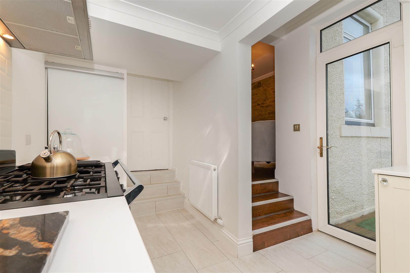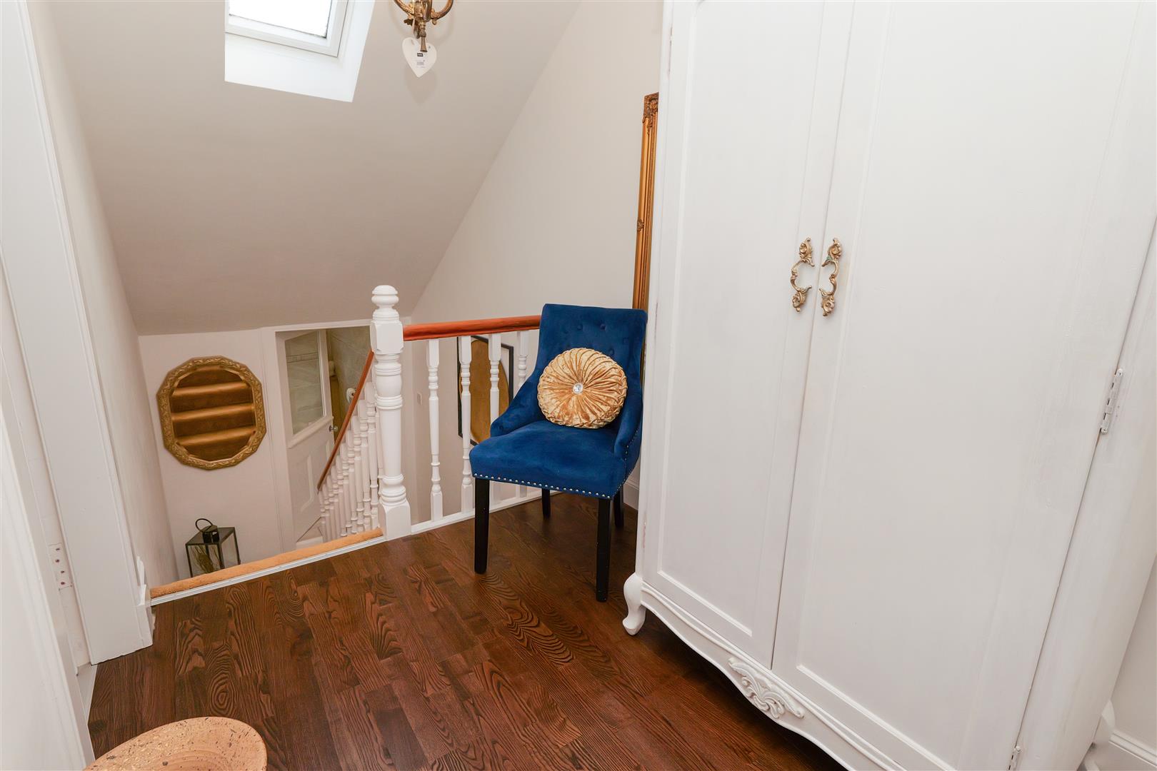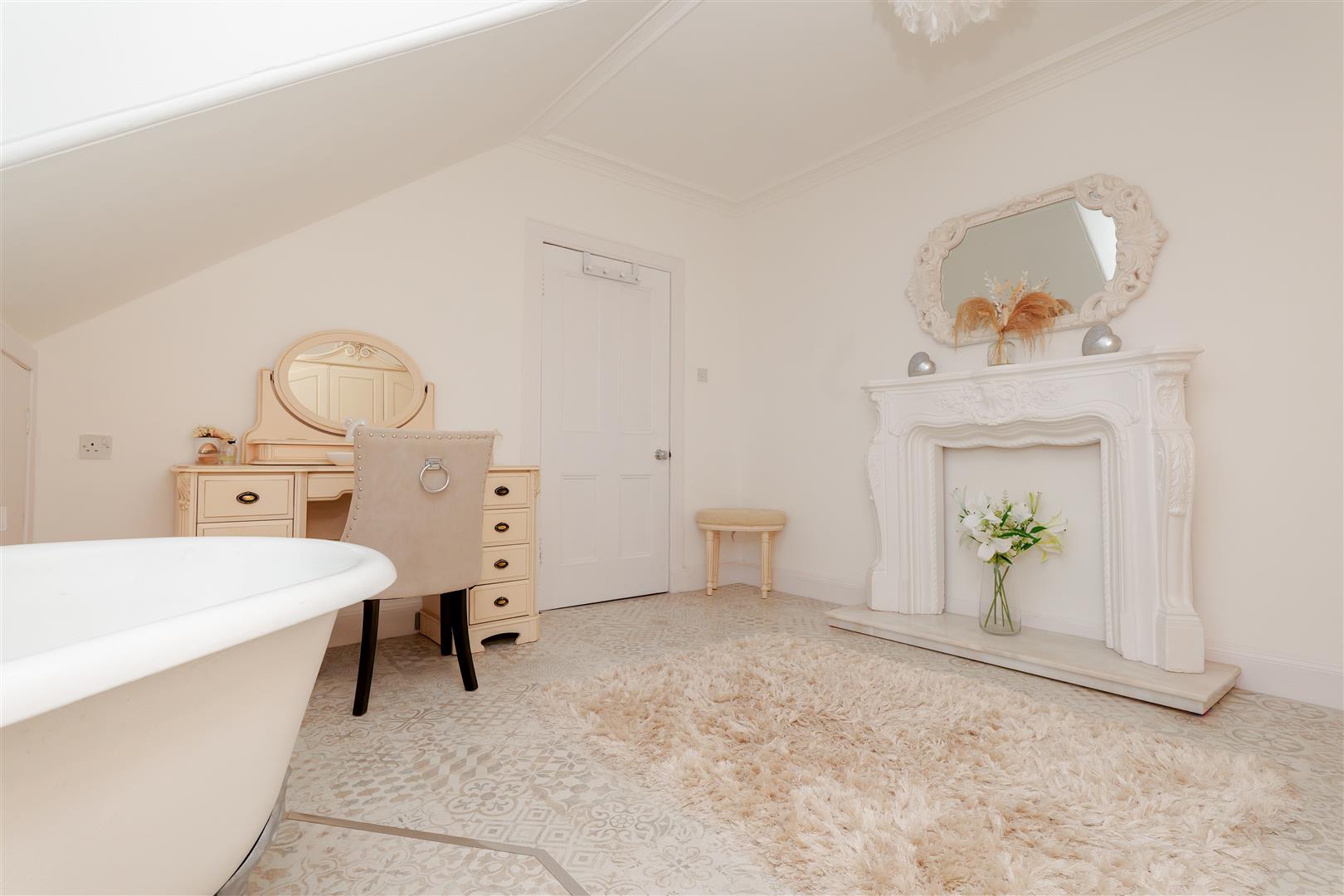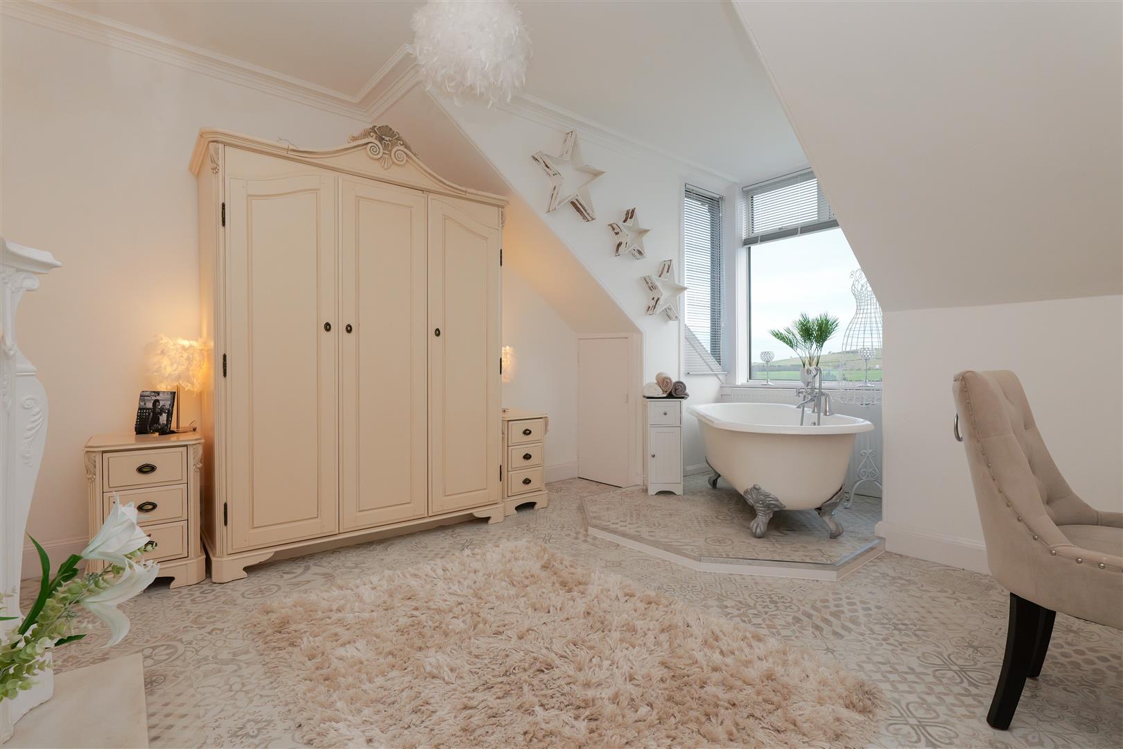 On the upper level via a beautiful carpeted staircase you will find a large walk in wardrobe, two bedrooms, both of which have neutral colour decor and a mix of carpeted and retro laminate flooring with ample storage space. The second bedroom benefits from a free standing cast iron bath with exceptional views overlooking the countryside. On the middle landing you will find a lovely fully tiled family bathroom which consists of a back to wall WC/sink combination and walk in shower enclosure.