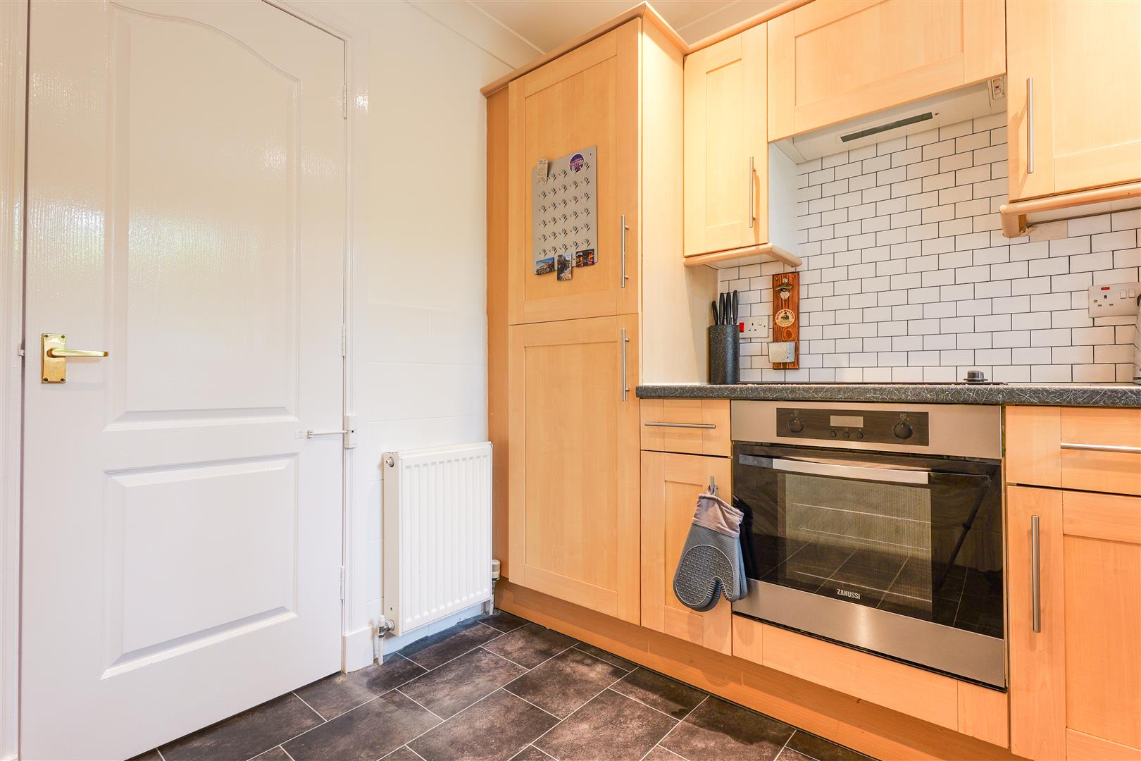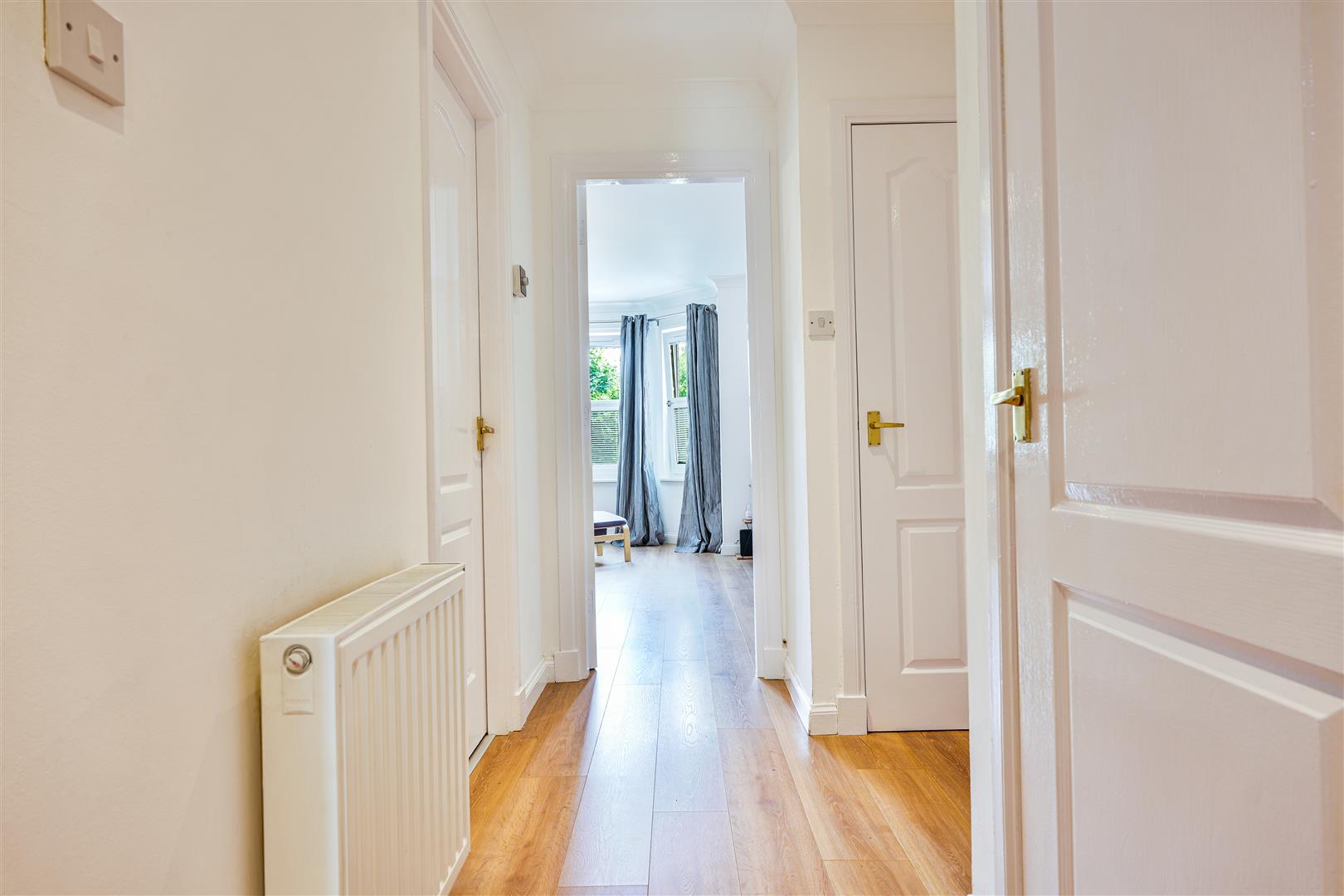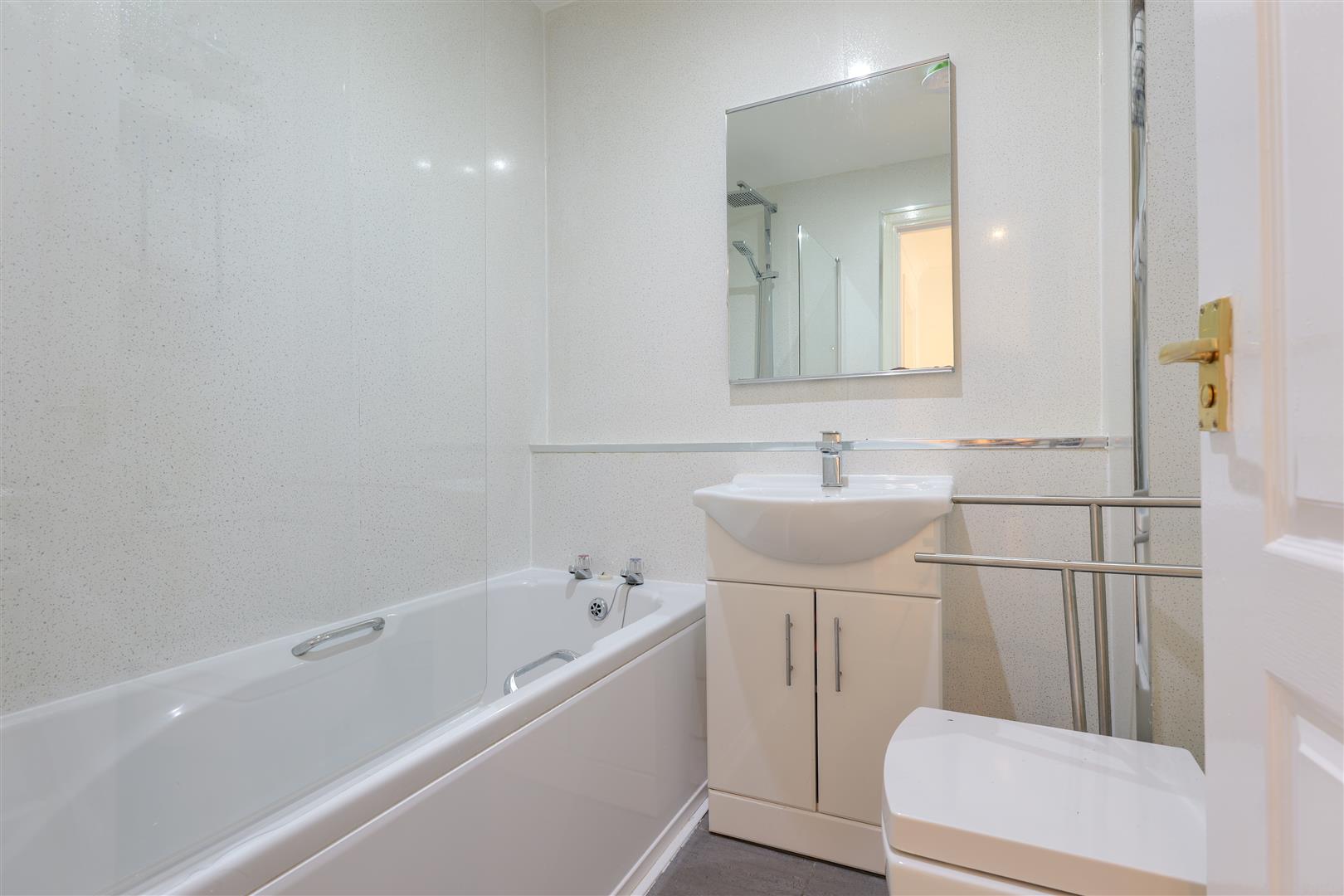 A bright and welcoming reception hall provides access to all main apartments, leading into a spacious living room filled with natural light from its attractive bay window feature, a perfect space for both relaxing and entertaining. The modern fitted kitchen offers a practical and stylish cooking space, complete with a range of contemporary floor and wall-mounted units, ample worktop space, and room for appliances, making it ideal for everyday use.
