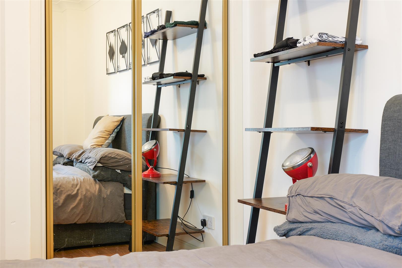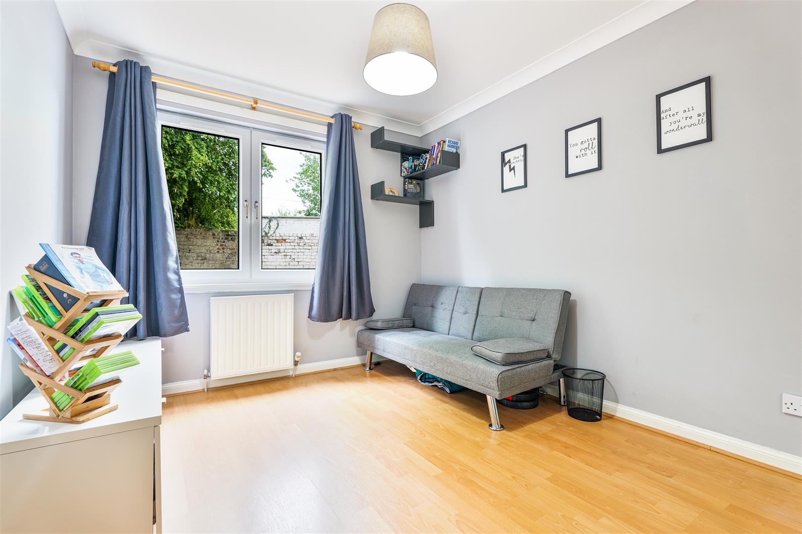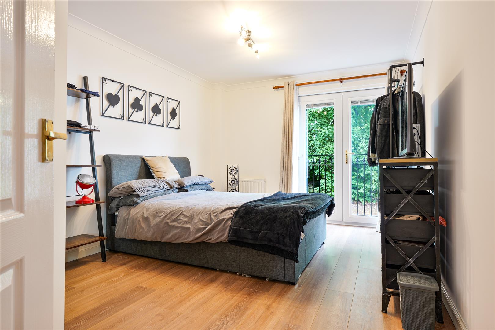 The master bedroom is generously proportioned and features French doors that open to the outdoors, allowing light and fresh air to flood in. It also benefits from built-in storage and an ensuite shower room for added privacy and convenience. The second double bedroom is also of an excellent size, complete with built-in storage, making it perfect for guests or a home office. A further family bathroom is finished in sleek wet wall panelling and includes a bath with shower over, combining functionality with low-maintenance style.