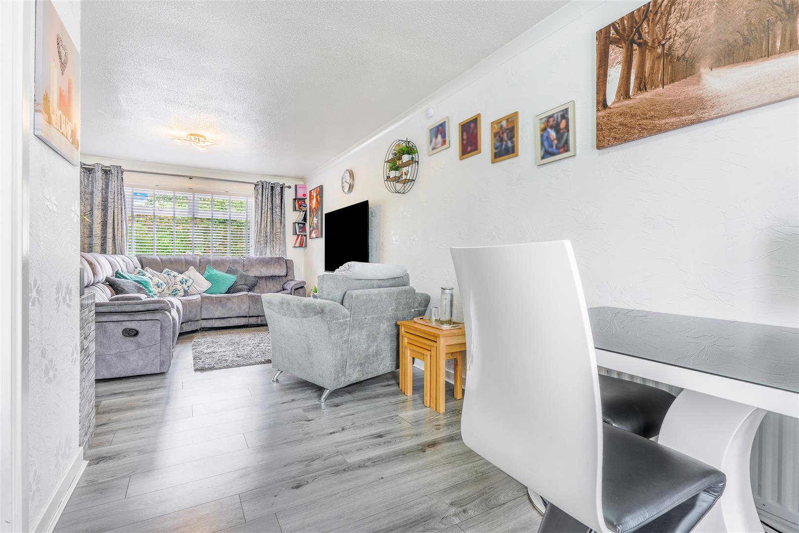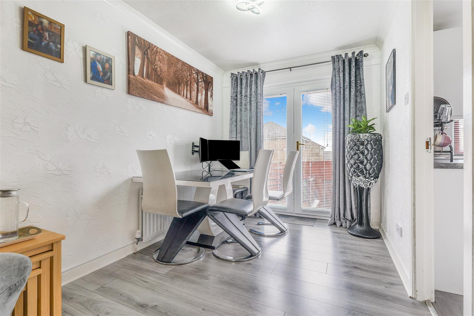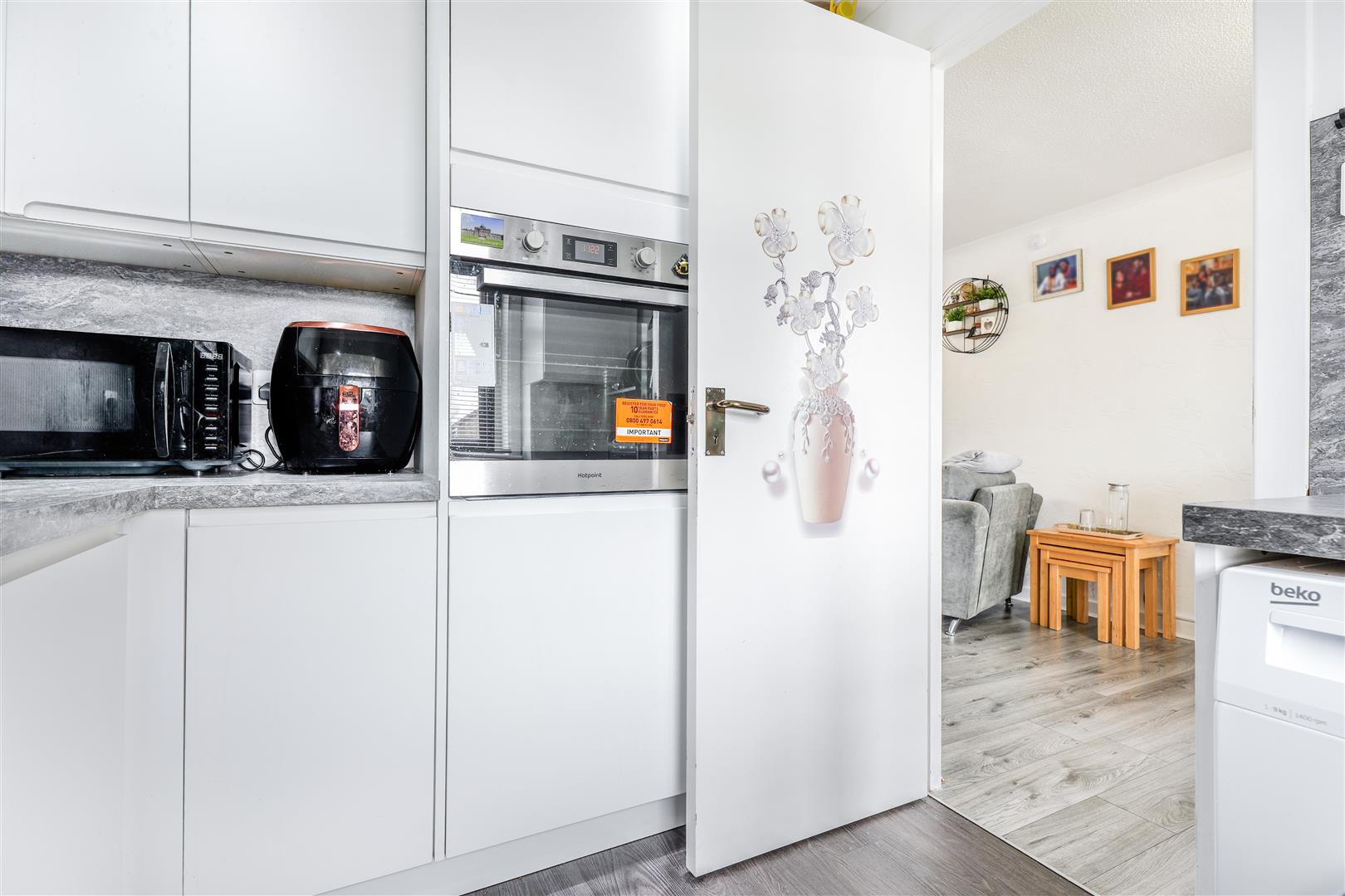 The ground floor of the property features a spacious entrance hall leading into a bright and airy lounge/dining area, enhanced by stylish laminate flooring, a front-facing window, and French doors at the rear that open directly onto the garden—perfect for indoor-outdoor living. The lovely modern fitted kitchen boasts sleek handleless wall and floor units, a built-in eye-level oven, and dedicated space for appliances.
