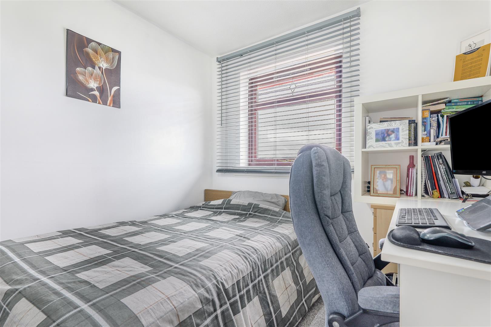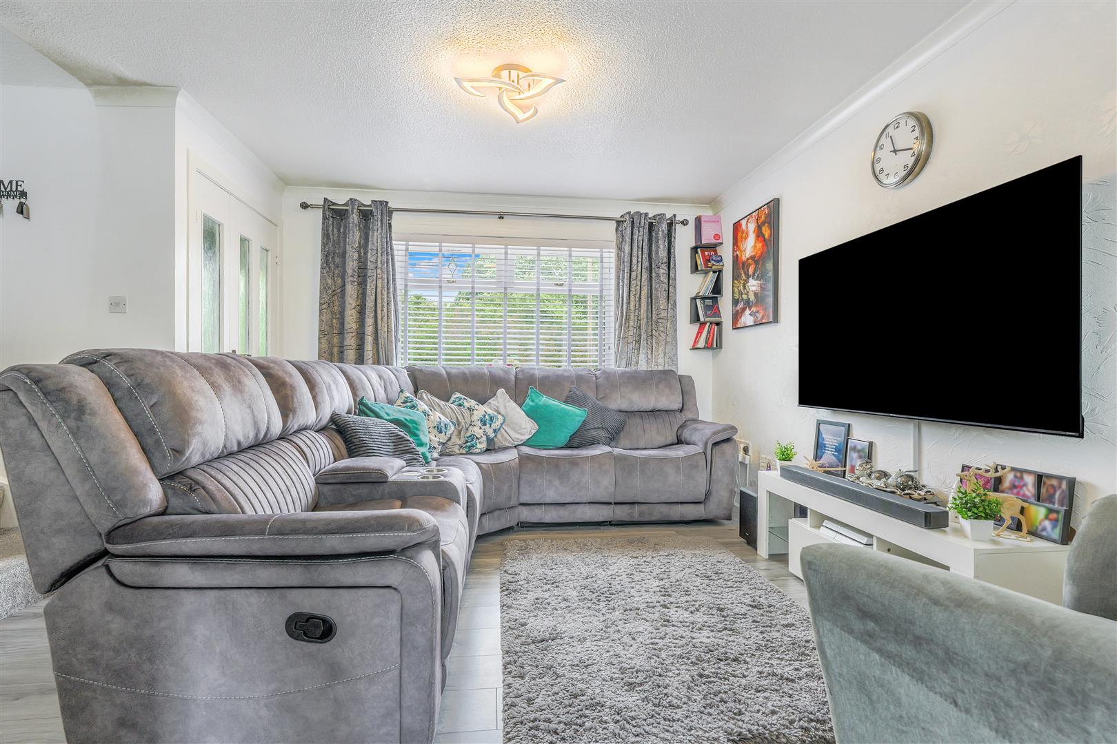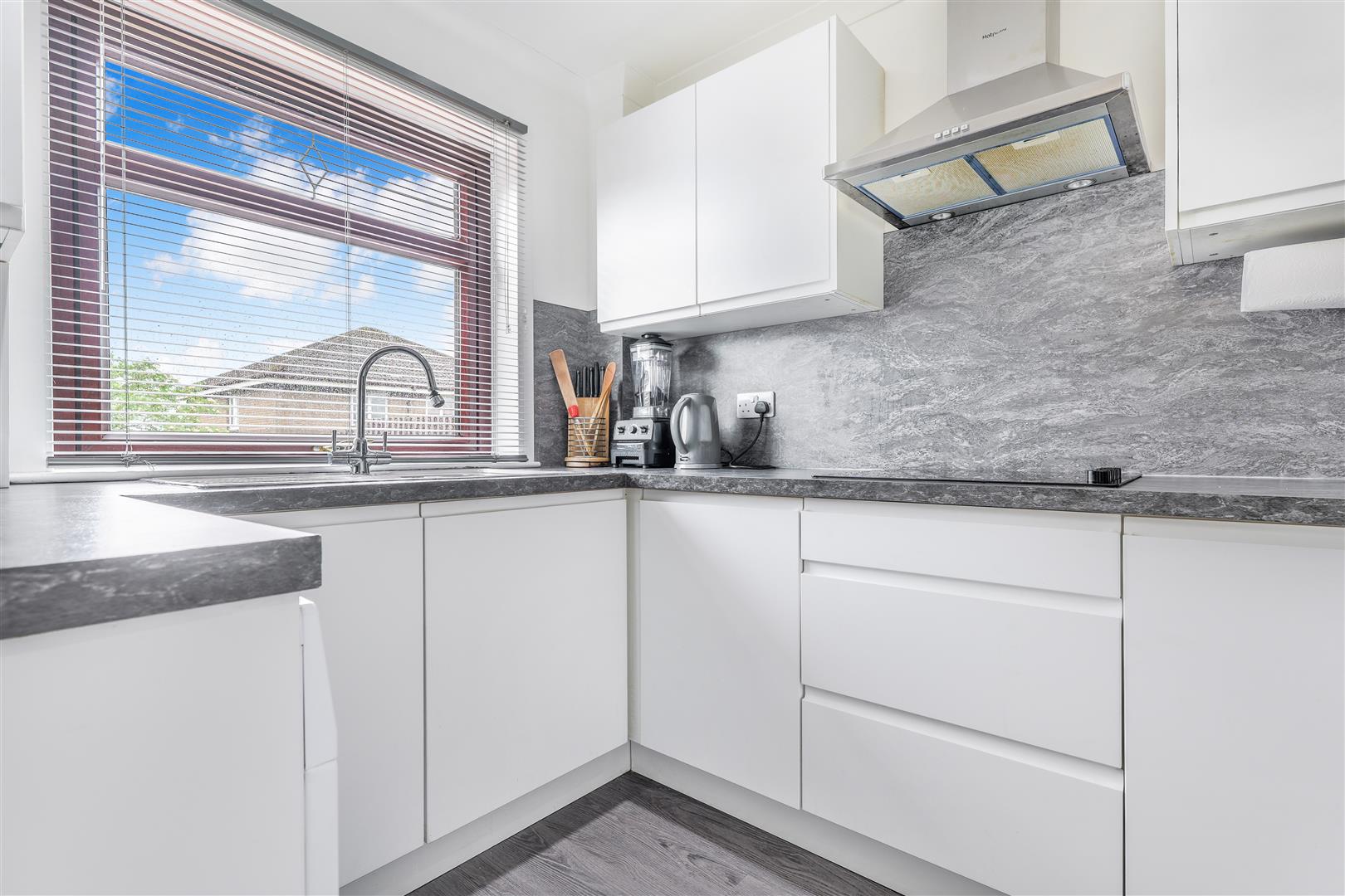 The ground floor of the property features a spacious entrance hall leading into a bright and airy lounge/dining area, enhanced by stylish laminate flooring, a front-facing window, and French doors at the rear that open directly onto the garden—perfect for indoor-outdoor living. The lovely modern fitted kitchen boasts sleek handleless wall and floor units, a built-in eye-level oven, and dedicated space for appliances.