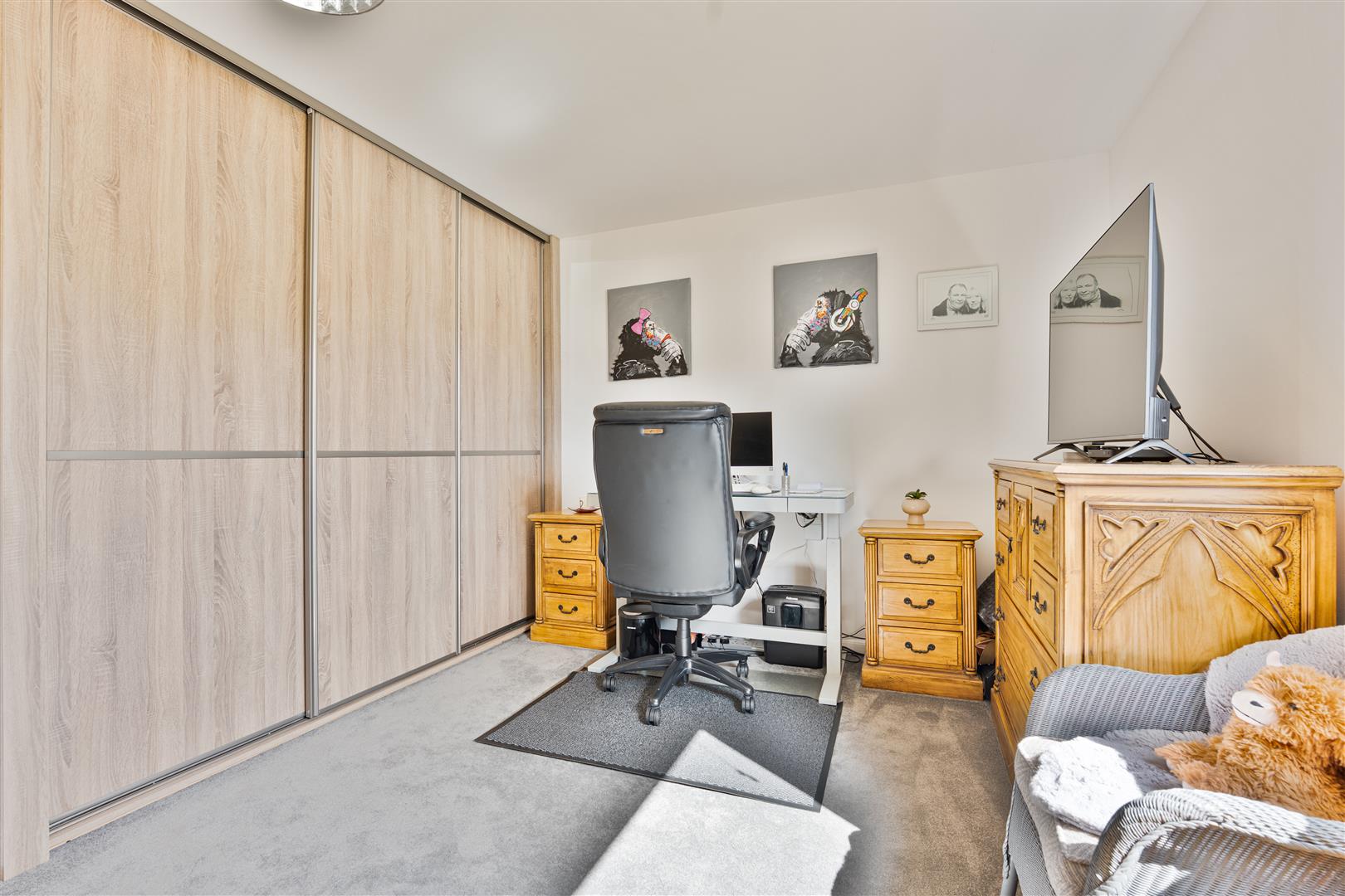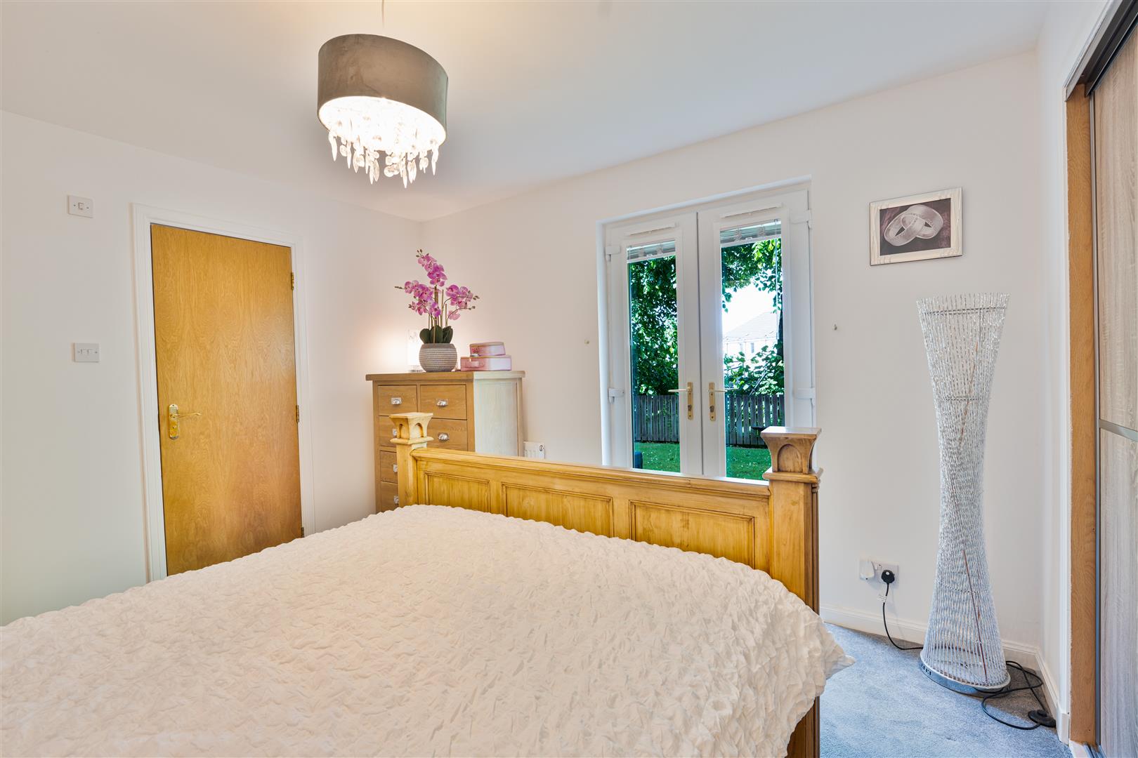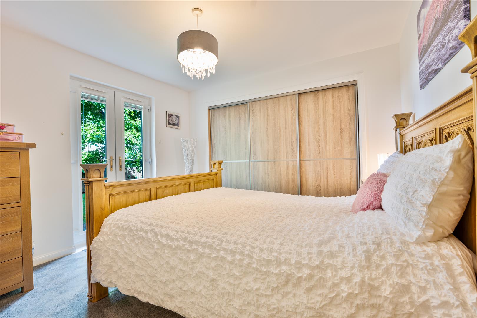 The master bedroom is a true highlight, complete with elegant fitted wardrobes and French doors that open directly onto beautifully maintained communal gardens. A contemporary en-suite shower room adds a touch of luxury and privacy. The generously sized second bedroom also benefits from two fitted wardrobes, offering excellent storage without sacrificing space. There is also a stylish separate spacious wet room, finished with a modern touch – ideal for guests or family.