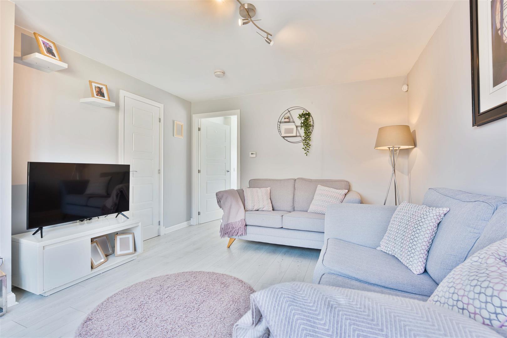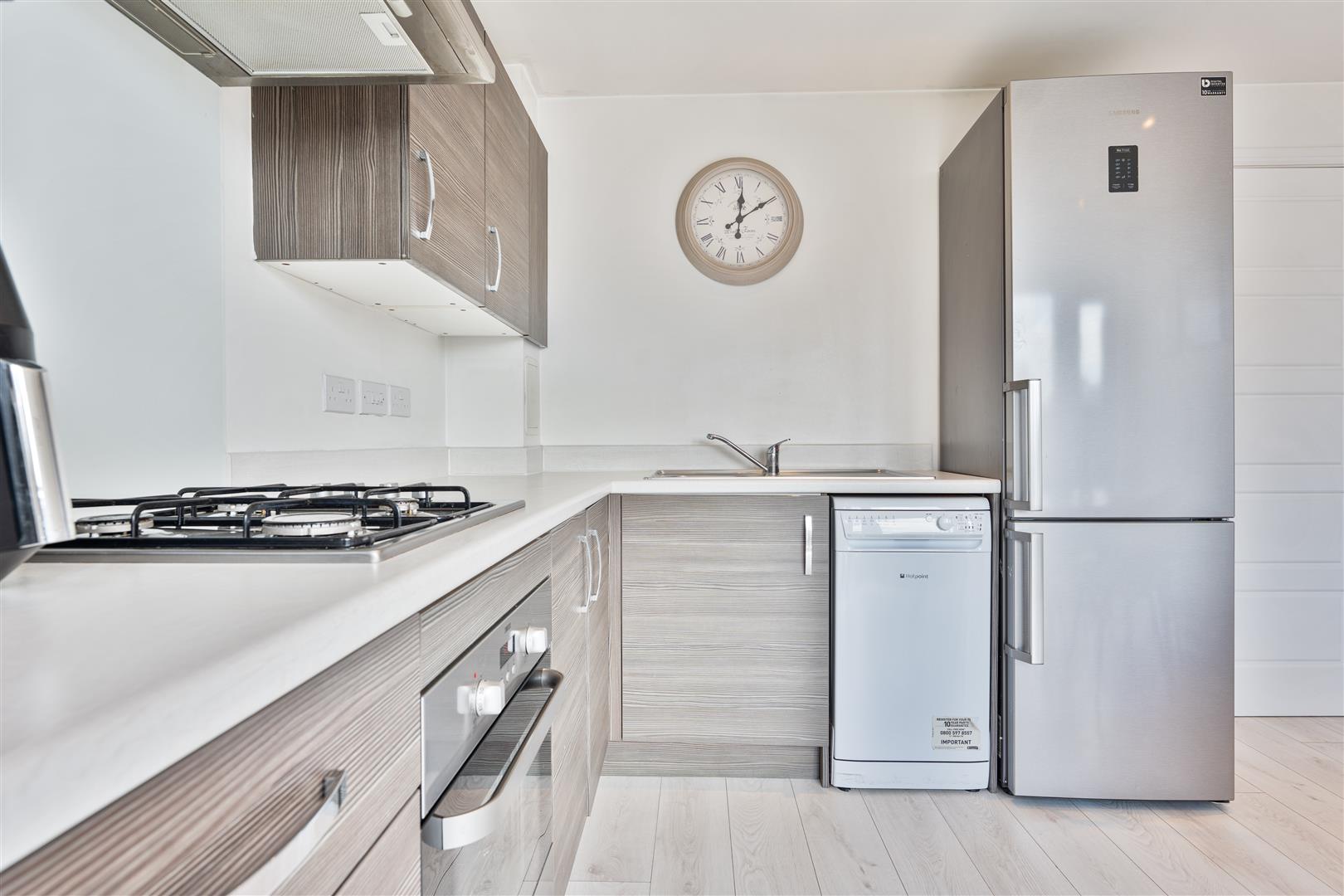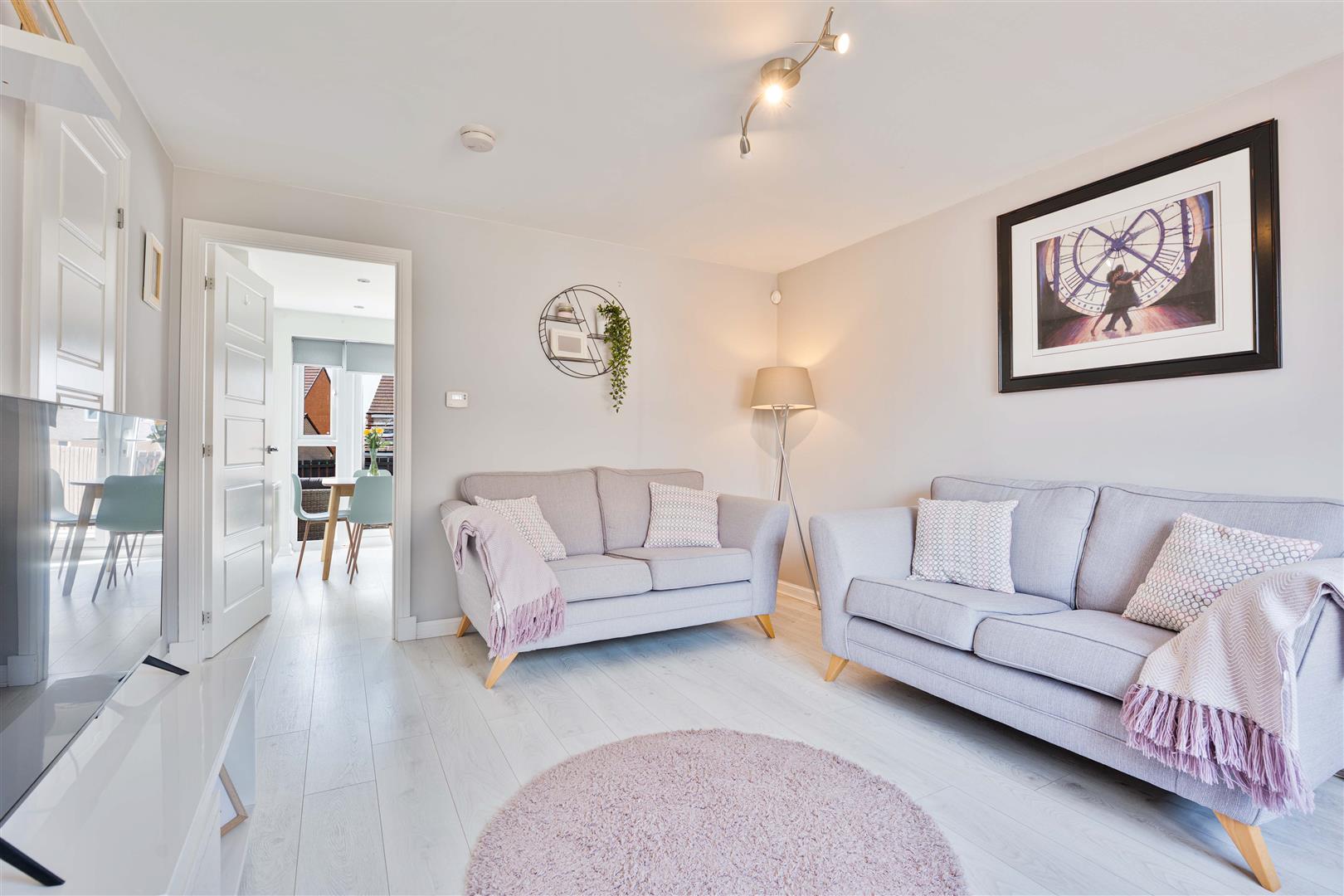 The ground floor comprises of a bright, airy entrance hallway leading into a generously sized, front-facing lounge featuring neutral décor and laminate flooring — perfect for relaxing or entertaining. To the rear, a modern kitchen and dining area boasts an excellent range of wall and floor-mounted units, a built-in oven with gas hob, and elegant French doors that flood the space with natural light and open onto the private rear garden. A convenient WC and a practical utility area complete the ground floor accommodation.