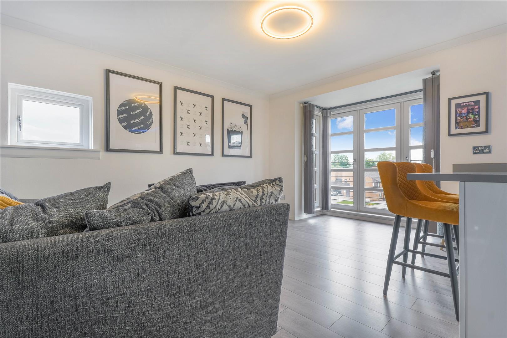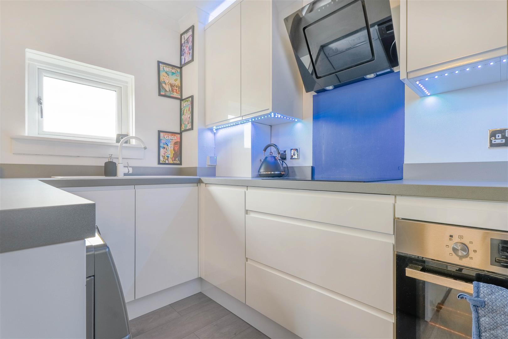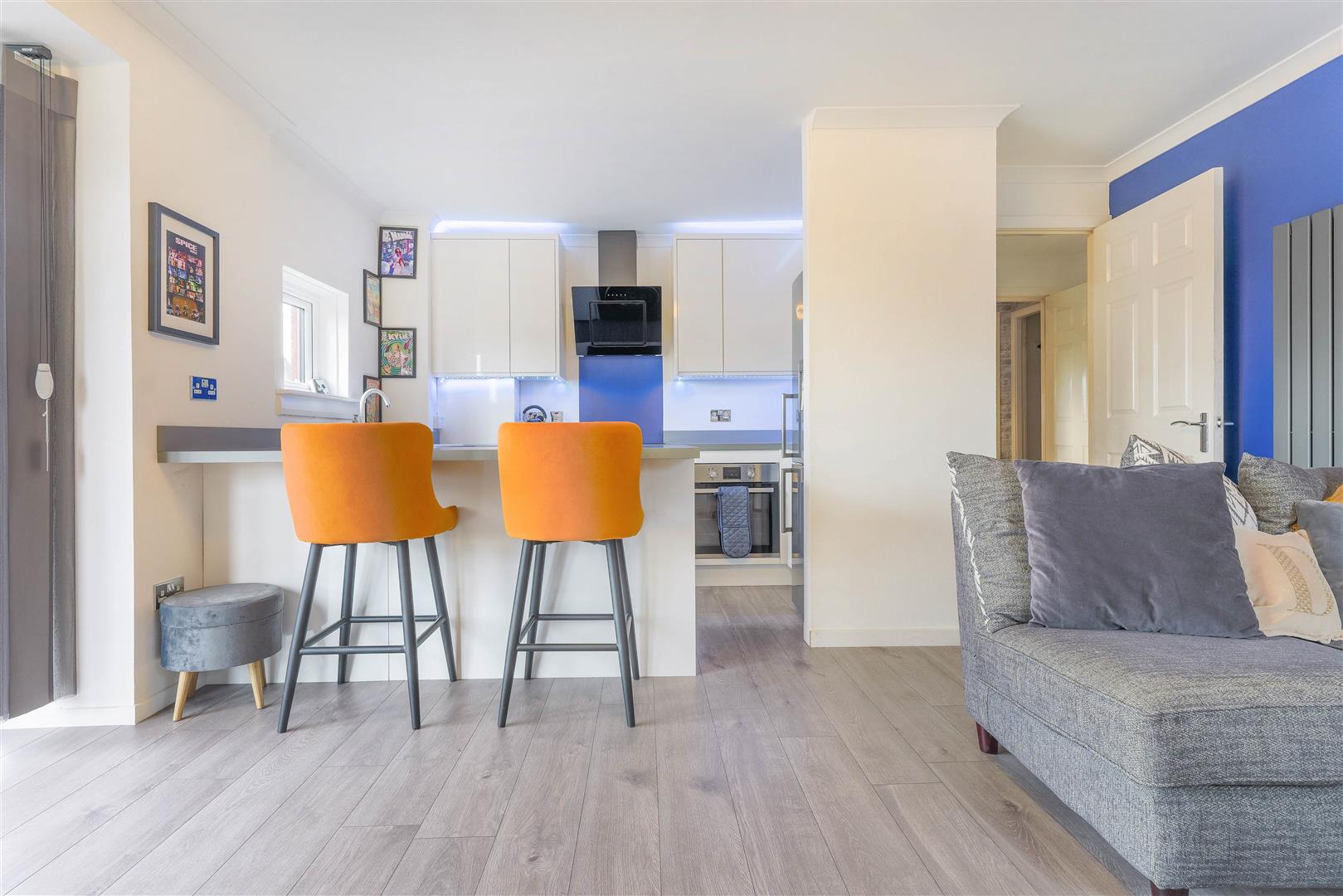 The accommodation comprises an entrance vestibule with useful storage, leading into a bright and welcoming hallway. The heart of the home is the open-plan living and kitchen area. The living space is generously proportioned and features a striking bay window that floods the room with natural light. Flowing seamlessly from here is the sleek, modern handleless kitchen, which offers excellent storage and worktop space and is complete with an L-shaped breakfast bar which is perfect for dining or entertaining.