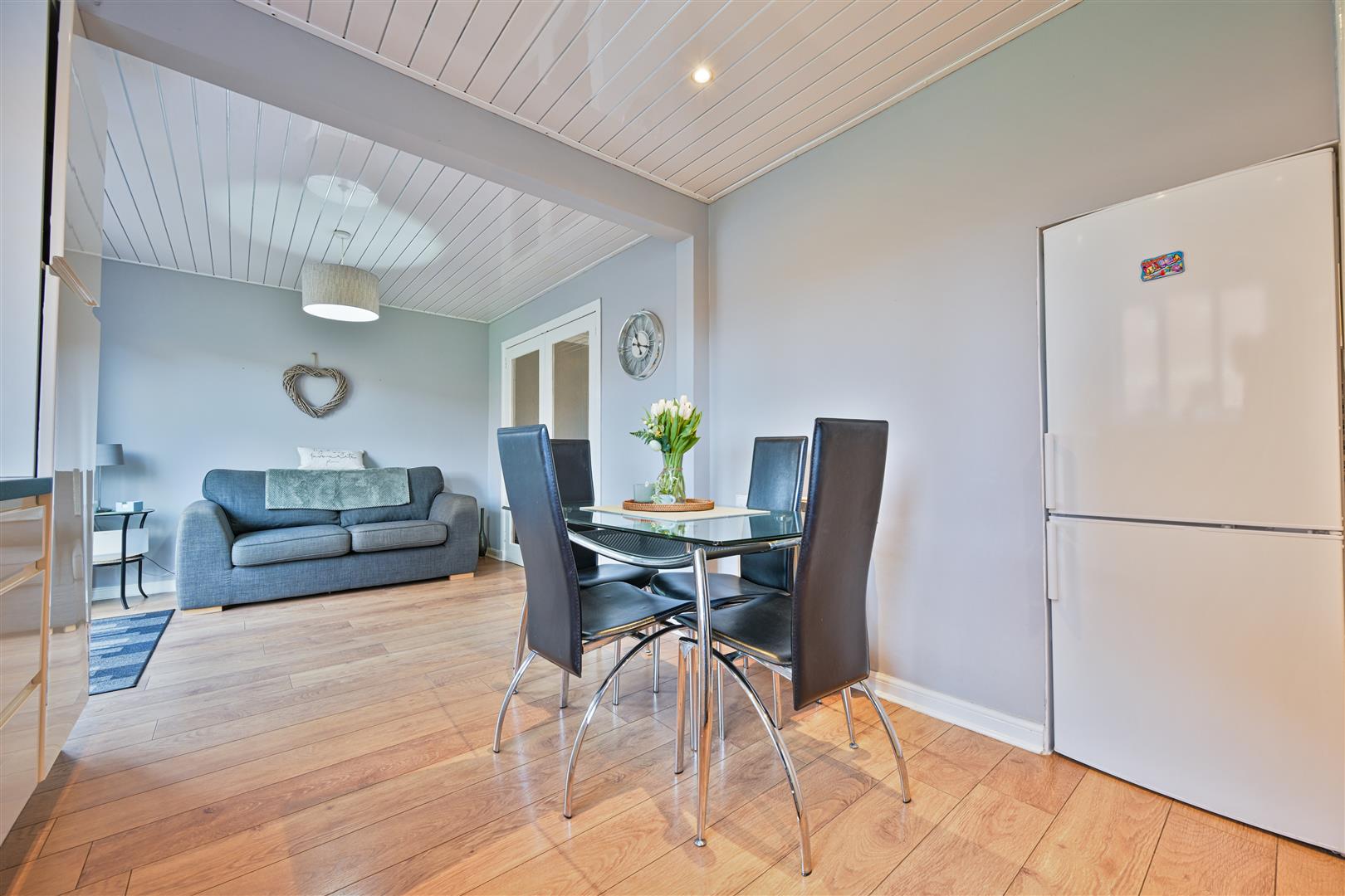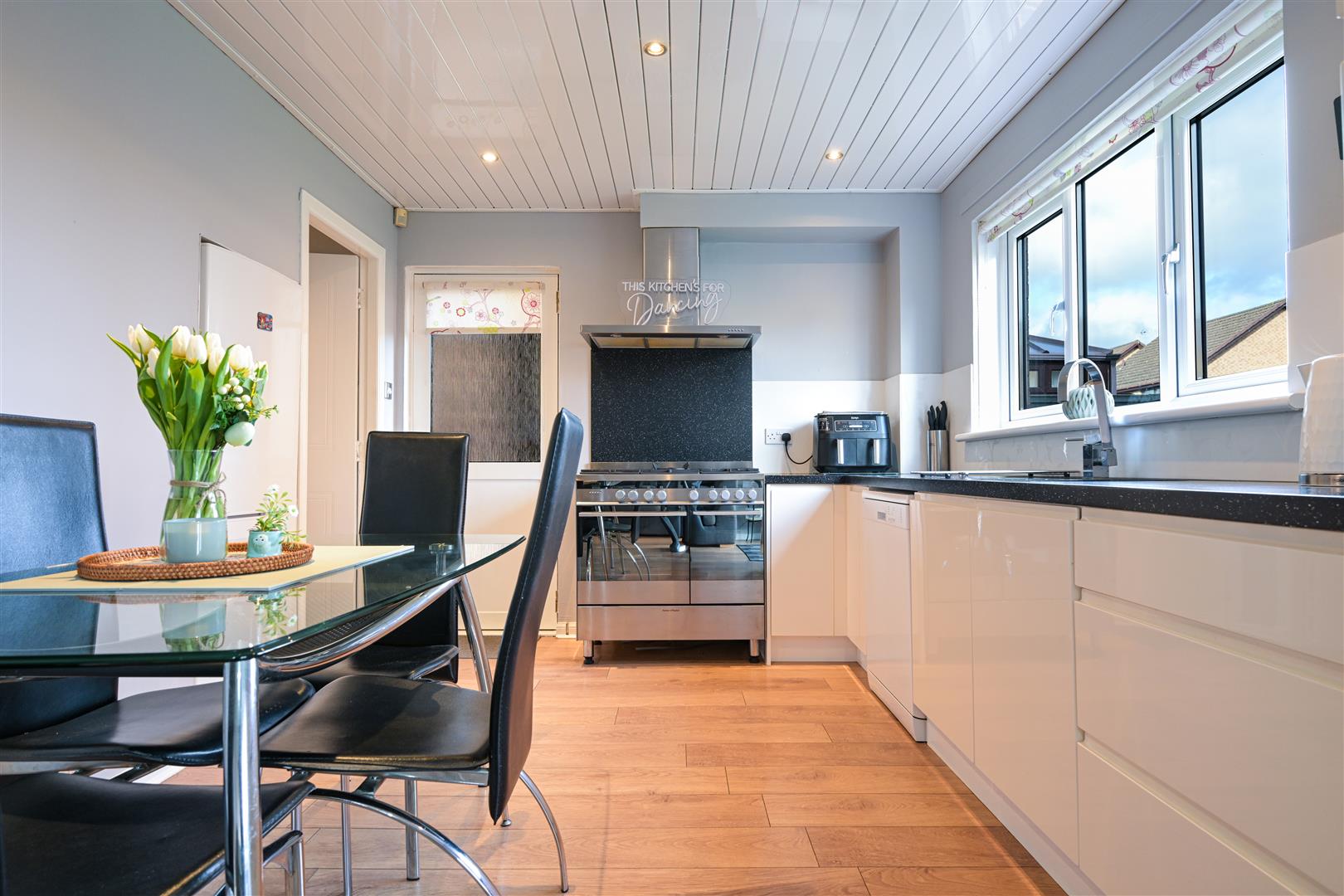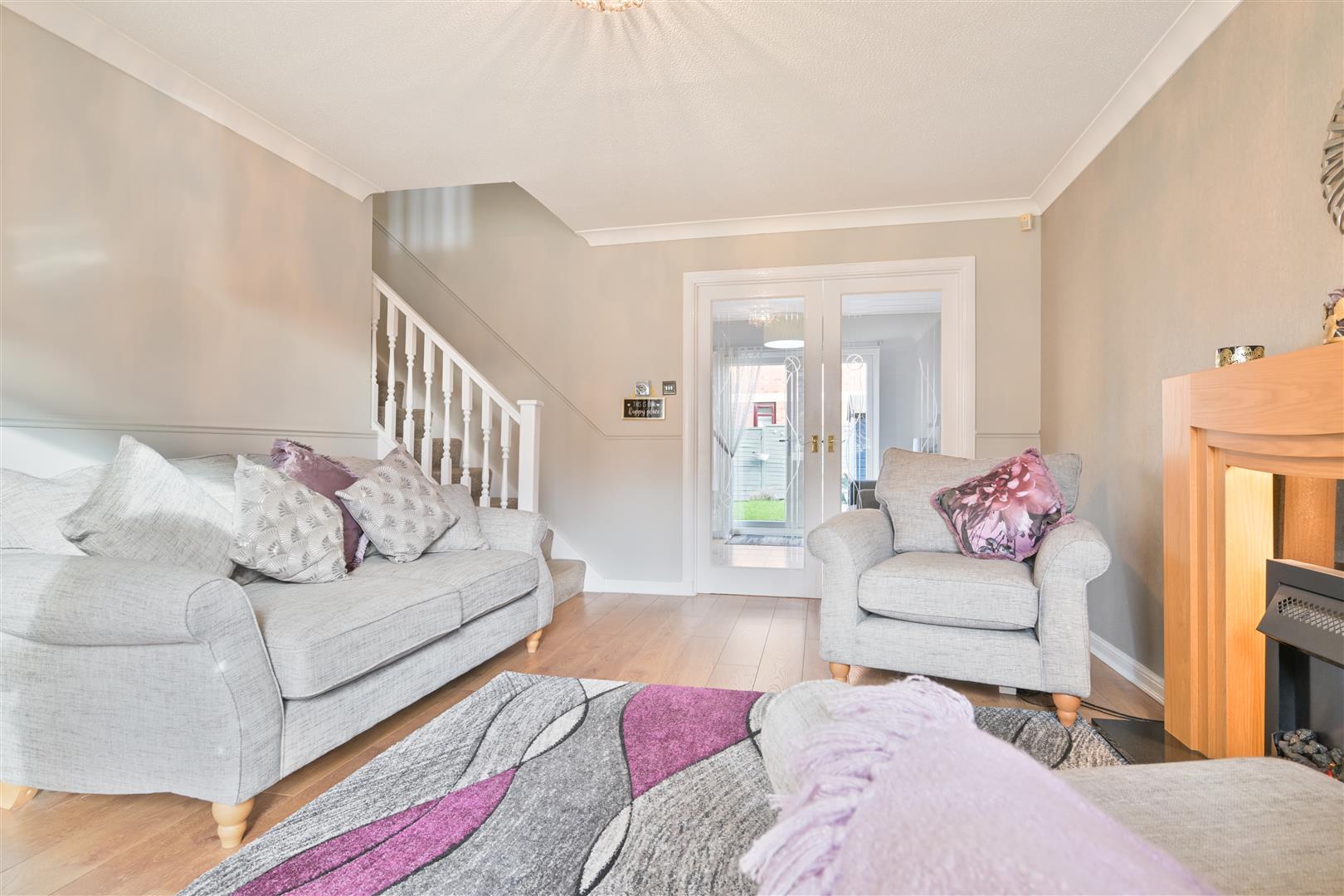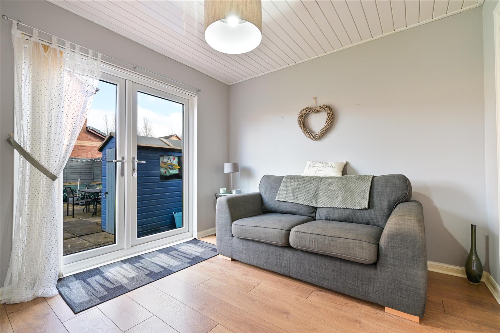 Upon entering, you are welcomed into an entrance vestibule with laminate flooring, leading through to a bright, open-plan, front facing lounge featuring an attractive focal fire surround. The lounge flows seamlessly through internal glass doors into a generously sized kitchen/dining area, fitted with floor units and a freestanding range-style cooker. French doors open directly onto the rear garden, creating an excellent space for everyday living and entertaining.