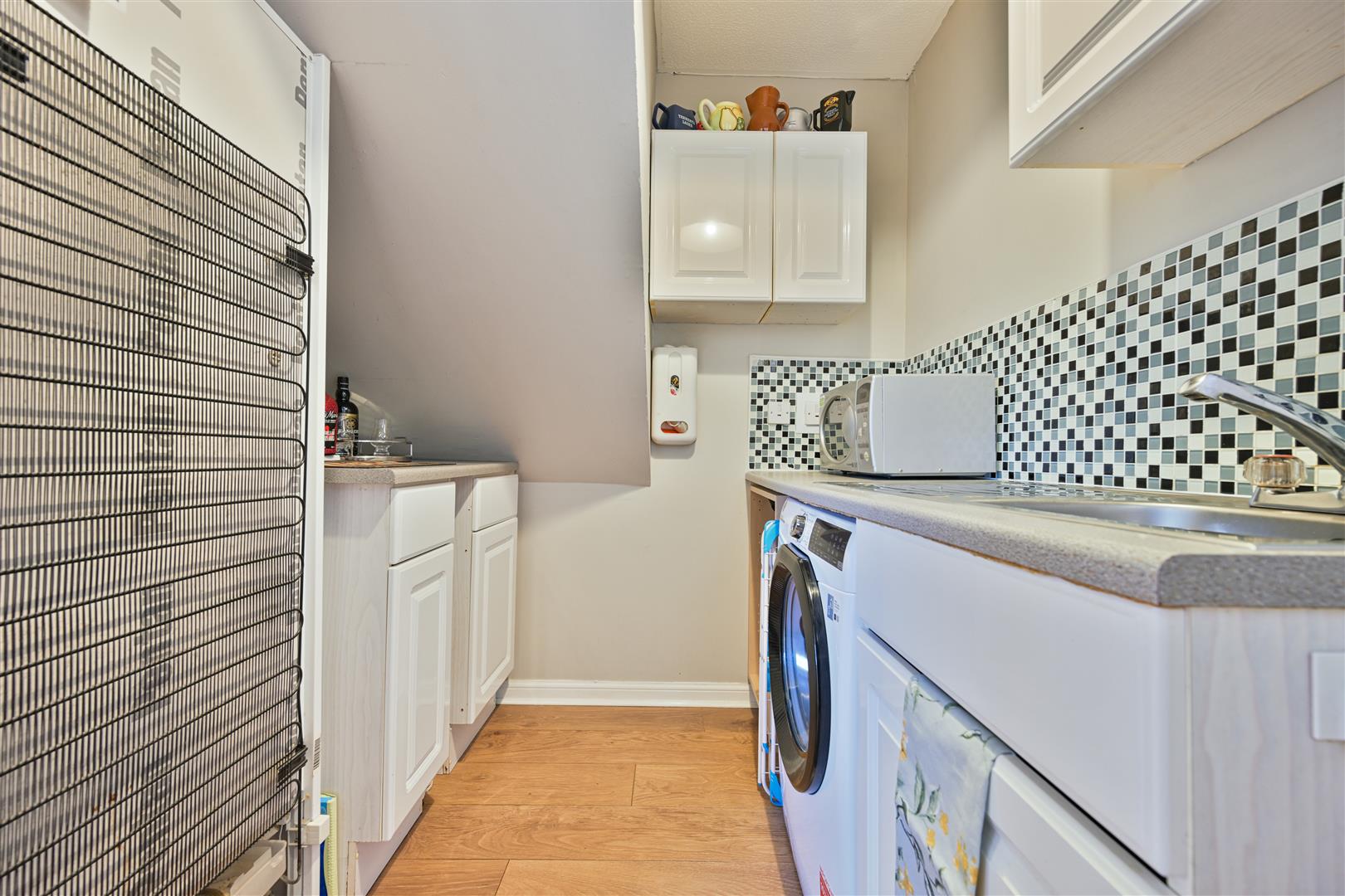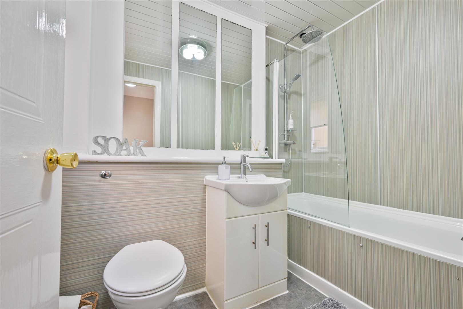 On the upper level, the hallway leads to three well proportioned bedrooms, all with laminate flooring and ample space for furniture. The master bedroom benefits from a lovely en-suite shower room, while the remaining bedrooms are served by a lovely family bathroom featuring a back-to-wall WC and vanity sink combination, along with a bath and overhead shower, finished with stylish wet-wall panelling.
