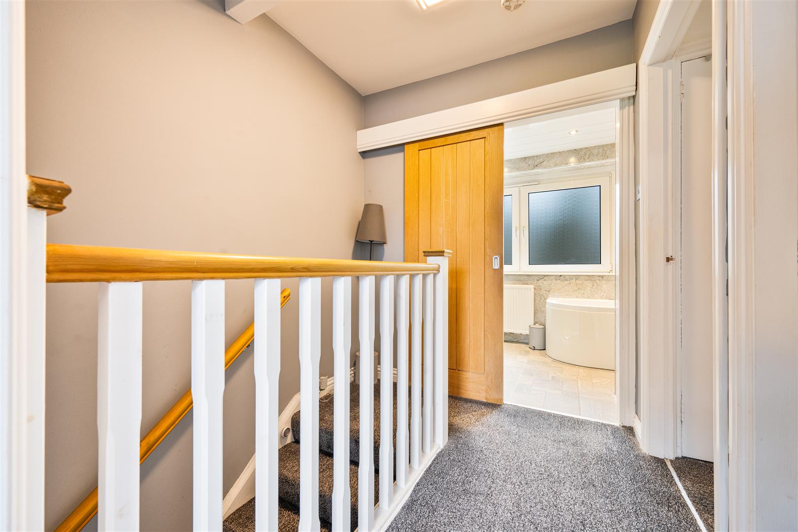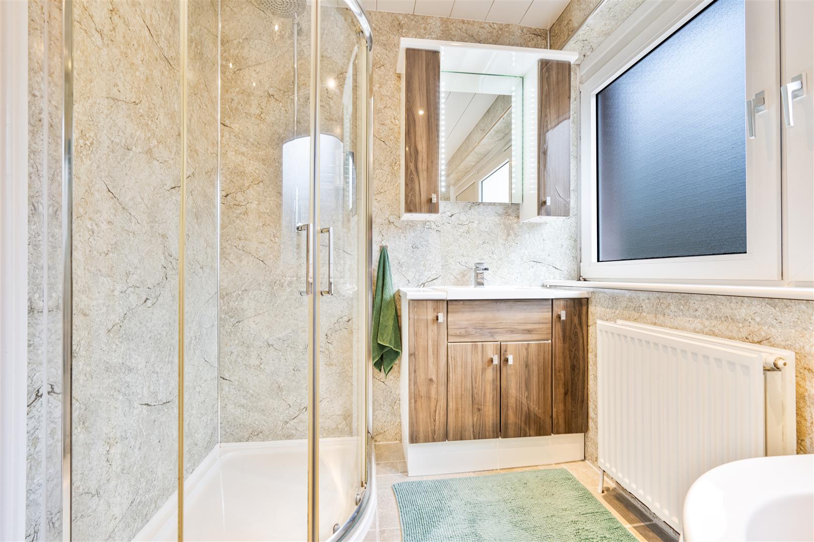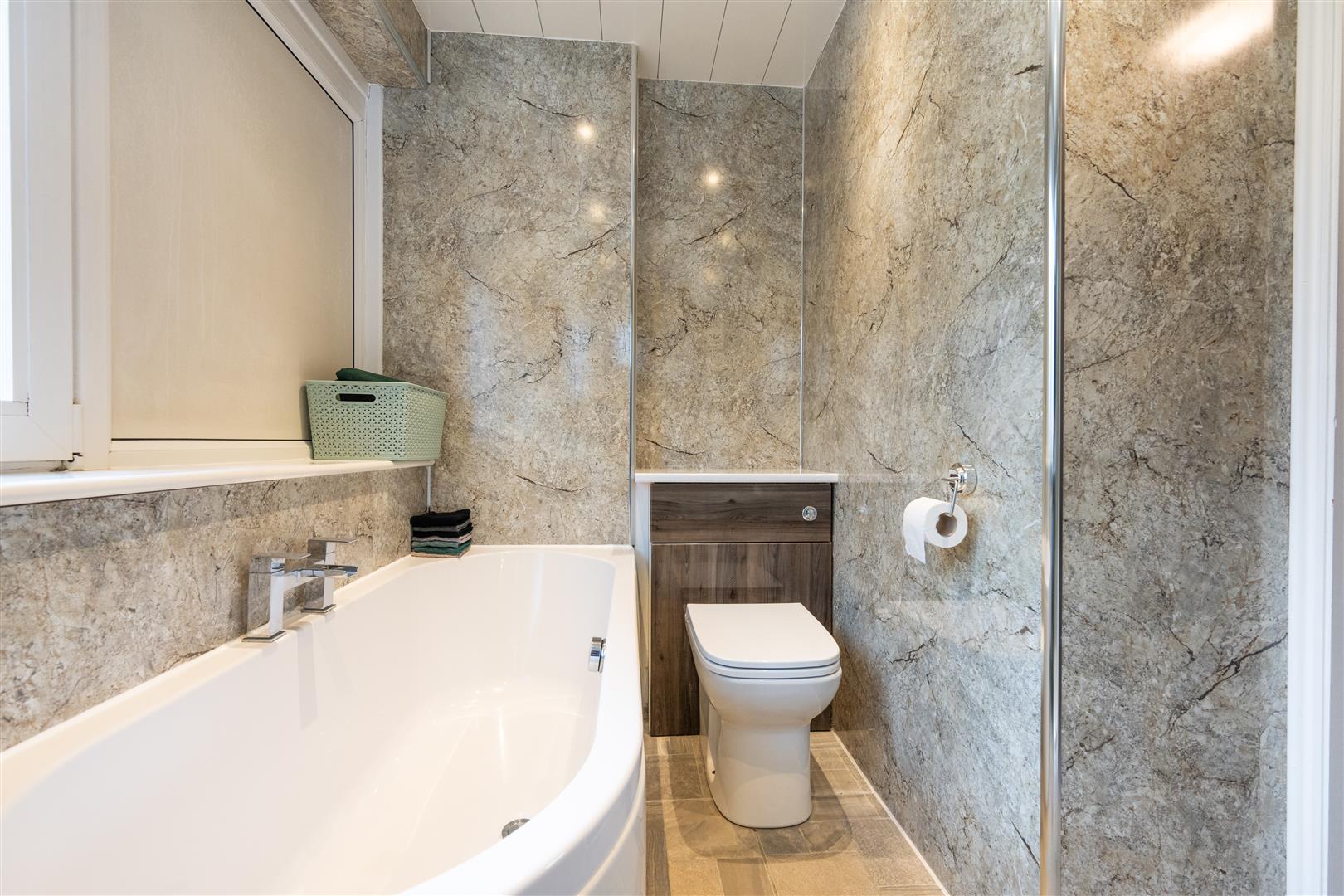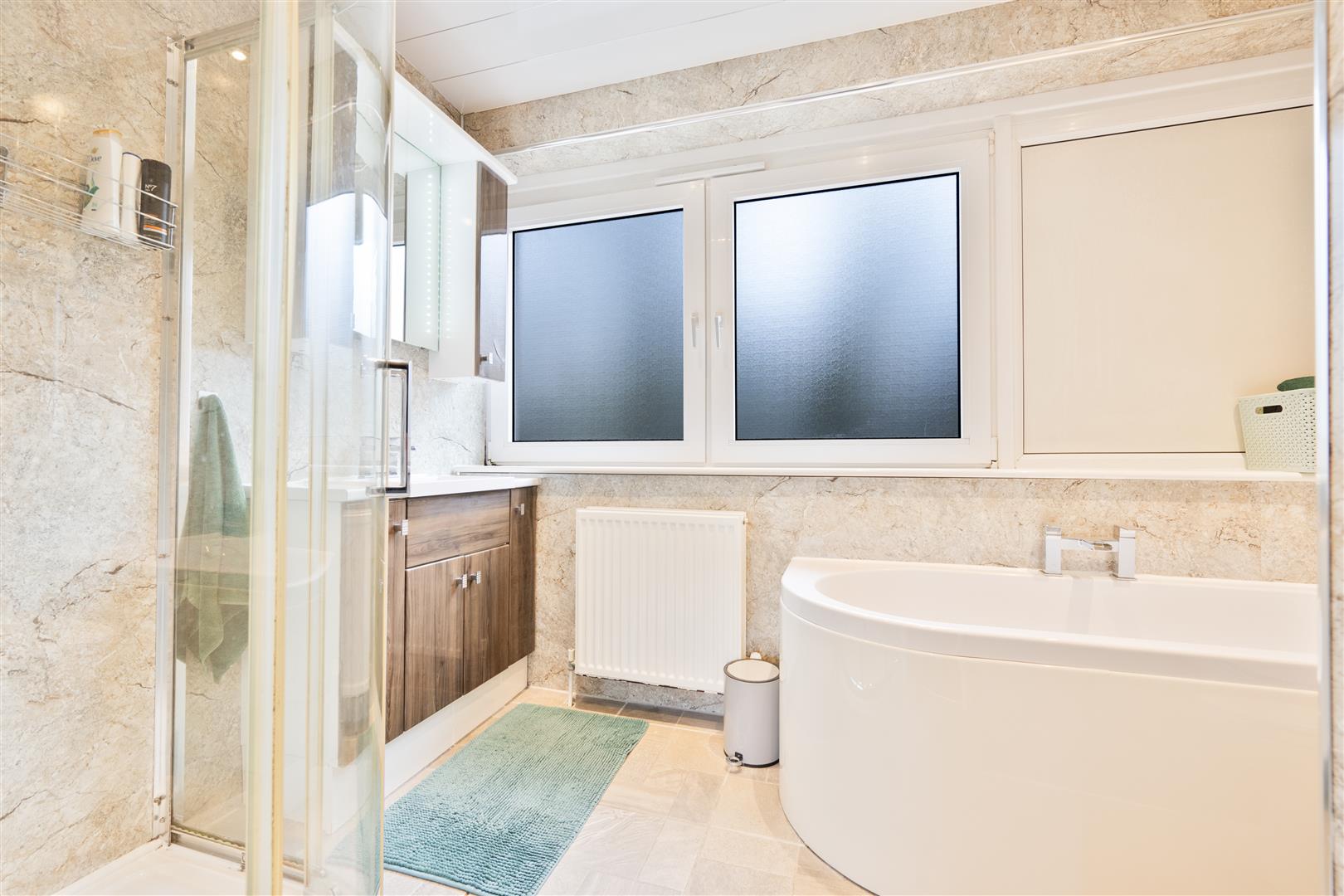 Upstairs, the property offers three well proportioned bedrooms, all carpeted throughout and providing ample space for storage. Completing this floor is a contemporary four-piece family bathroom comprising a back-to-wall WC, vanity sink unit, bath, and separate shower enclosure, finished with stylish wet-wall panelling.