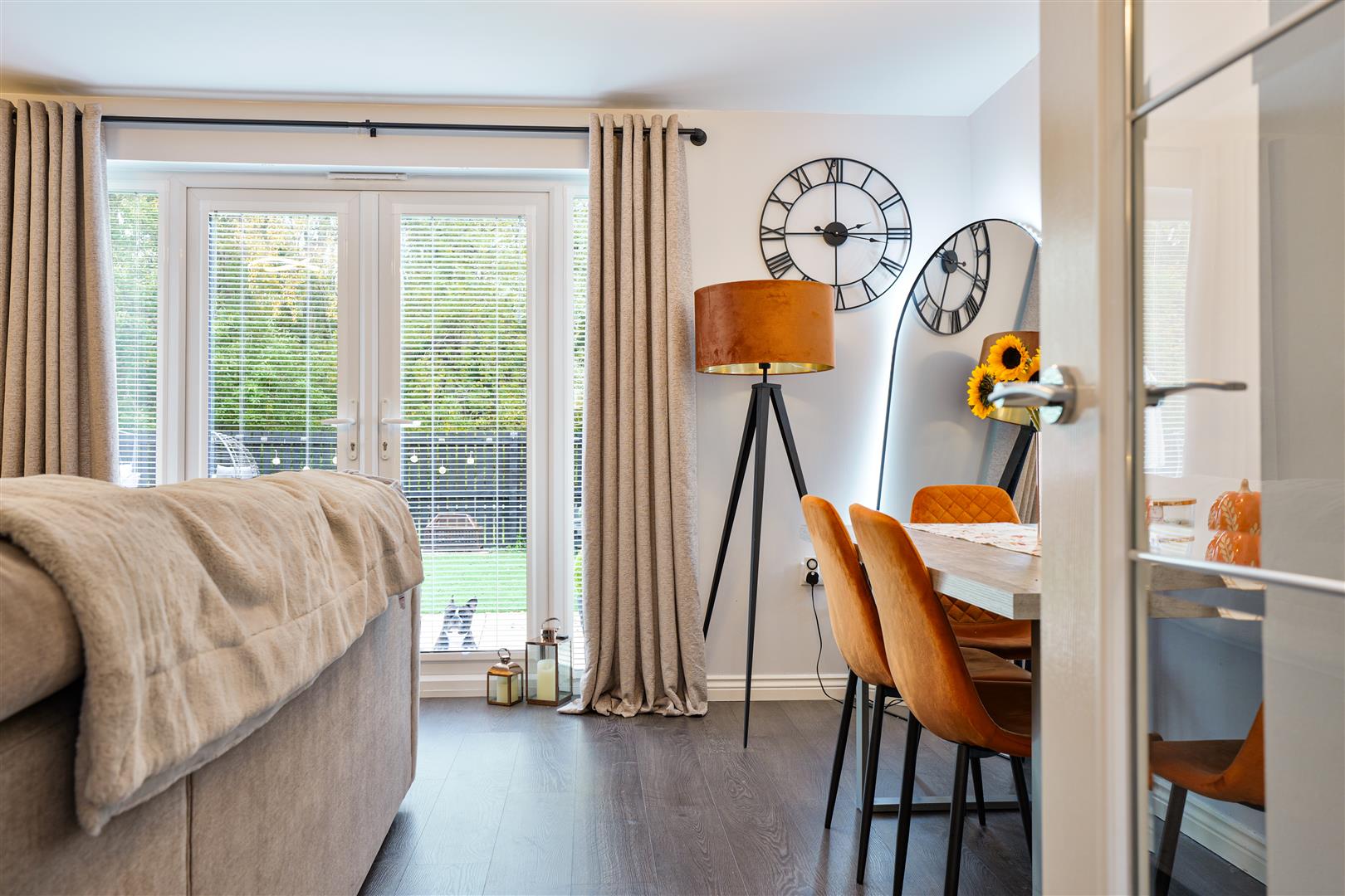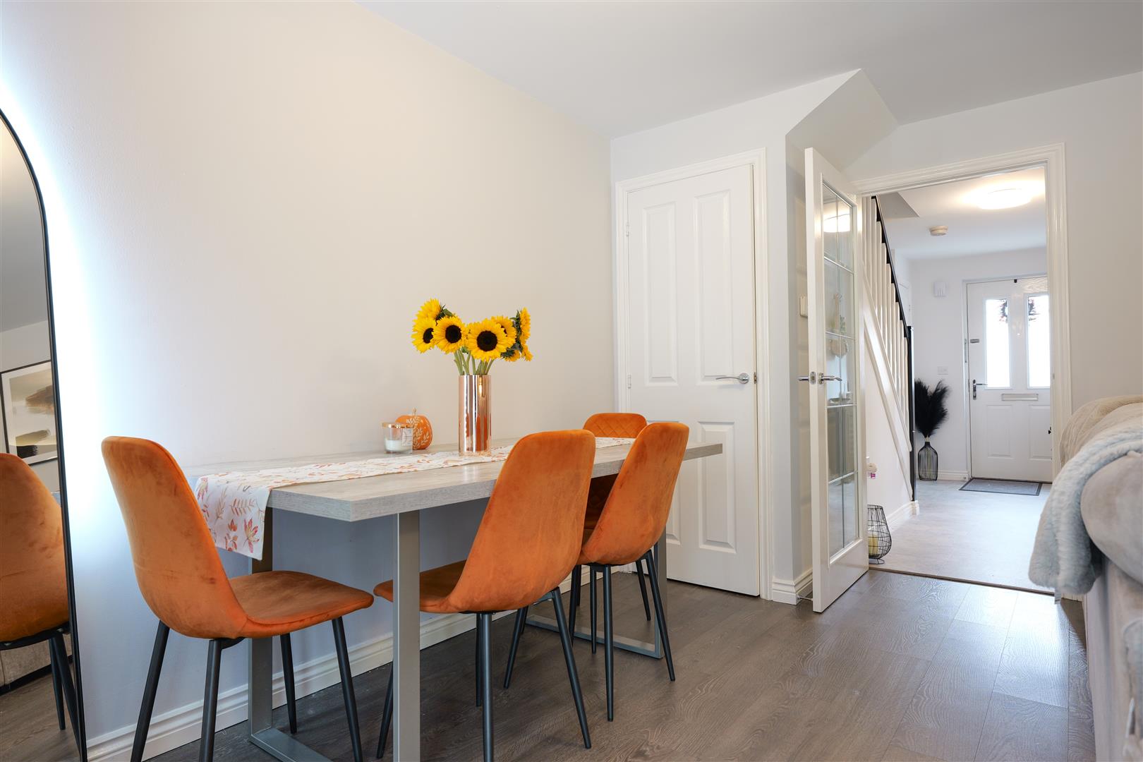 Step inside to a bright hallway leading to the spacious, beautifully decorated living and dining area featuring elegant wall panelling, statement lighting and French doors leading out to the private rear garden. The modern kitchen is bright and well designed, while a convenient downstairs WC adds to the practicality of this stylish home.