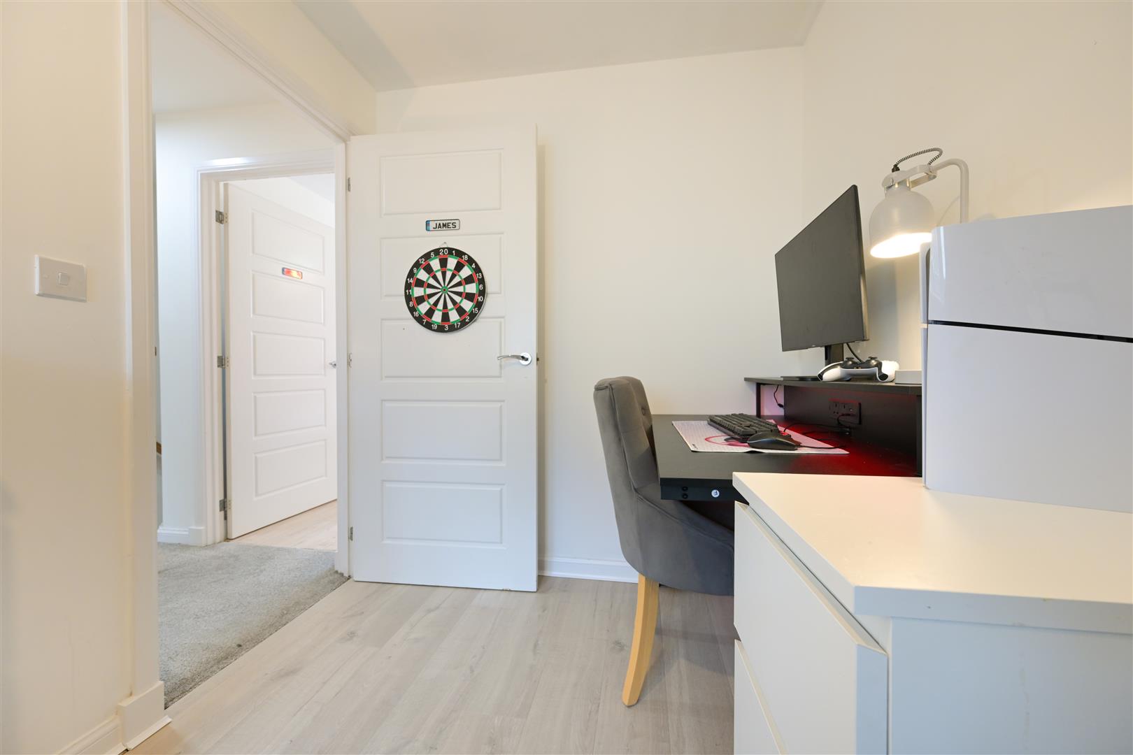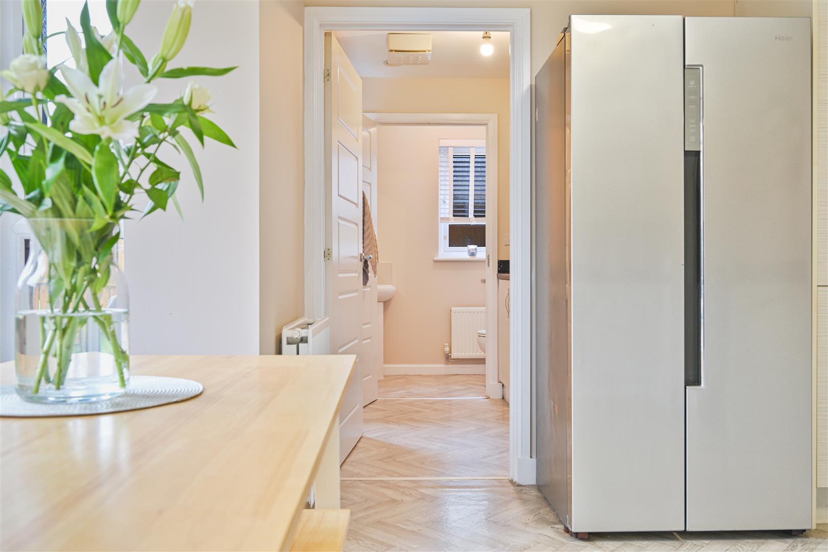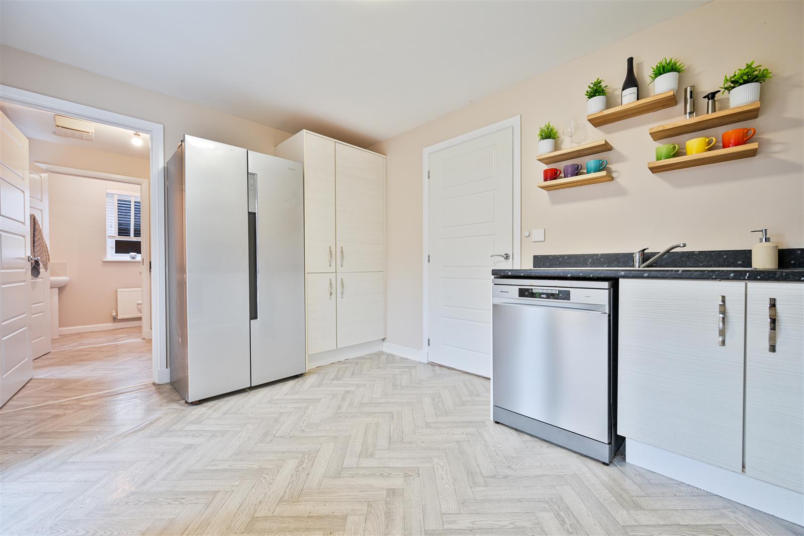 Upstairs, there are three spacious bedrooms, and built in storage throughout. The impressive principal bedroom enjoys its own stylish ensuite shower room, offering a private retreat. The remaining bedrooms are served by a sleek family bathroom, finished with contemporary tiling and quality fittings.