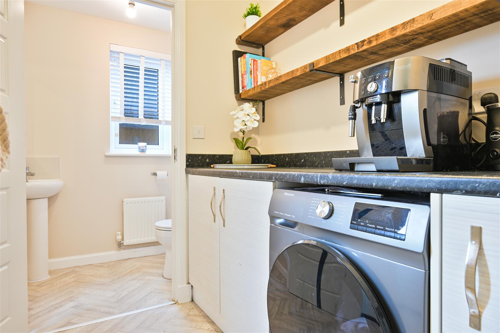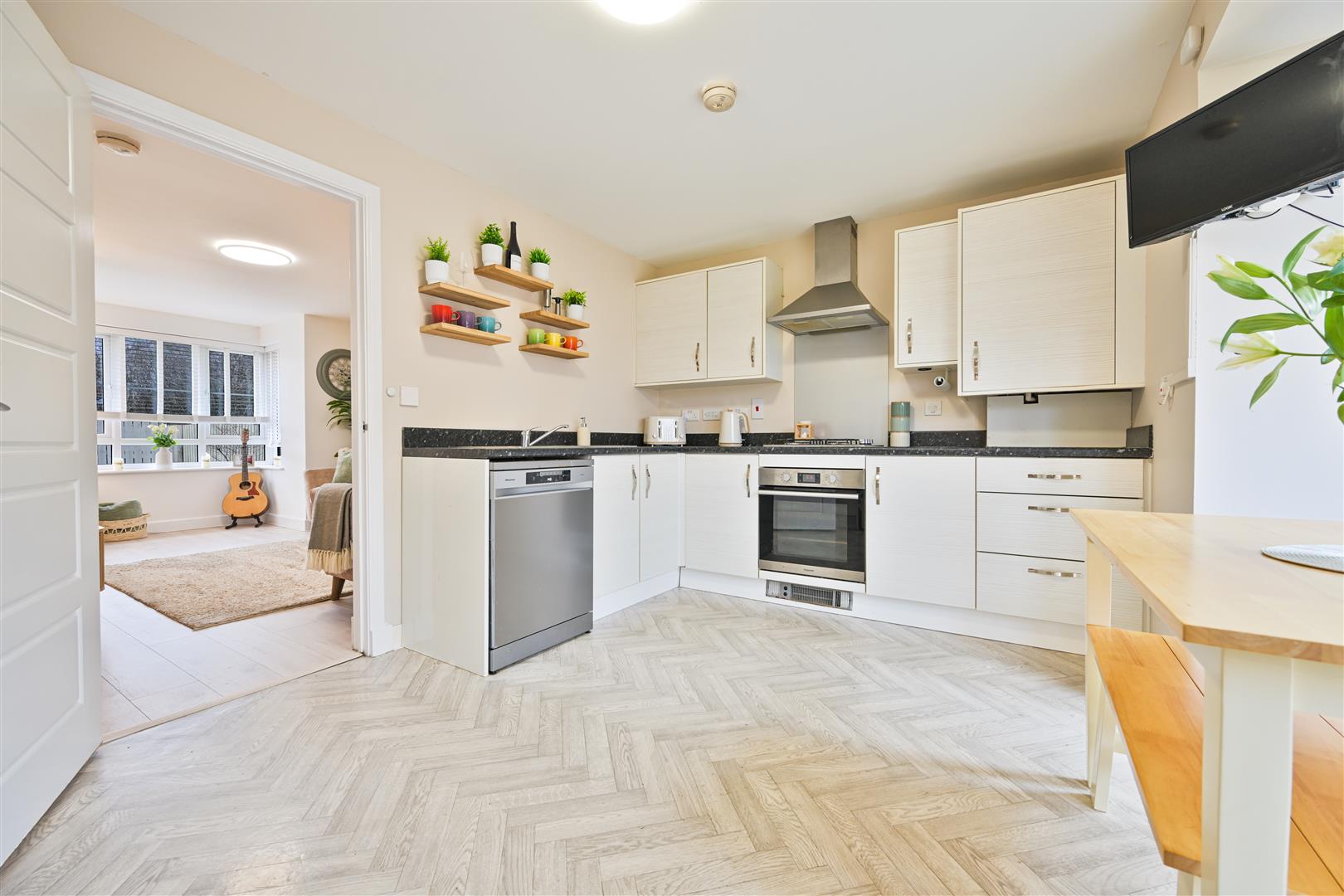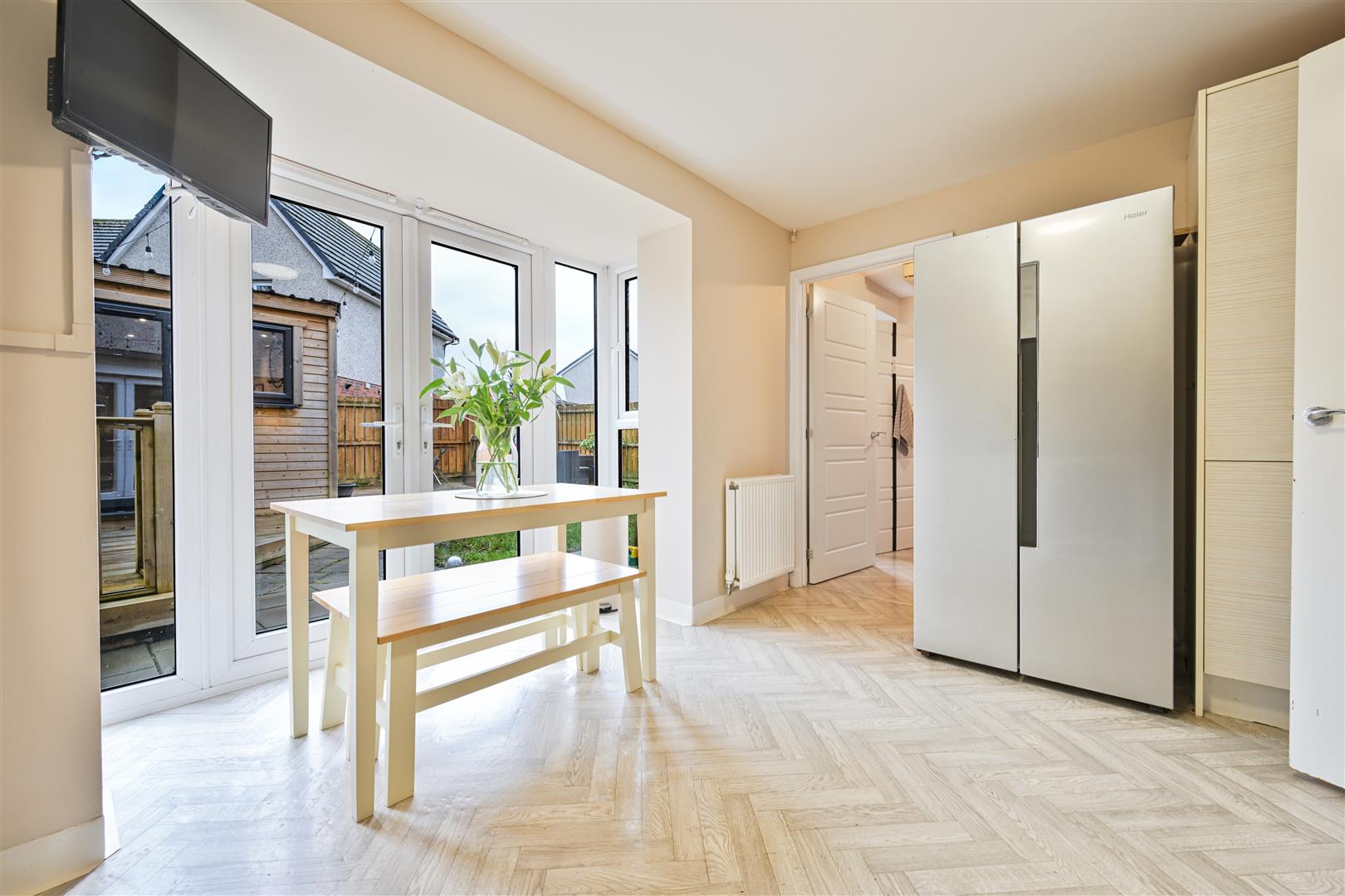 Upstairs, there are three spacious bedrooms, and built in storage throughout. The impressive principal bedroom enjoys its own stylish ensuite shower room, offering a private retreat. The remaining bedrooms are served by a sleek family bathroom, finished with contemporary tiling and quality fittings.