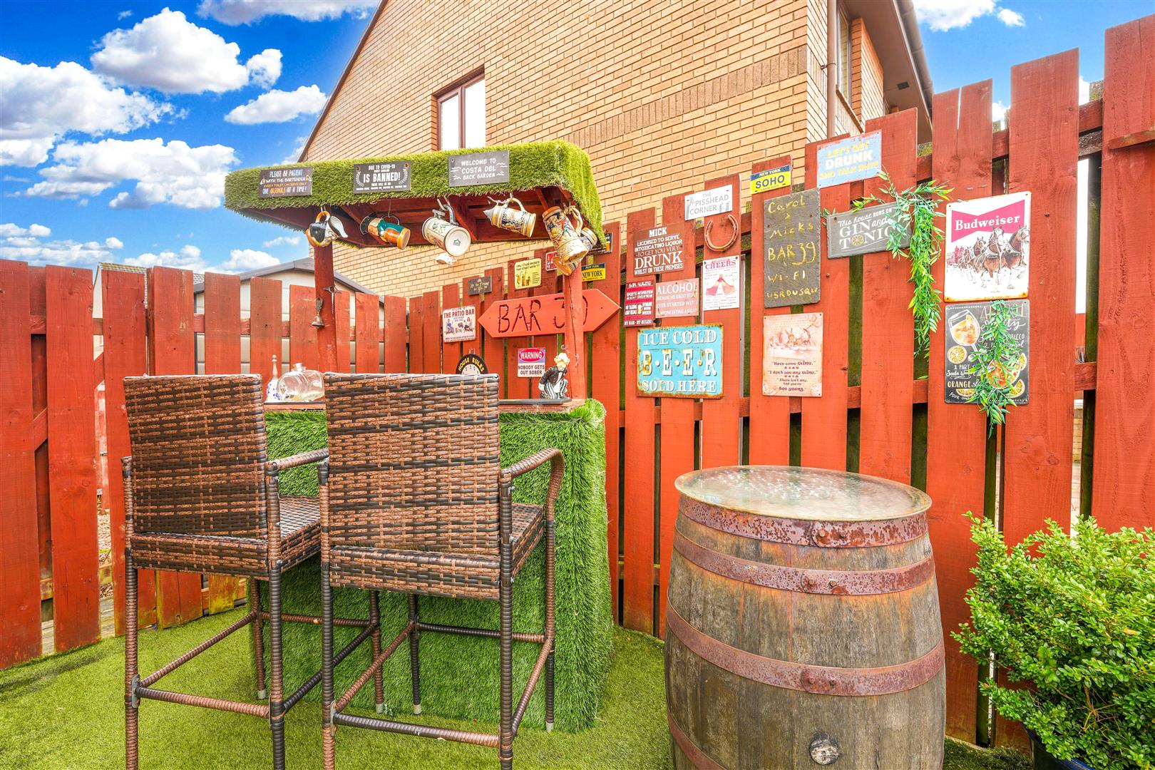 The outdoor space is a real showpiece. Designed for both relaxation and entertaining, the low-maintenance garden features high-quality artificial grass, a dedicated bar area, and a raised stone seating area which is perfect for summer gatherings or simply enjoying a quiet evening outdoors.