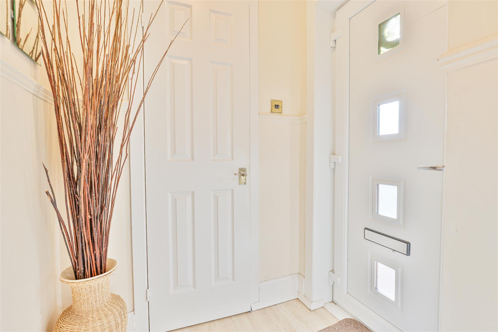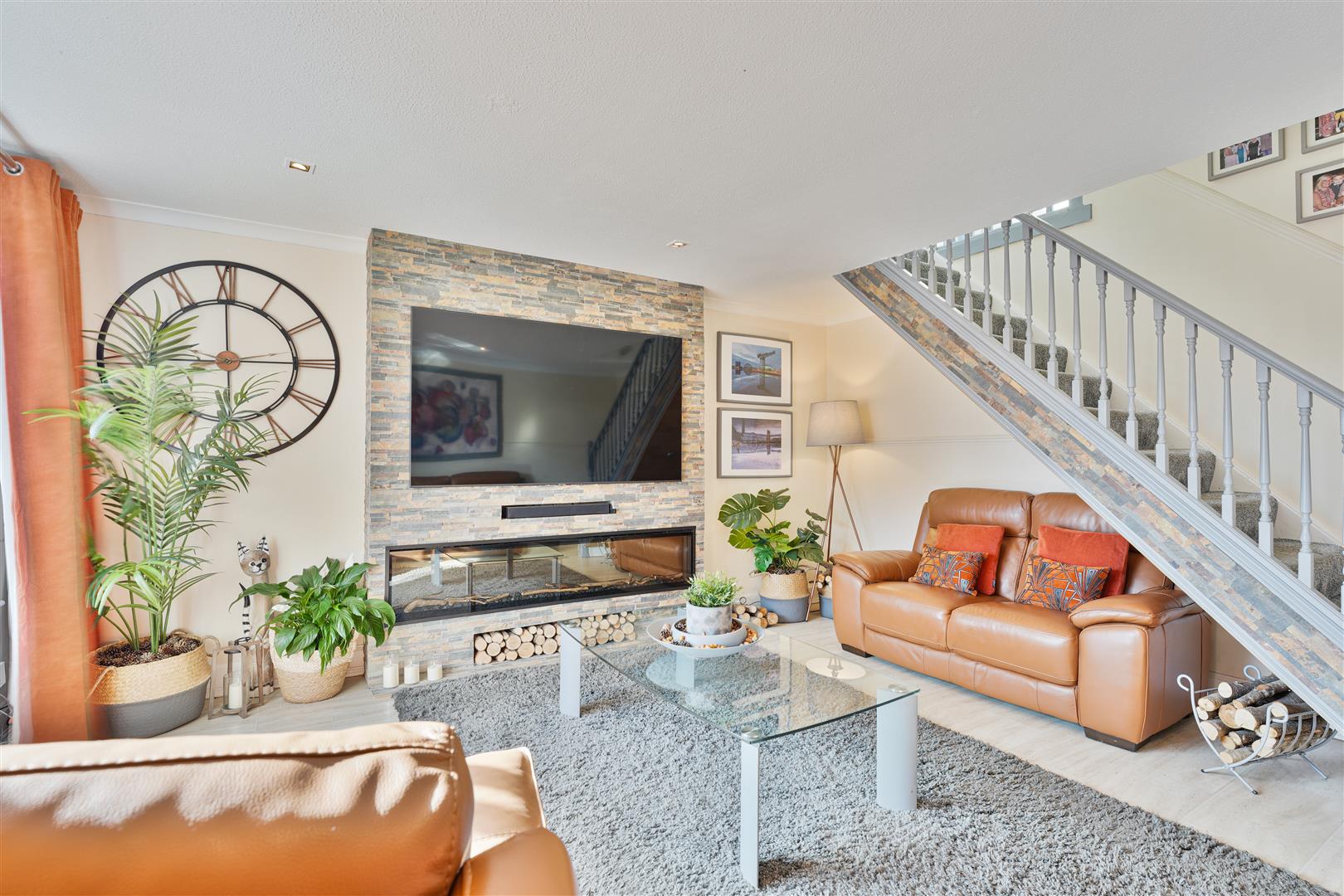 The entrance vestibule leads into a bright and welcoming living room, where a stunning feature wall and contemporary fireplace create a stylish focal point. Large windows flood the space with natural light, making it a warm and inviting area to relax with family or entertain guests. At the heart of the home is the spacious fitted kitchen, thoughtfully designed with integrated appliances and ample storage. The open-plan layout includes a generous dining area, perfect for family meals or hosting dinner with friends. French doors lead directly to the rear garden, seamlessly connecting indoor and outdoor living.