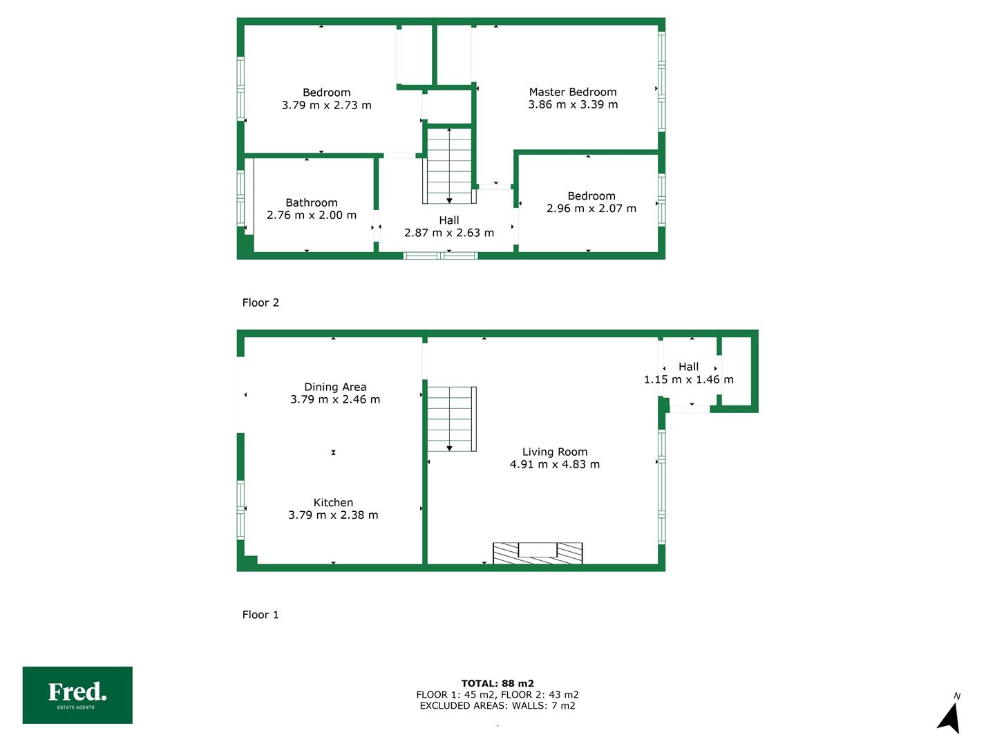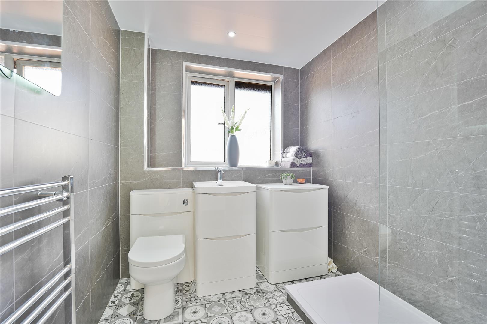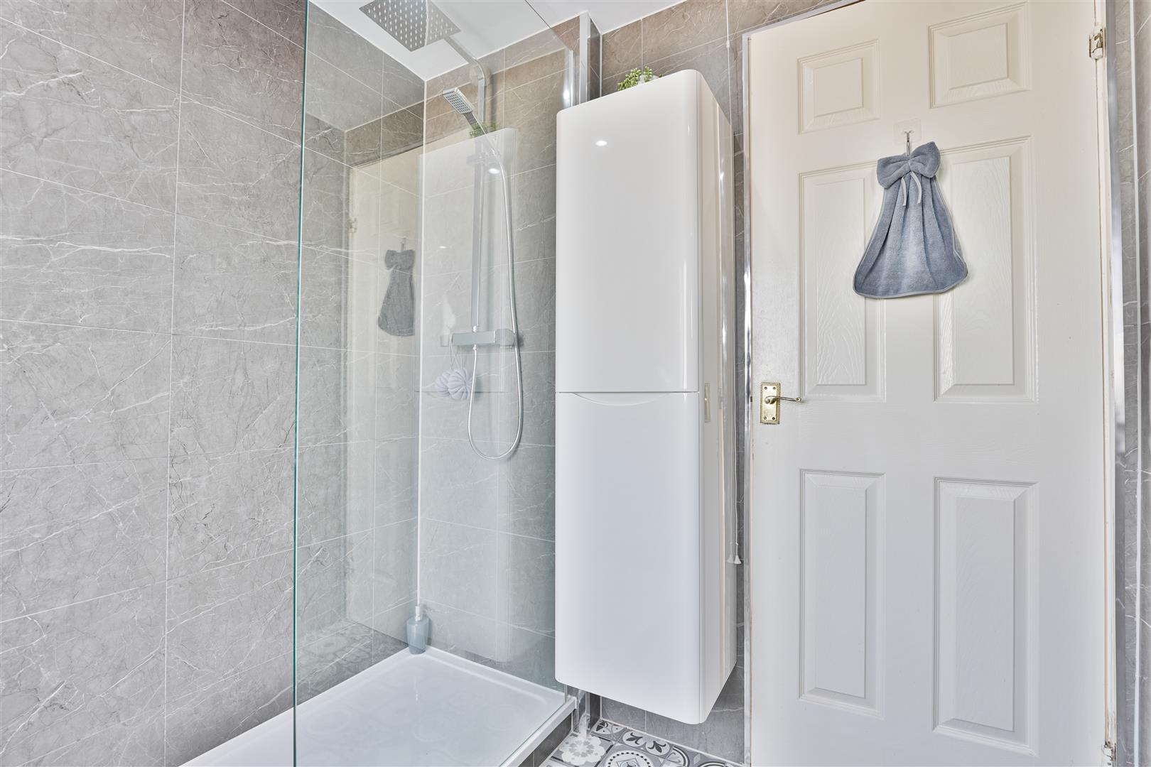 Upstairs, the property offers two well-proportioned double bedrooms alongside a third bedroom, ideal as a child’s room, home office, or guest space. The shower room is a true highlight, finished to a luxury standard with full tiling, decorative floor tiles, and a sleek walk-in shower.