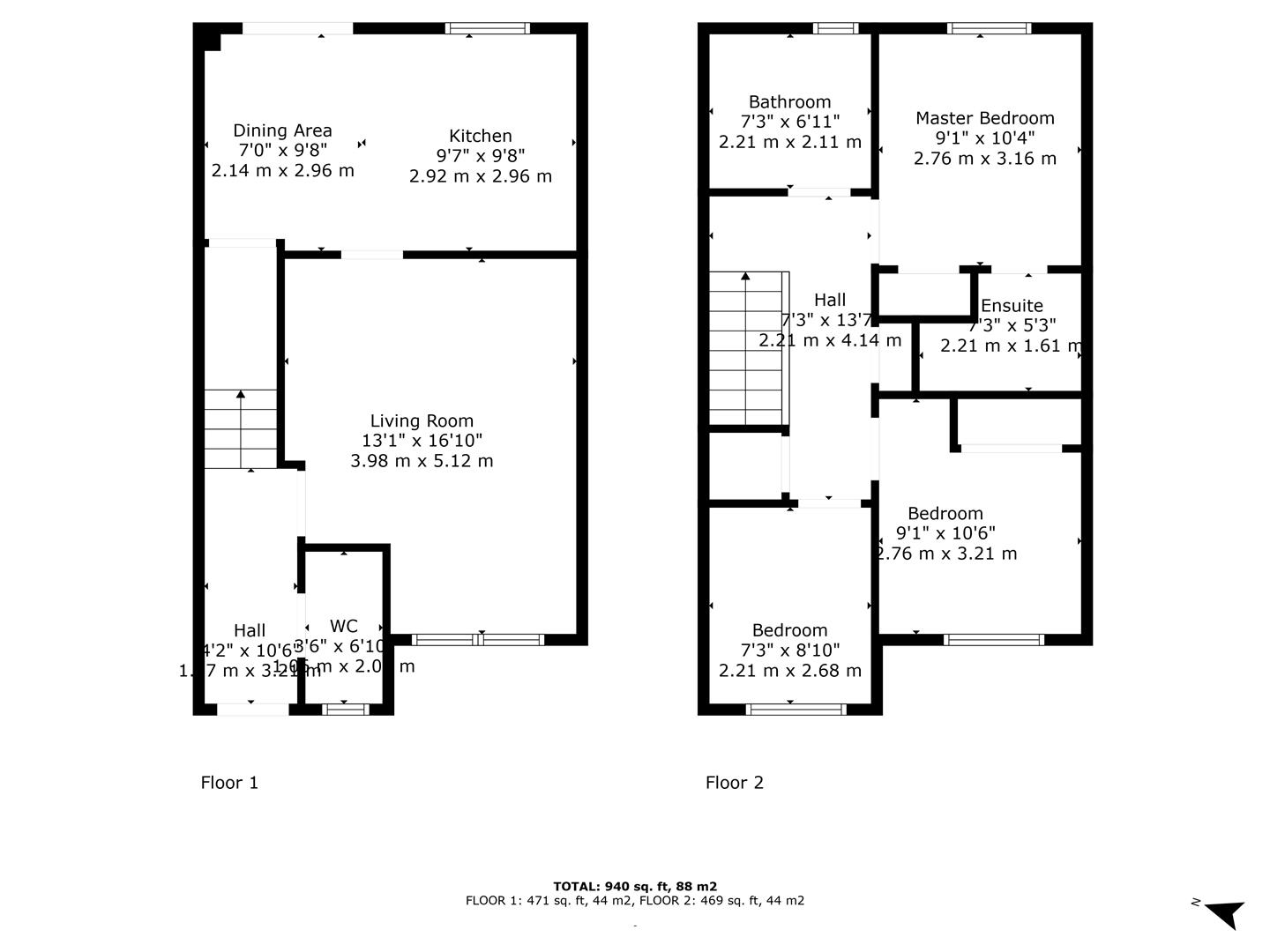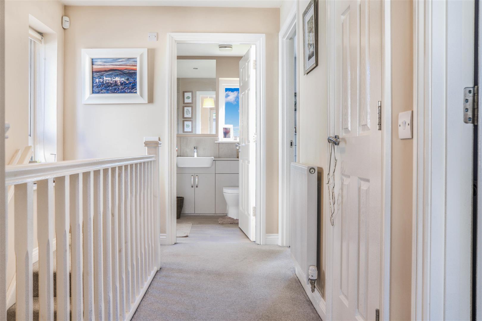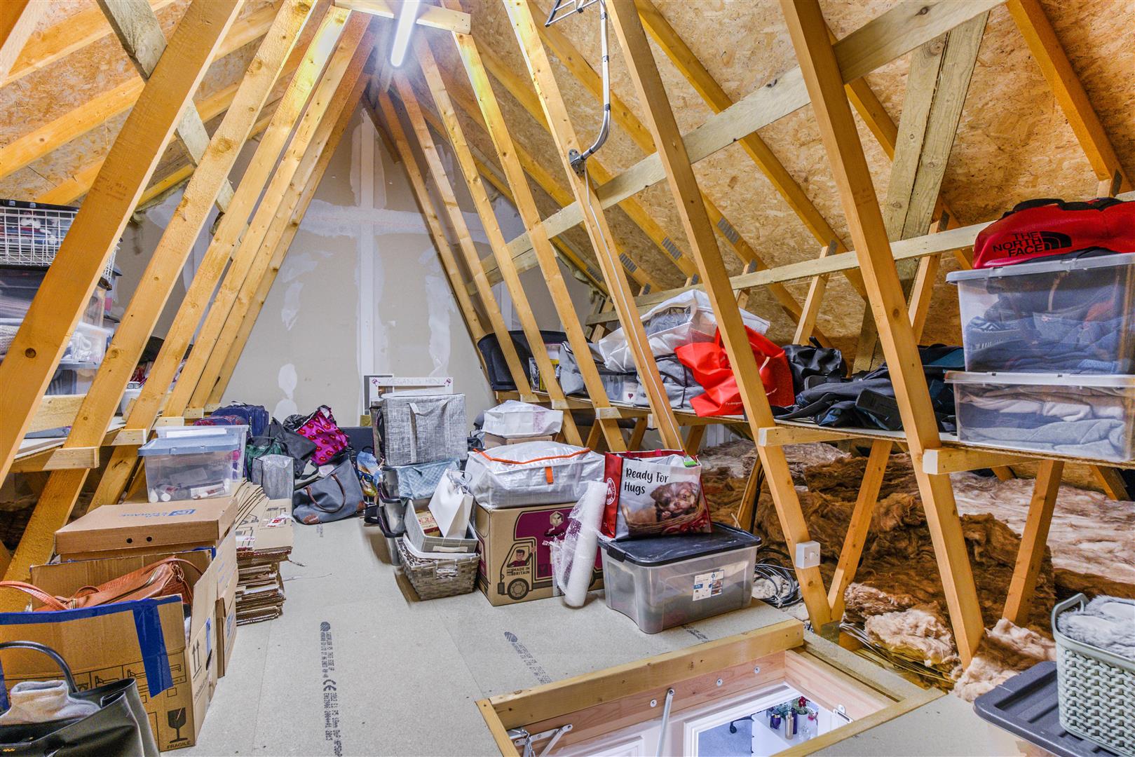 Upstairs, a spacious landing leads to three generously sized, fully carpeted bedrooms. Two bedrooms include fitted wardrobes, while the master boasts a stylish en-suite shower room. The stunning family bathroom is partially tiled and features a modern back-to-wall WC/sink combination unit and a bath with overhead shower. For added practicality, a part-floored attic provides excellent storage and is easily accessible.