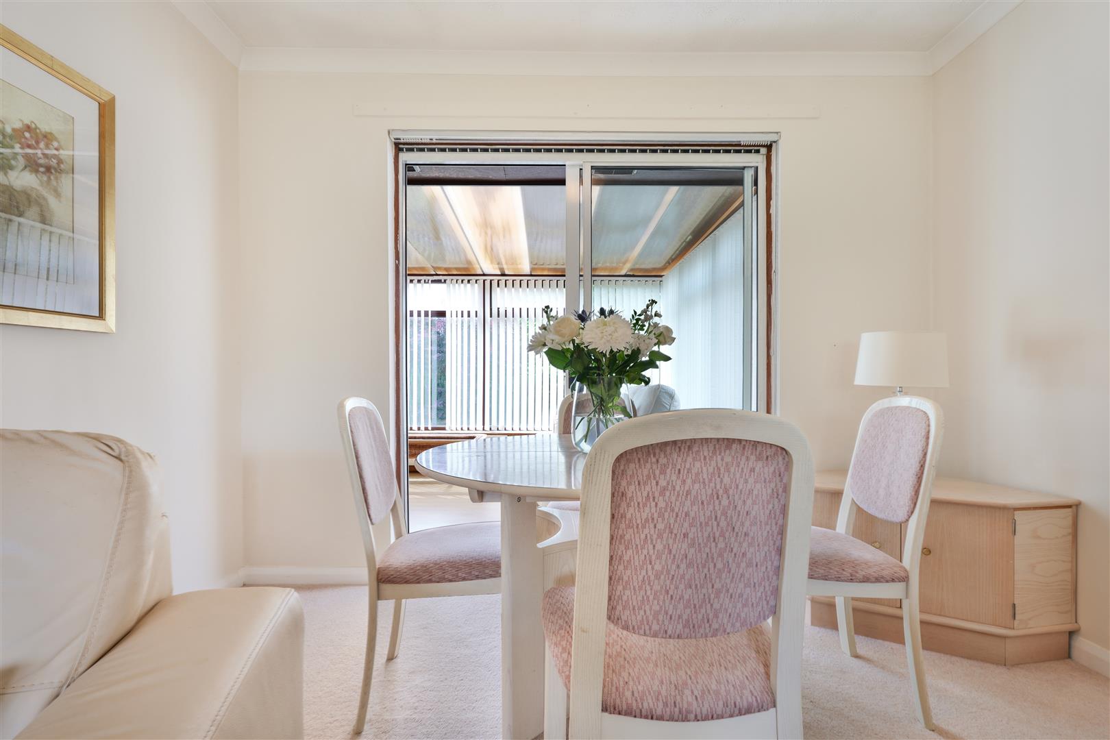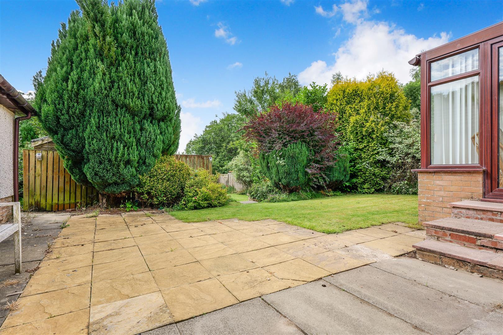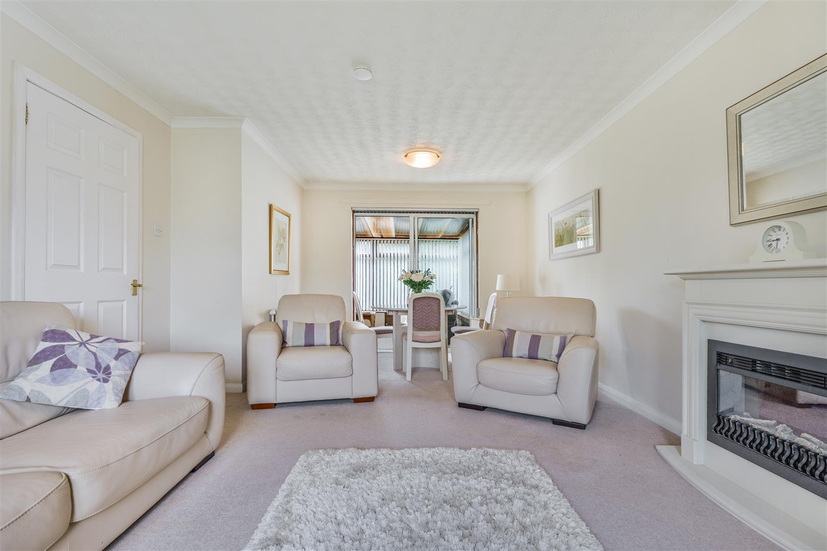 The home welcomes you with a bright and inviting entrance hallway, leading into a generously sized front-facing lounge and dining area. This light-filled space features carpeted flooring, a charming feature fireplace, and patio doors that open into a bright conservatory—ideal for enjoying views of the impressive rear garden. The conservatory overlooks a large, fully enclosed and mature rear garden, complete with established trees offering a high degree of privacy—perfect for outdoor relaxation or entertaining.