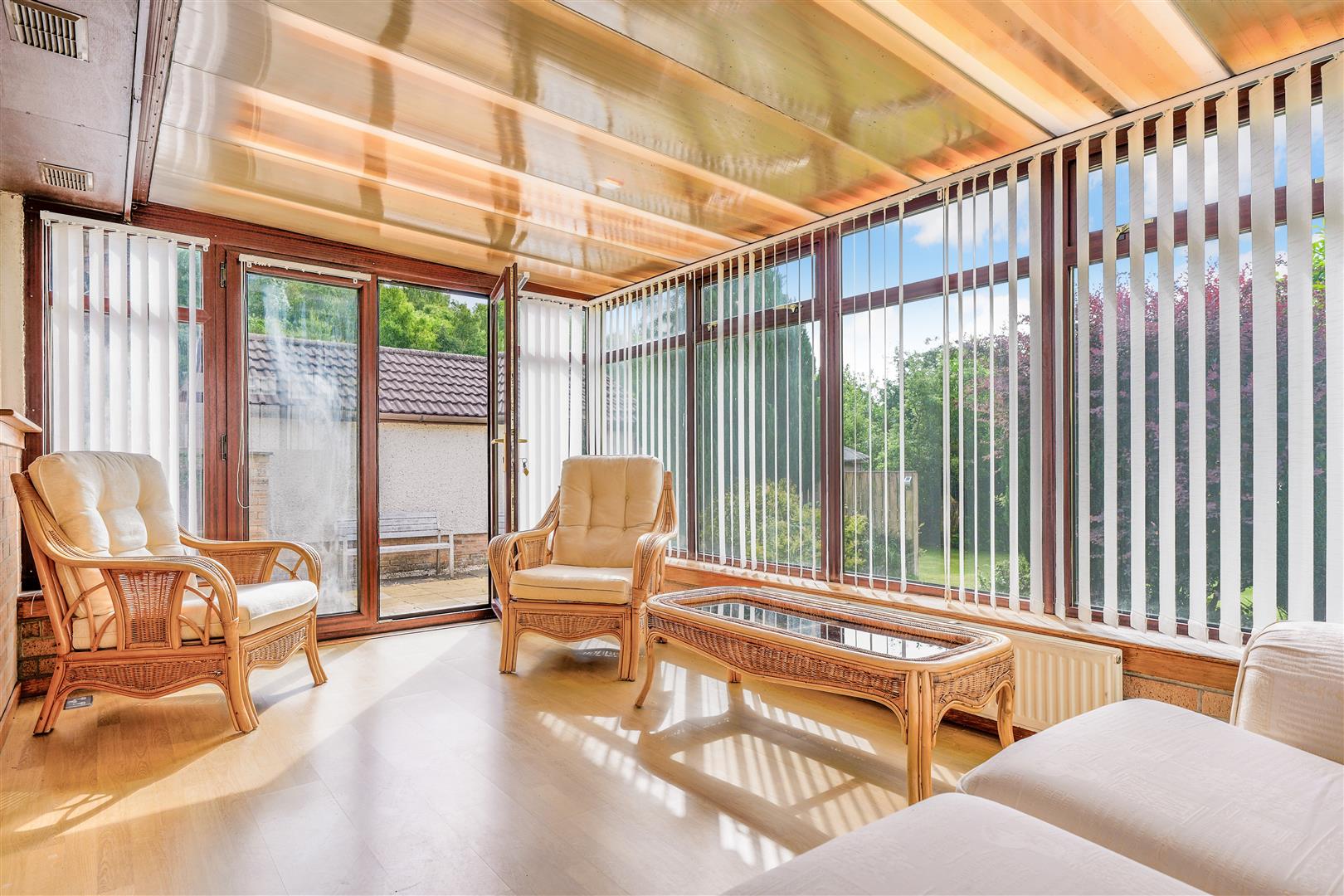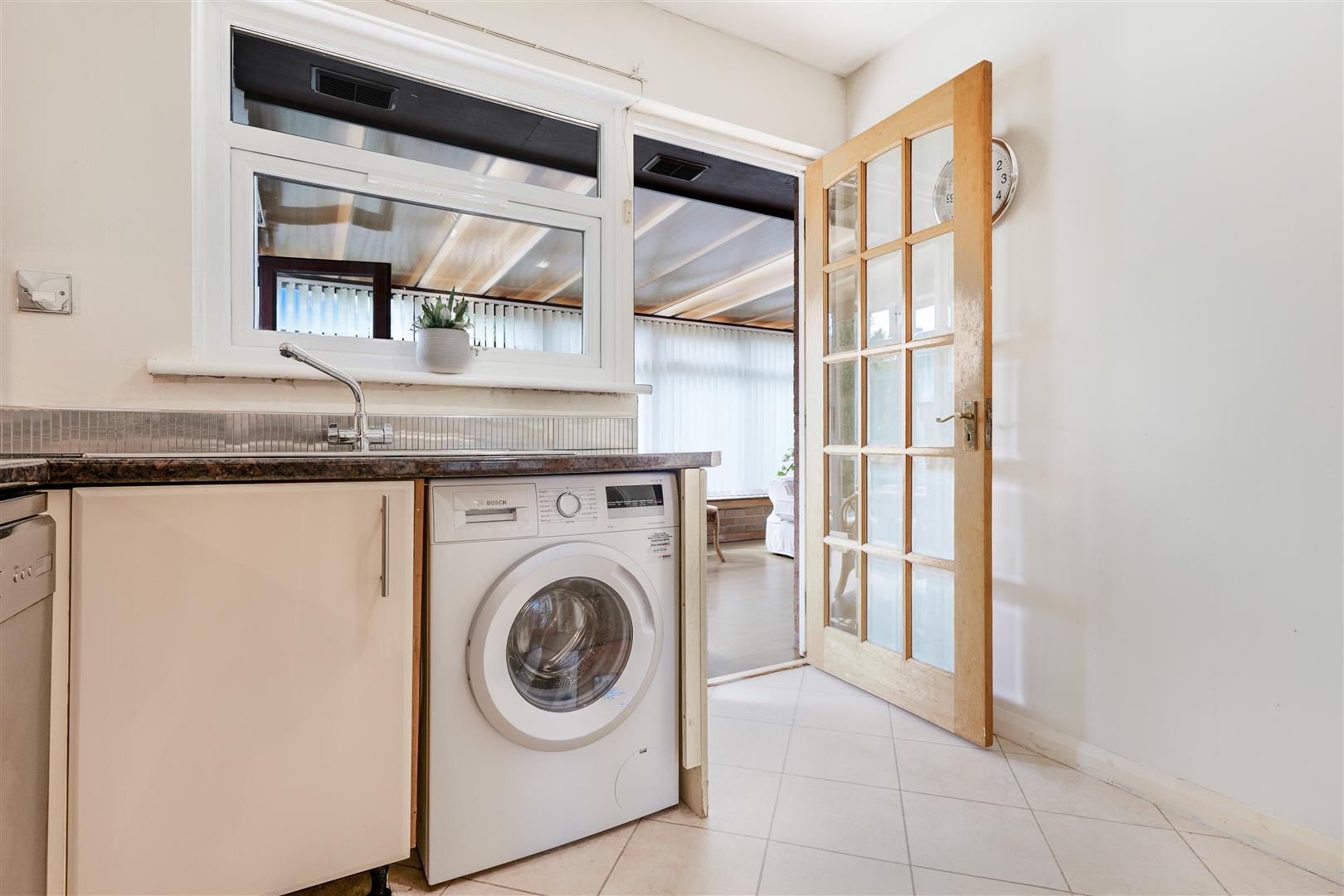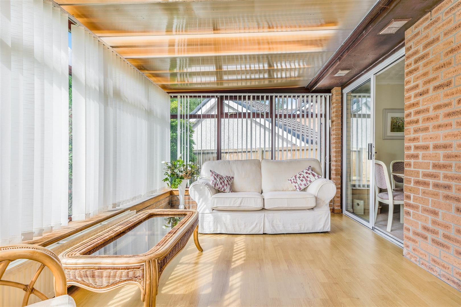 The home welcomes you with a bright and inviting entrance hallway, leading into a generously sized front-facing lounge and dining area. This light-filled space features carpeted flooring, a charming feature fireplace, and patio doors that open into a bright conservatory—ideal for enjoying views of the impressive rear garden. The conservatory overlooks a large, fully enclosed and mature rear garden, complete with established trees offering a high degree of privacy—perfect for outdoor relaxation or entertaining.