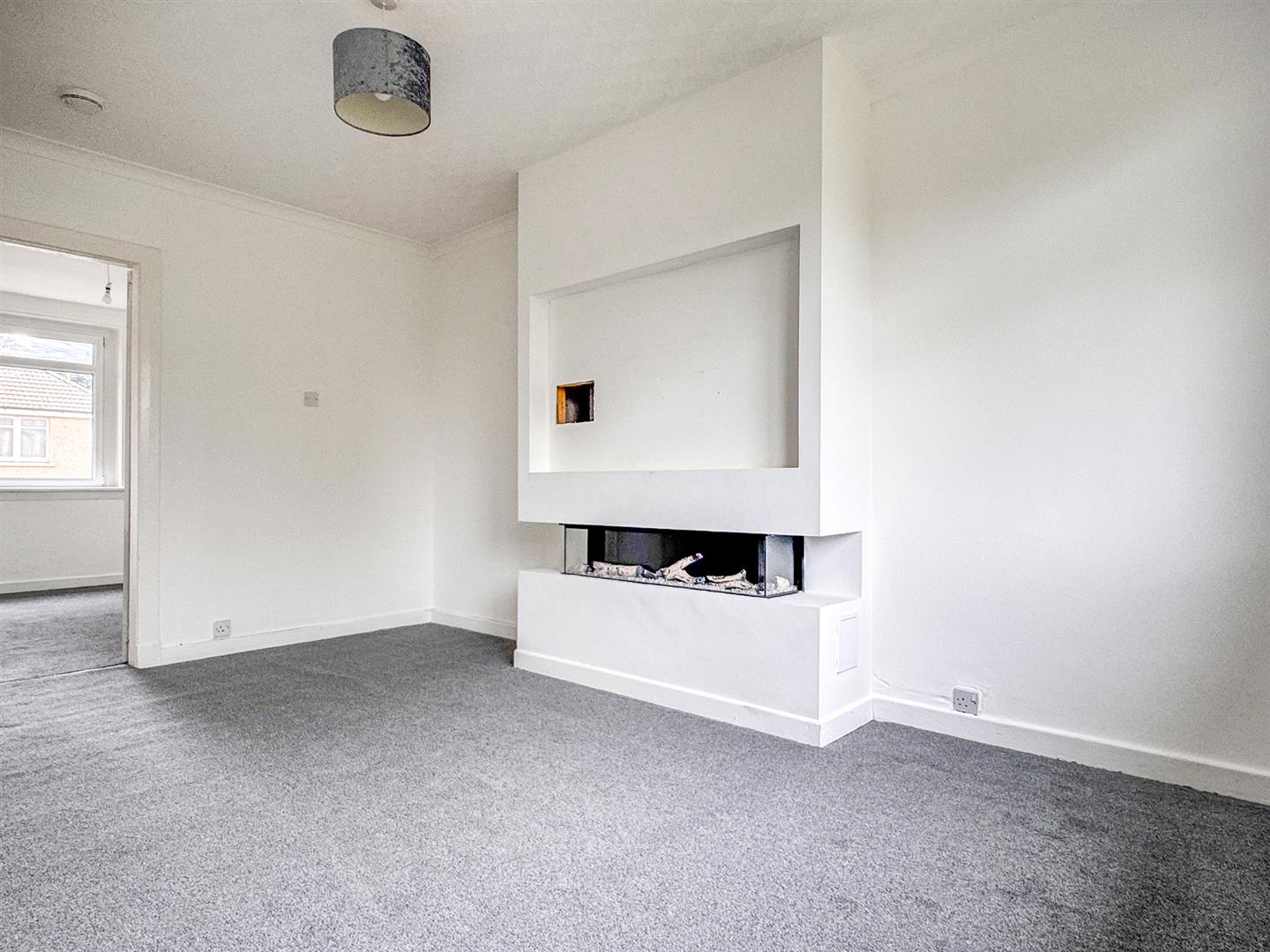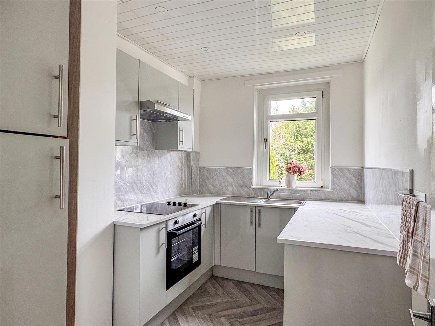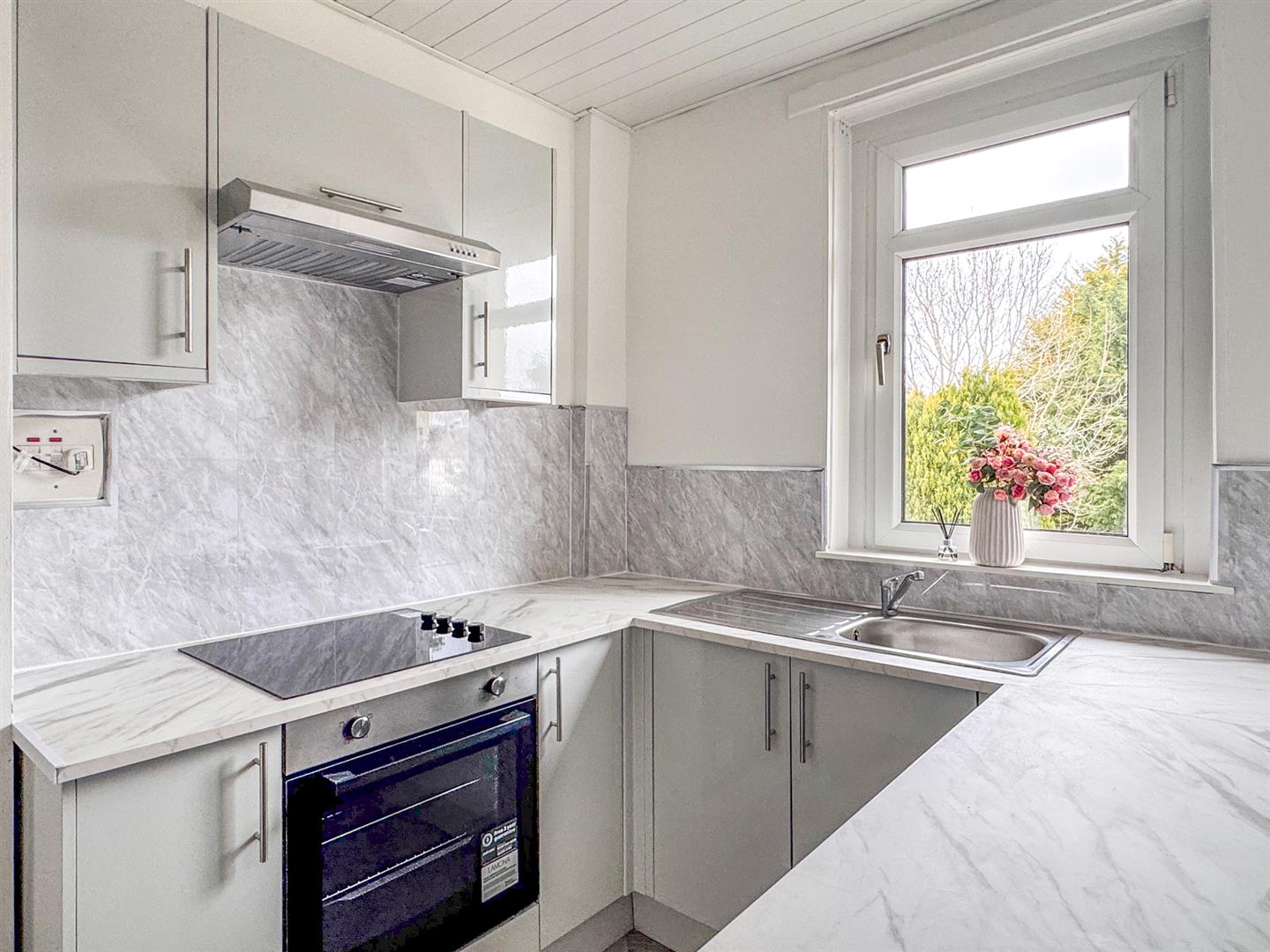 The modern fitted kitchen boasts a sleek marble-effect finish, providing both functionality and contemporary style. There are two generously sized bedrooms, both carpeted and decorated in neutral tones, offering comfortable and versatile living space. The bathroom is well appointed with a bath and shower over, catering to both convenience and comfort.