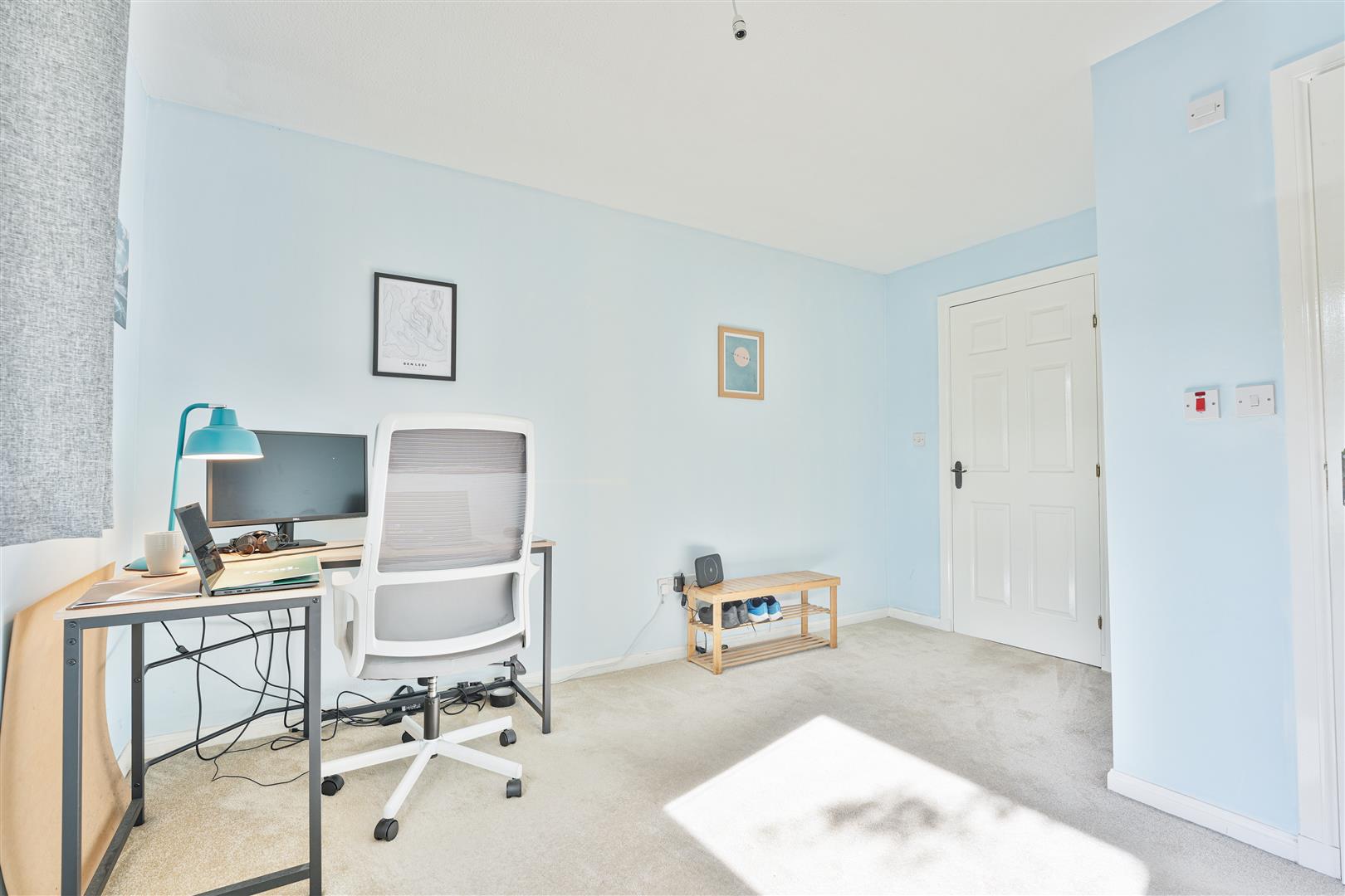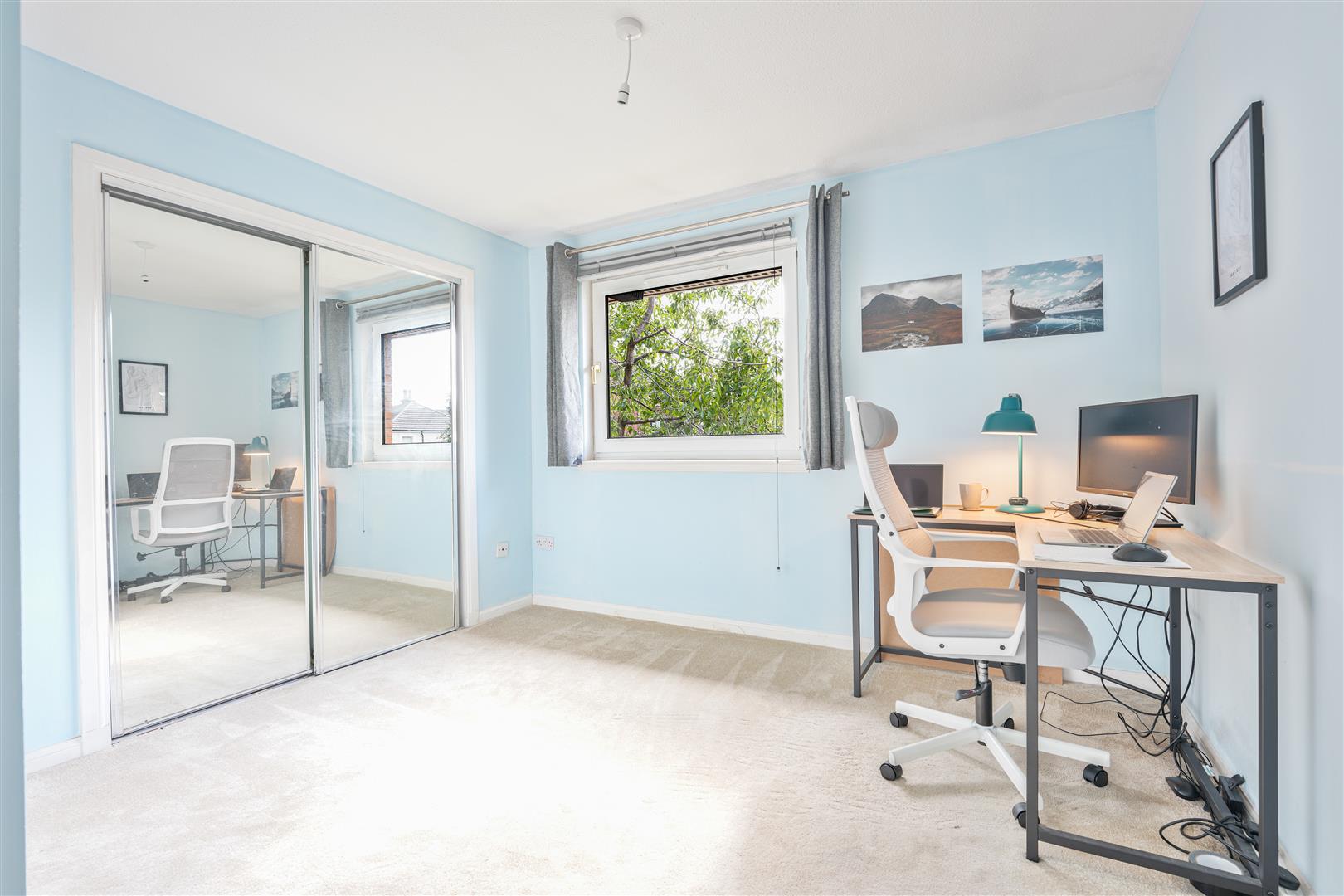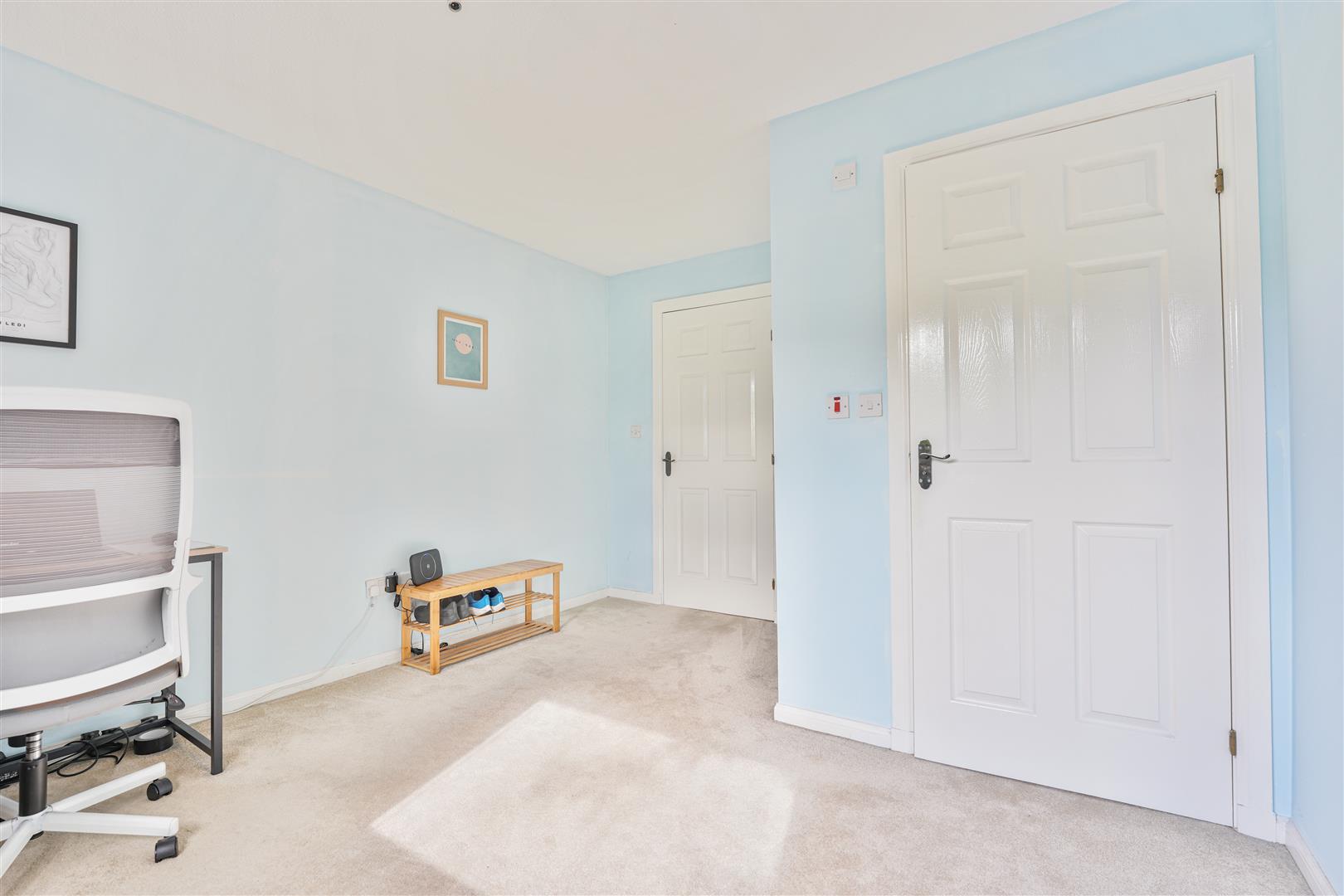 The primary bedroom benefits from an en-suite shower room with WC, wash hand basin, and electric shower enclosure, while the second bedroom offers flexibility as a guest room, home office, complete with mirrored fitted wardrobes. A modern family bathroom with bath, WC, and wash basin completes the accommodation.