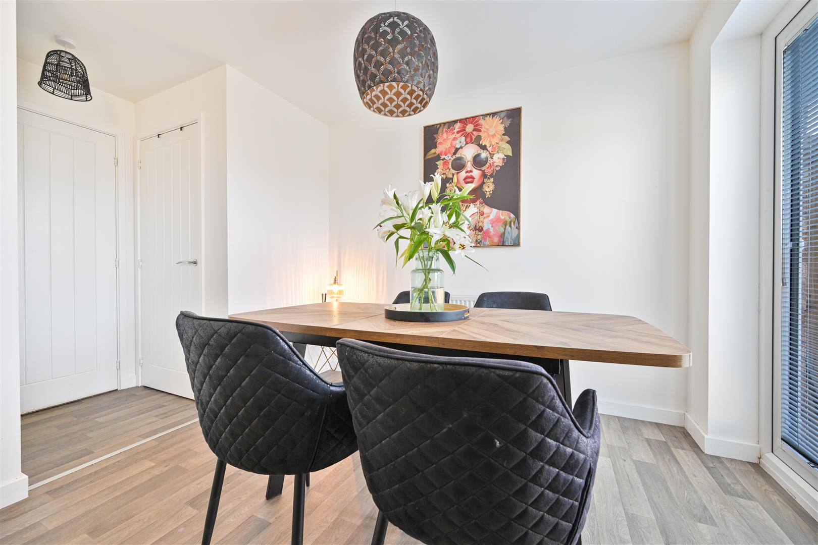 The ground floor welcomes you with a bright entrance hall leading into a stunning front-facing lounge, where a charming box window floods the space with natural light. To the rear, the contemporary dining kitchen features sleek wall and floor units, integrated appliances, and generous space for both everyday living and entertaining. French doors open directly onto the rear garden, seamlessly connecting indoor and outdoor living. A convenient W.C. completes this level.