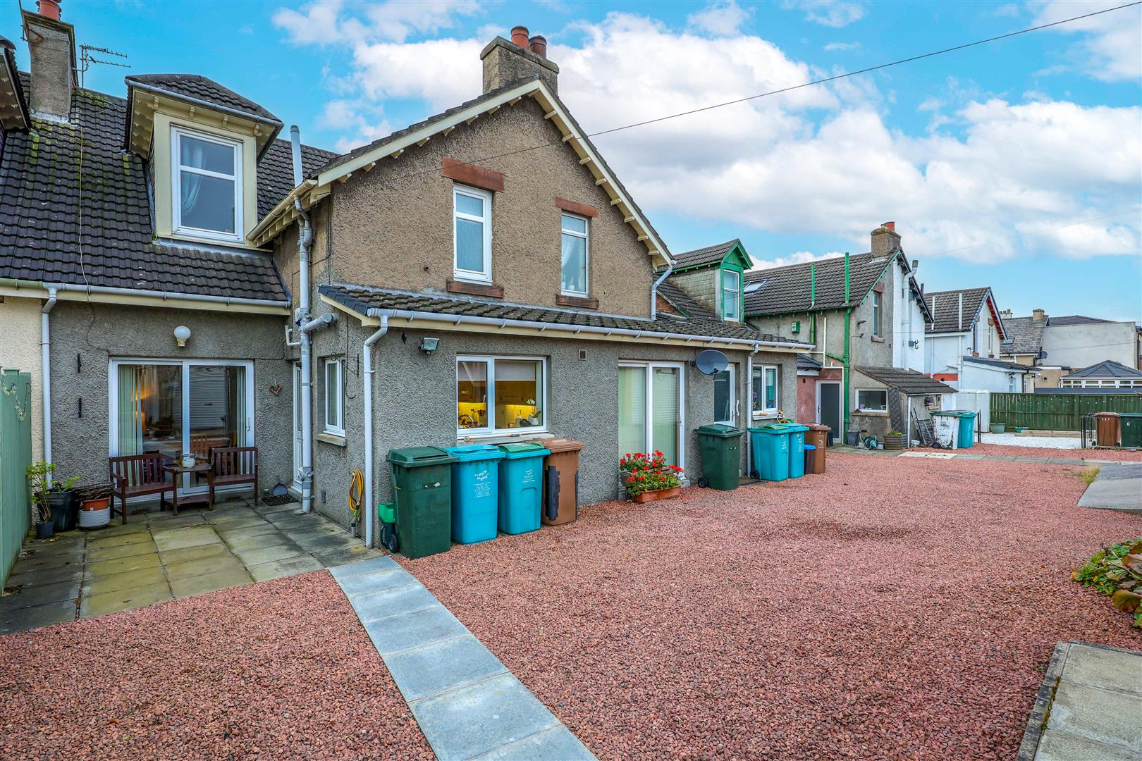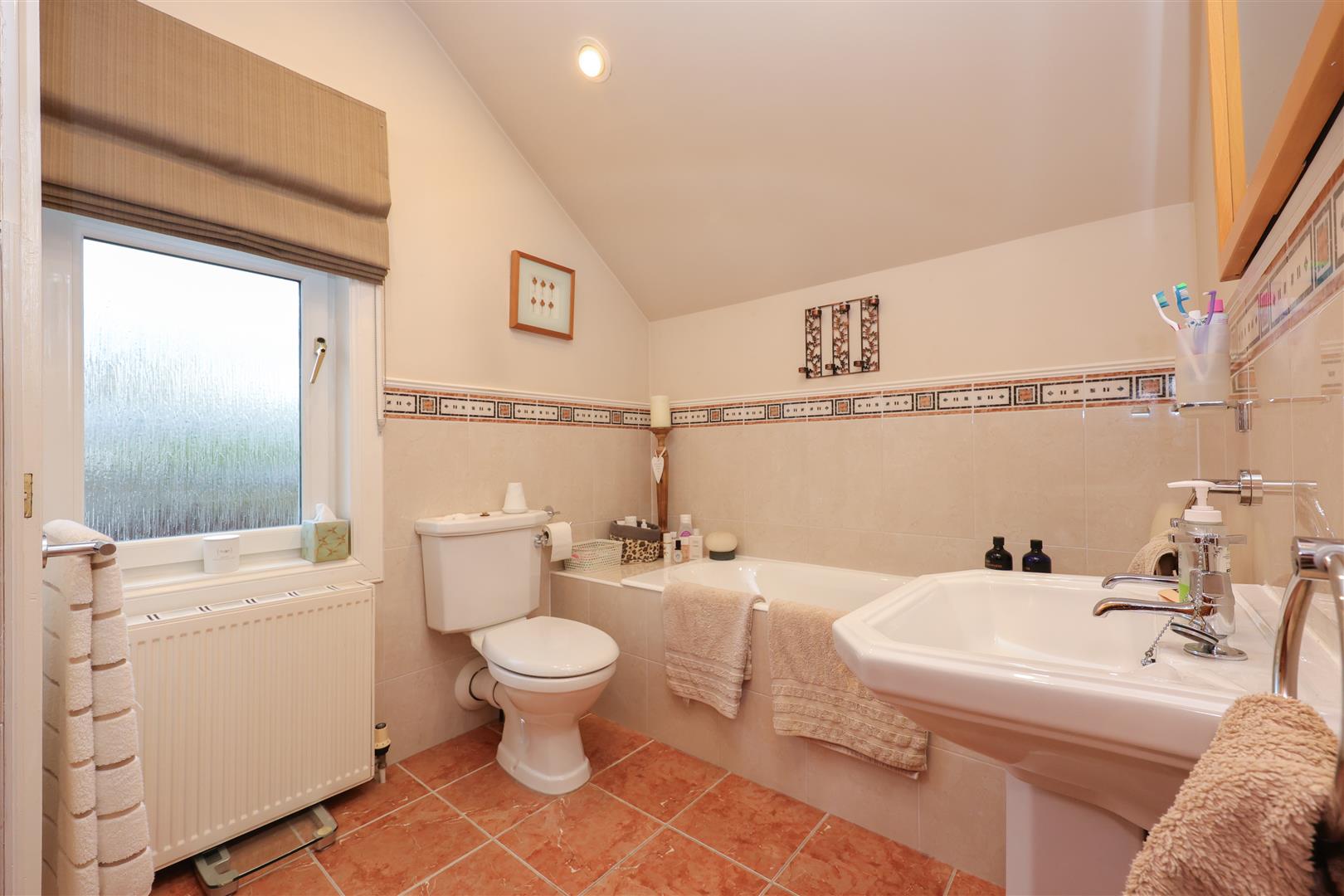 On the upper level you will find three bedrooms, all of which are carpeted throughout with storage space, a stylish part tiled three piece family bathroom consisting of a sink, WC and bath and a separate shower room with walk in enclosure with electric shower and wash hand basin. This ideal family home is also enhanced with gas central heating, double glazed windows, a detached garage and garden grounds to the front and rear.