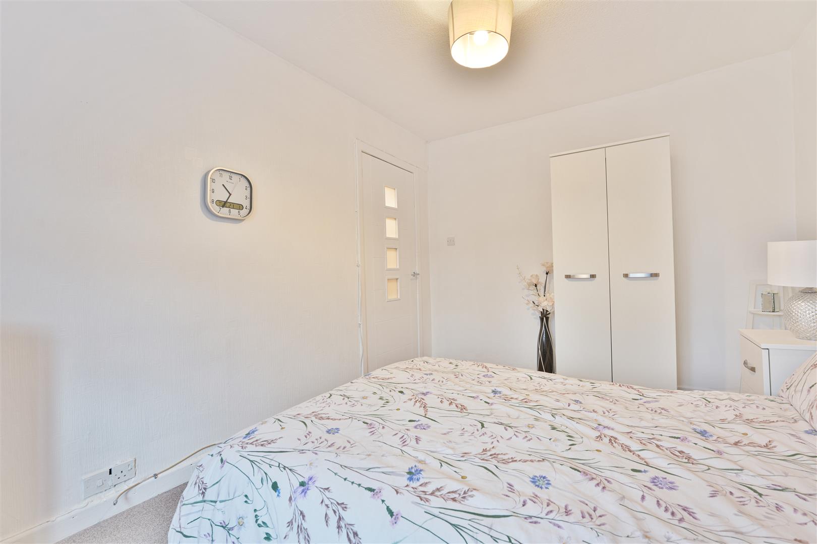 Upstairs, the property offers two double bedrooms, both carpeted for comfort, with the master bedroom benefiting from fitted floor-to-ceiling wardrobes. The accommodation is completed by a family bathroom, comprising a back-to-wall WC with vanity unit and a bath with overhead shower.
