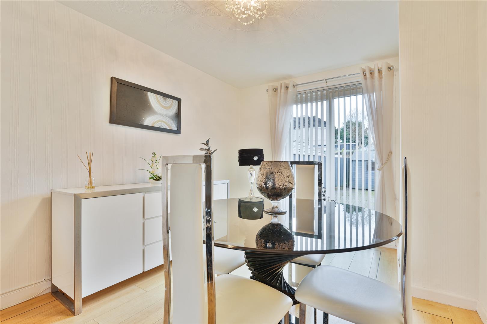 The ground floor welcomes you with a bright and inviting entrance hallway, leading through to a generously sized, front-facing lounge and dining room. This attractive space features laminate flooring and a stylish feature fire surround, while French doors from the rear dining area open directly onto the rear garden, allowing plenty of natural light to flow through. The modern kitchen is well appointed with an excellent range of floor and wall-mounted units, a built-in oven with gas hob, and space for freestanding appliances. A rear door provides convenient access to the garden.