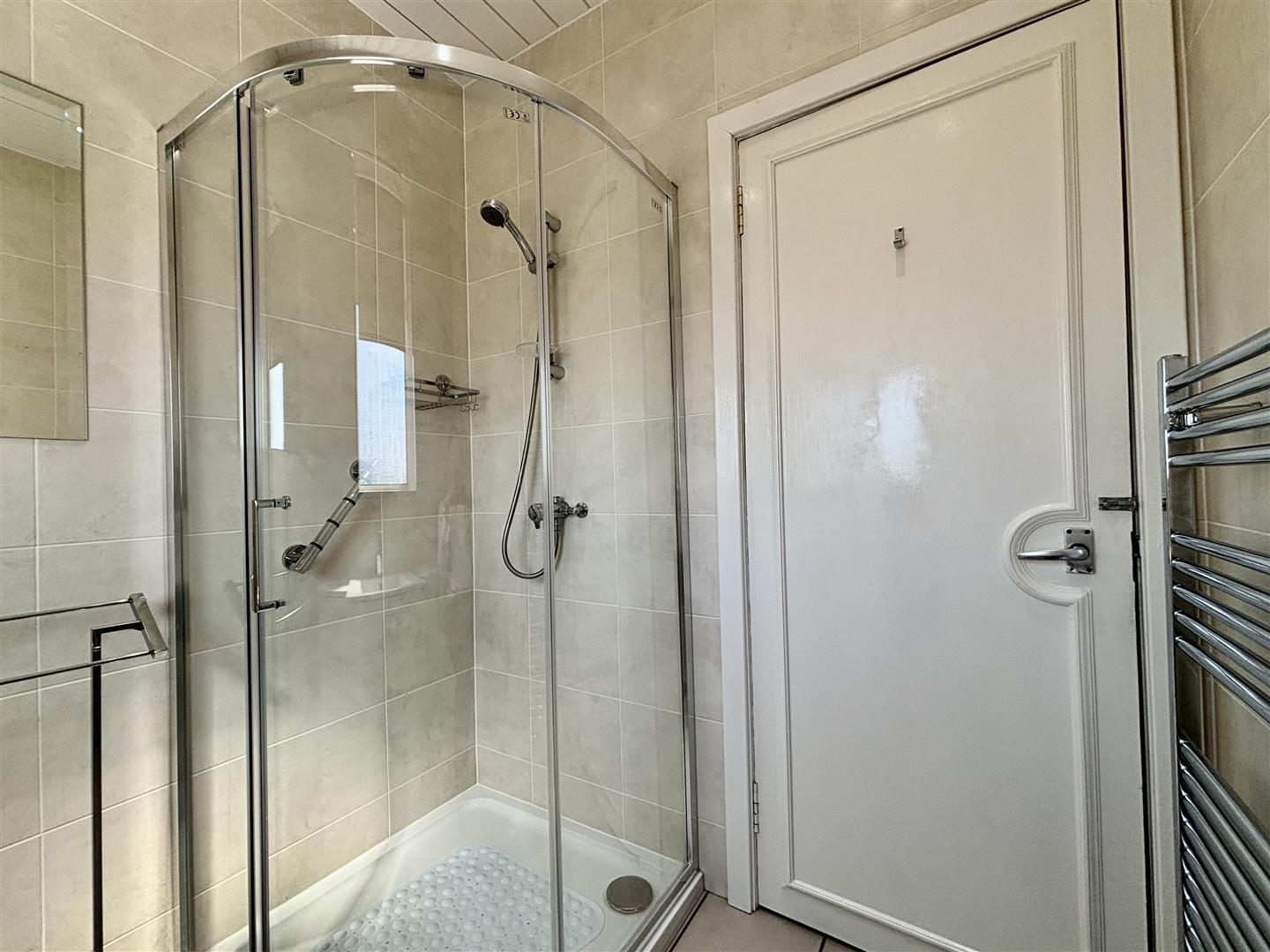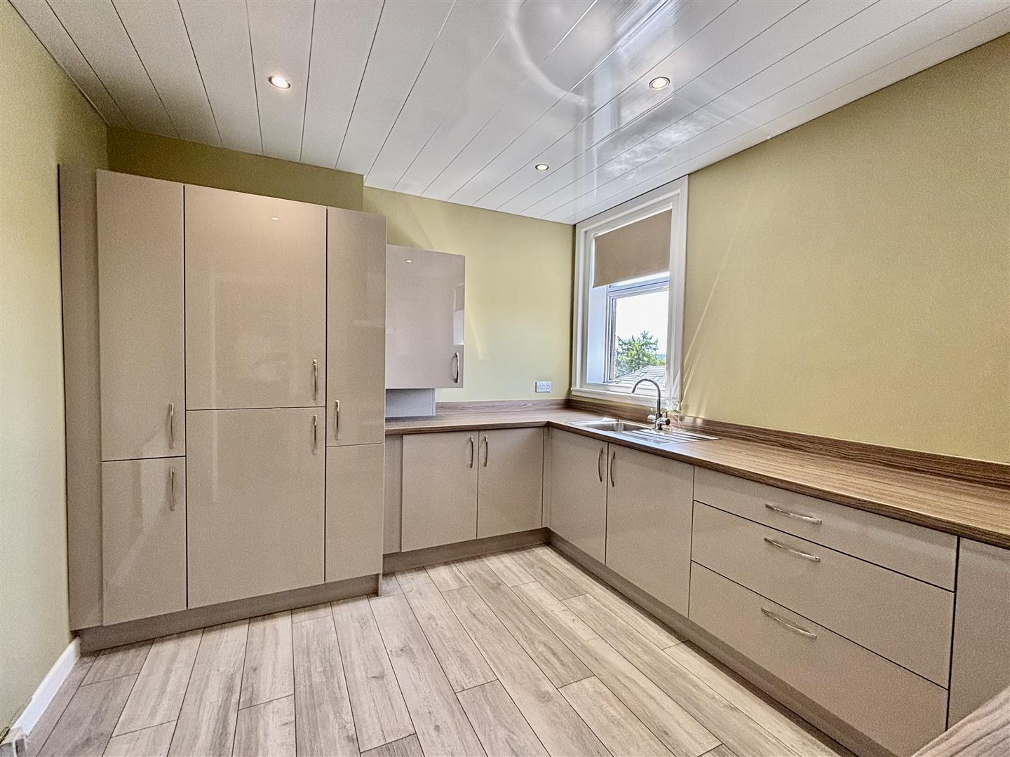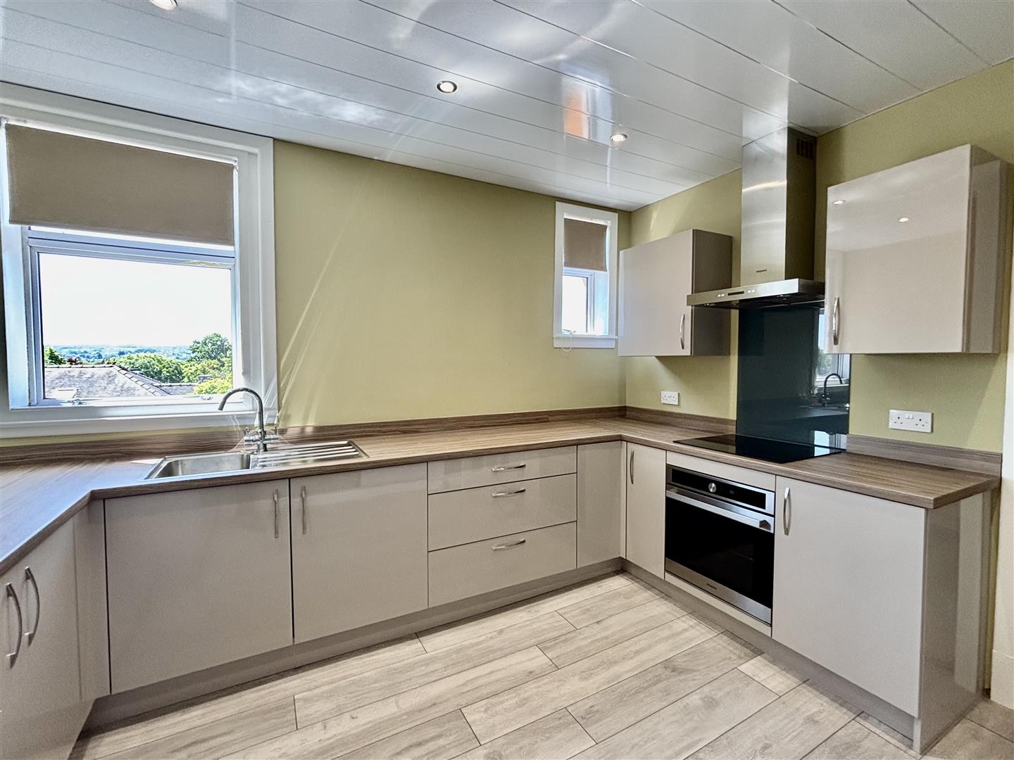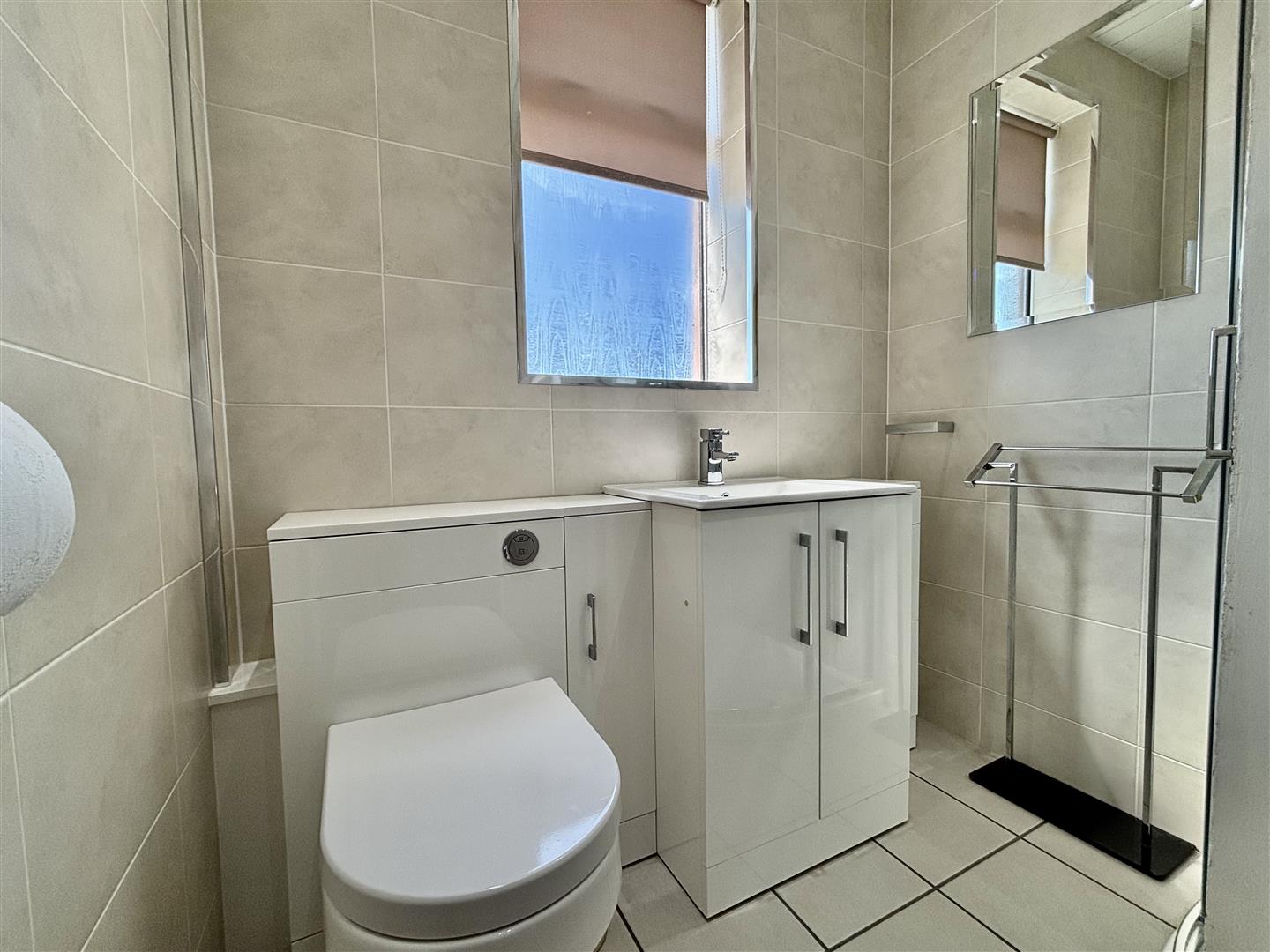 Accessed via a carpeted entrance stairway, the property opens into a spacious and well-appointed lounge featuring a large front-facing bay style window that floods the room with natural light. The contemporary fitted kitchen is both practical and elegant, featuring a comprehensive range of wall and base units that provide excellent storage and workspace. The modern shower room is fully tiled and showcases a sleek, back-to-wall WC/sink combination unit alongside a glass-enclosed shower. The property further benefits from two well-proportioned double bedrooms and a versatile box room, ideal for use as a home office or dressing room.