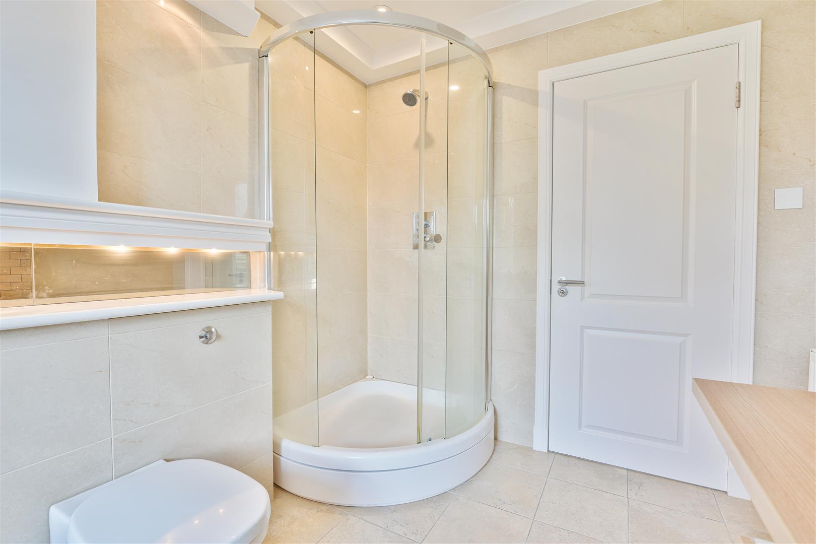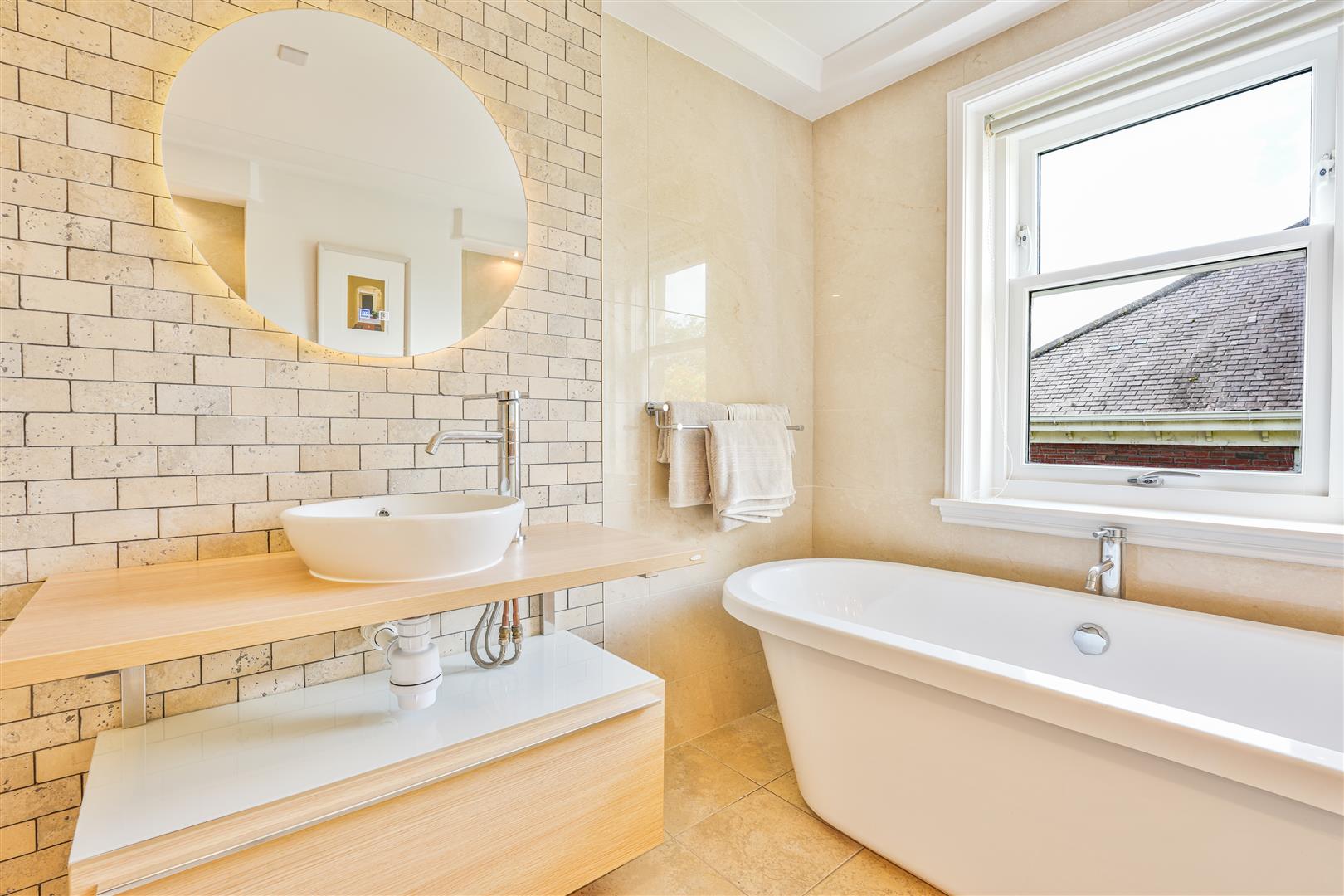The impressive kitchen is designed with both elegance and practicality in mind, boasting an extensive range of wall and base units, an eye-level oven, integrated appliances, and ample dining space. Accommodation includes three well-proportioned bedrooms, each finished in neutral tones. The master bedroom features stylish fitted wardrobes and a fully tiled en-suite shower room with a contemporary three-piece suite. The main bathroom is equally luxurious, showcasing a four-piece suite with a freestanding bath, separate shower enclosure, back-to-wall WC, and sleek vanity unit.