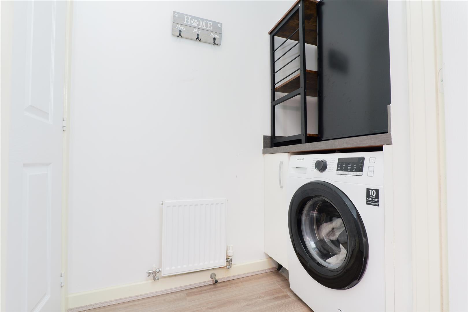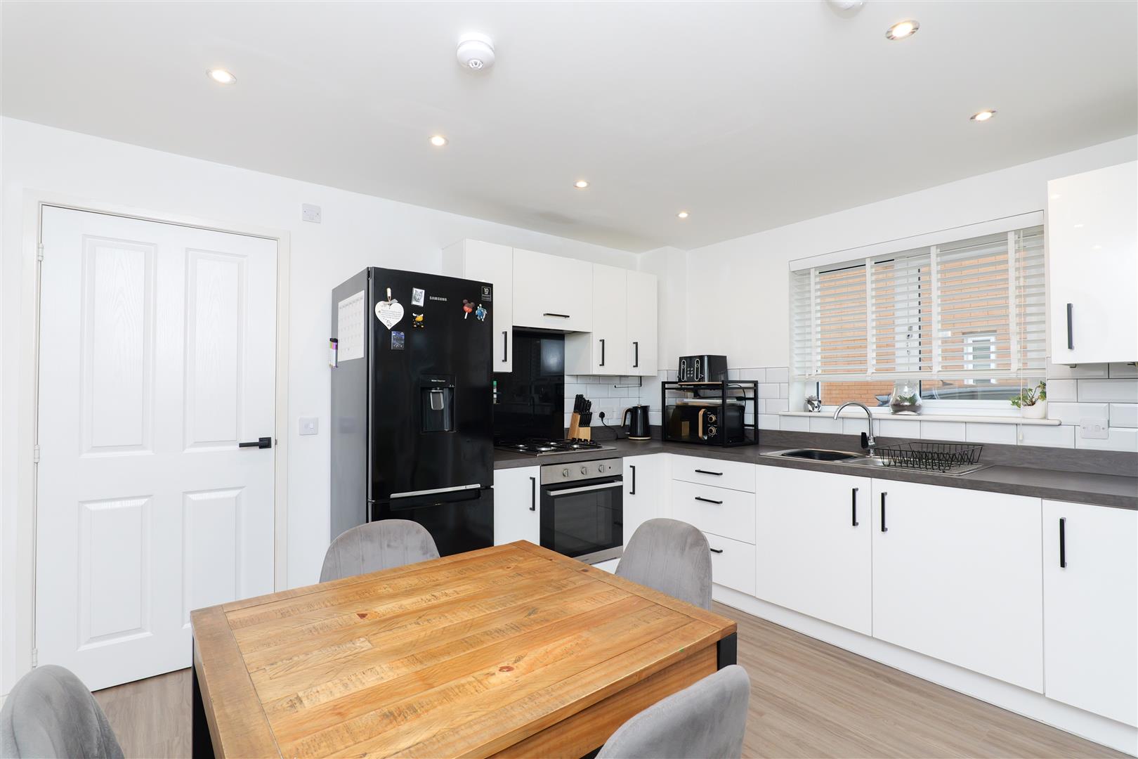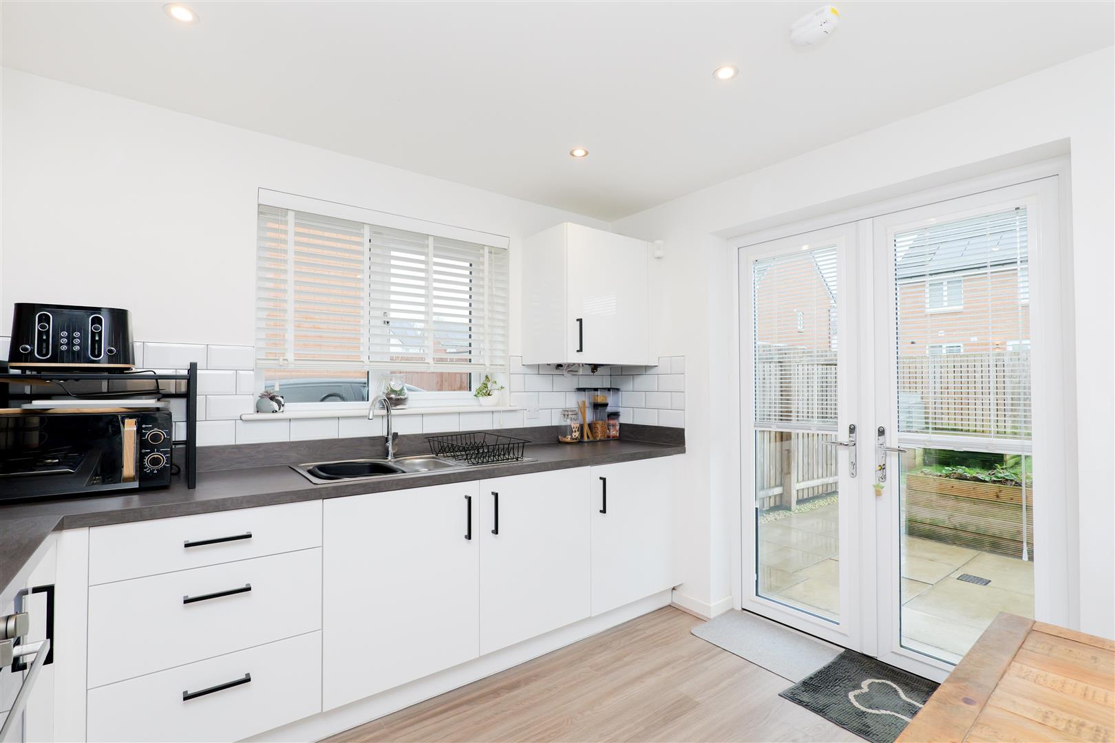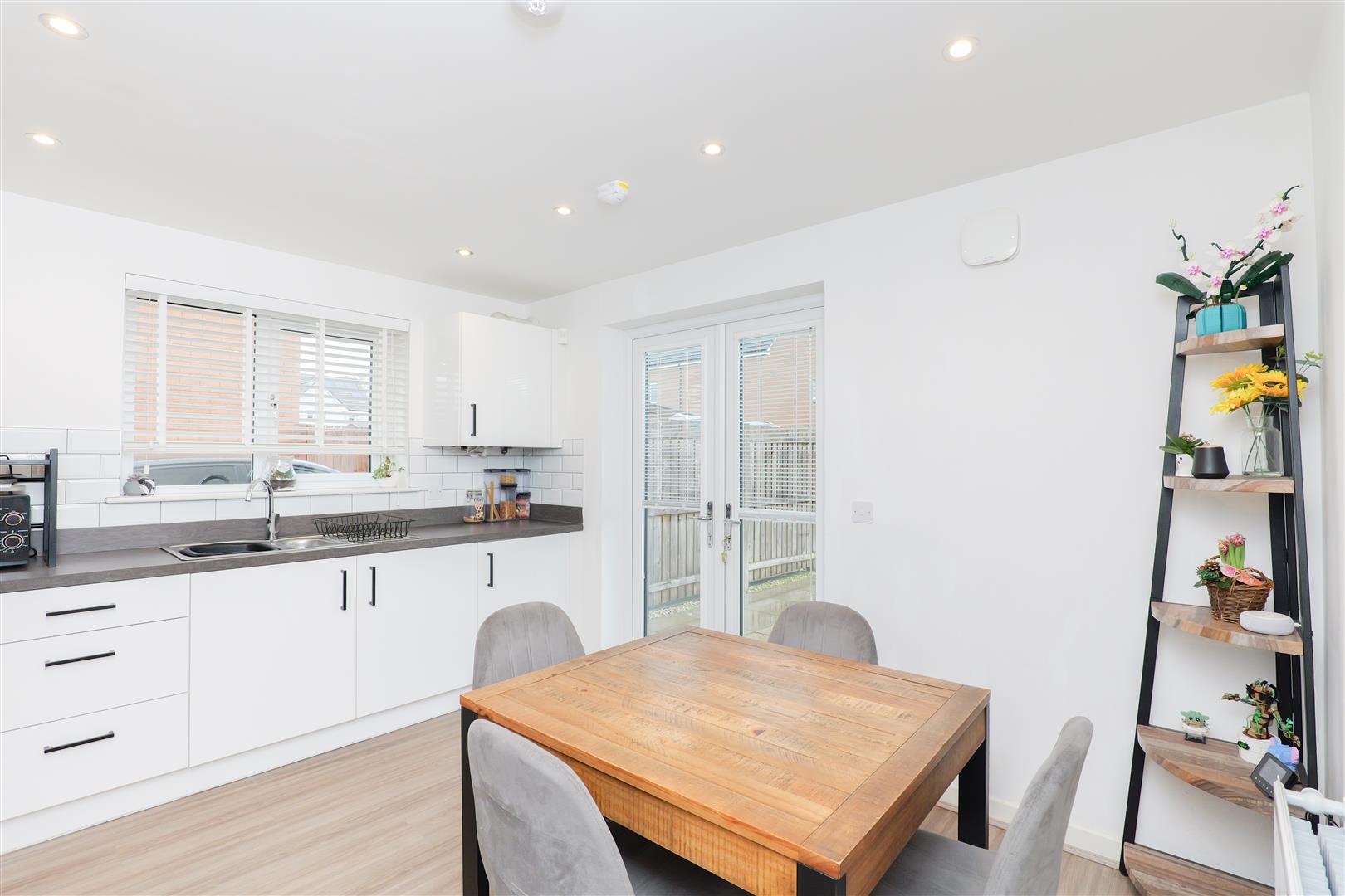 The ground floor of the property comprises of a welcoming entrance, a bright and airy lounge with laminate flooring and front facing window allowing for plenty of natural light, a modern fully fitted dining kitchen with French doors leading out to the rear garden, a separate utility area and a ground floor W.C. The upper floor consists of a landing area, three bedrooms all of which are carpeted throughout with ample storage space. The master bedroom benefits from built-in mirrored wardrobes, providing additional convenience. Completing the floor is a stylish part tiled family bathroom consisting of WC, sink and bath with overhead shower.
