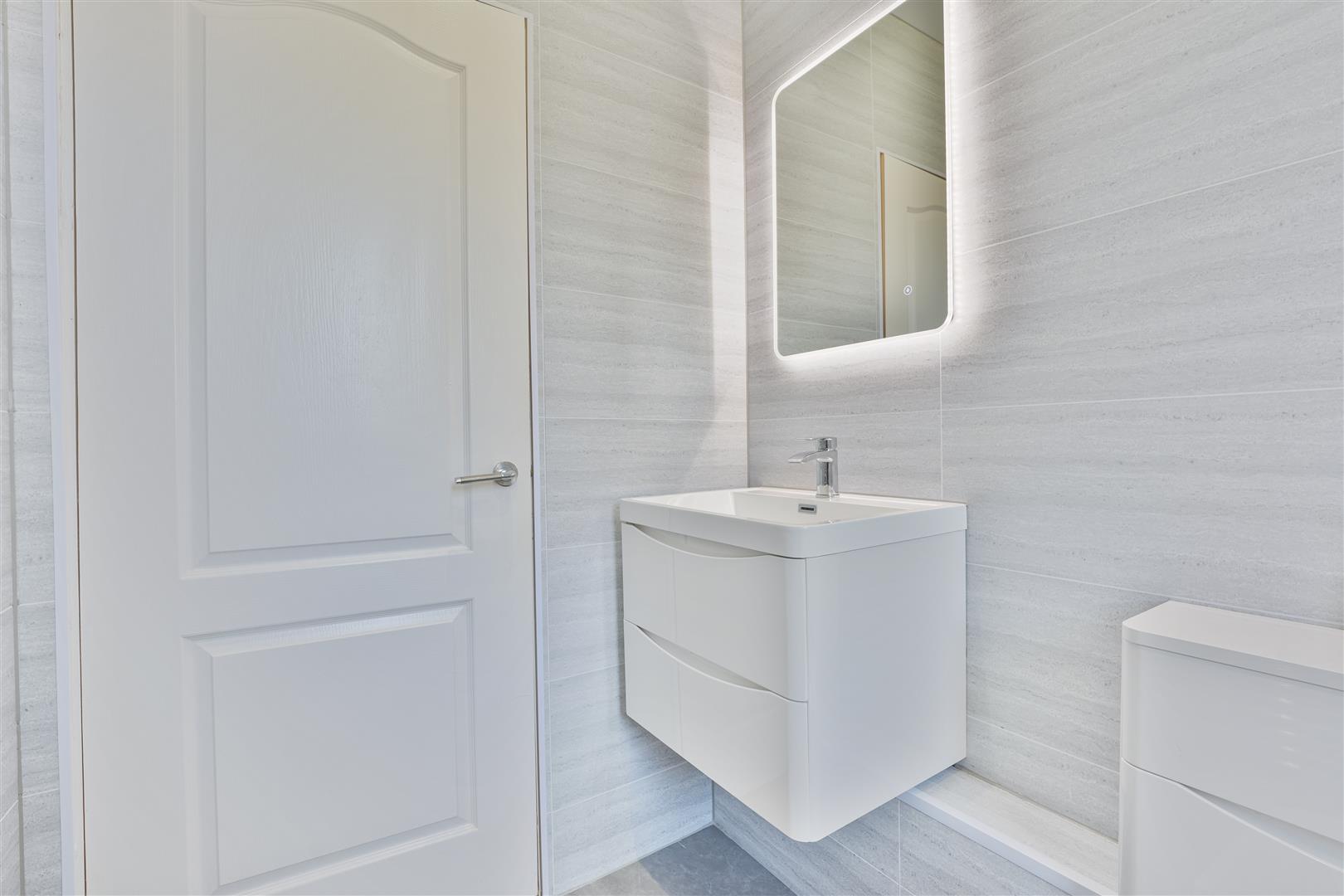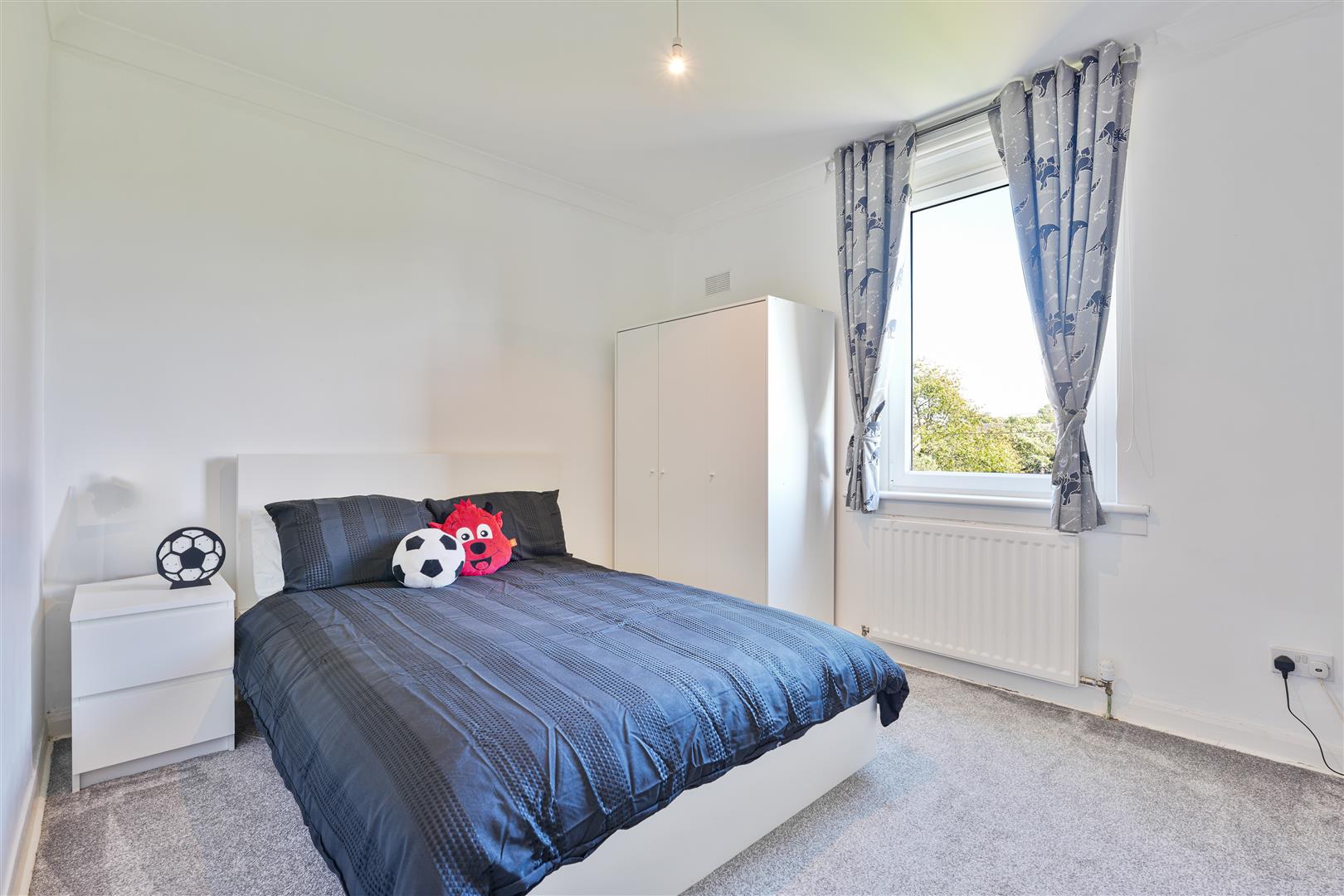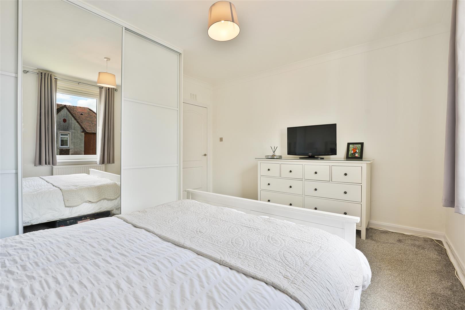 Two comfortable bedrooms provide excellent accommodation. The primary bedroom, positioned to the front, benefits from modern fitted wardrobes, while the second bedroom at the rear offers flexibility for additional bedroom furniture or a home office. A modern, fully tiled bathroom features a WC, vanity sink, and bath with overhead mixer shower.