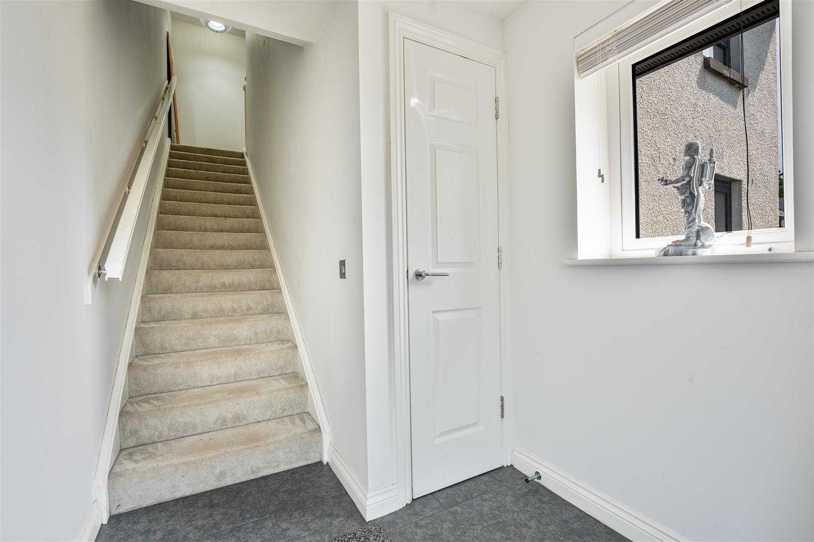 Step inside to discover a welcoming entrance hall with a handy storage cupboard, leading up a carpeted staircase to the main accommodation. The heart of the home is a generous open-plan lounge, enhanced by dual aspect windows that flood the space with natural light. The adjoining modern kitchen is beautifully appointed with ample wall and base units and integrated appliances. The stylish family bathroom features a modern WC/sink combination unit, a full-sized bath with overhead shower, and elegant part-tiled walls. Two bedrooms, both of which are well-proportioned, fully carpeted, and benefit from built-in wardrobes offering excellent storage.