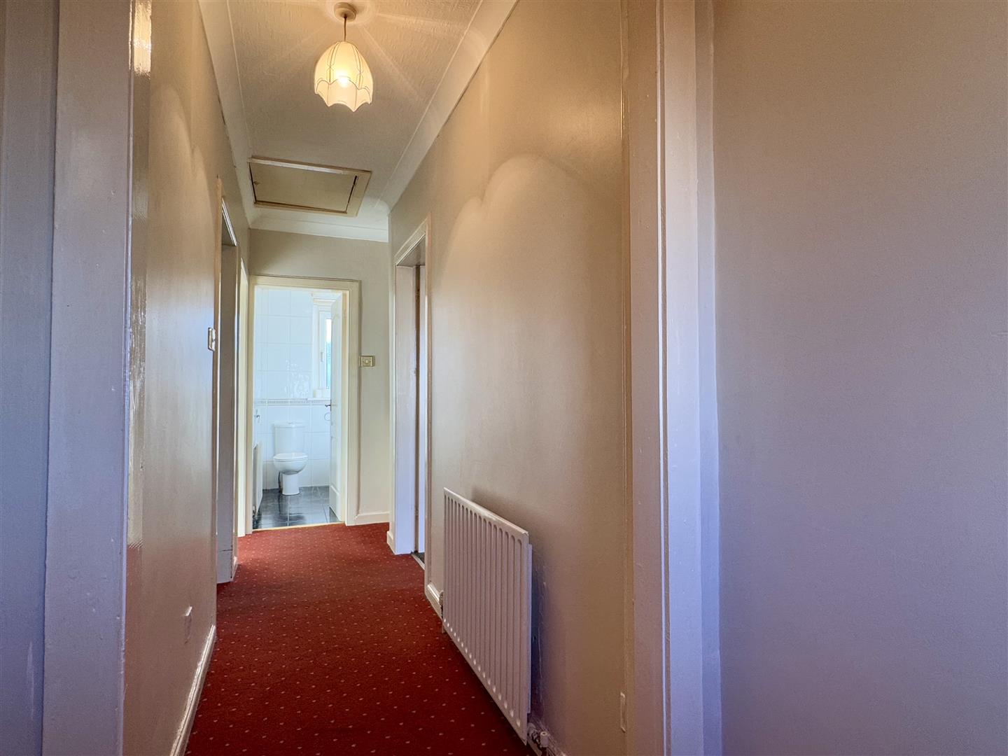 The accommodation comprises an entrance vestibule leading into a welcoming hallway, which connects the main rooms. The lounge is generously sized, featuring a fireplace and ample space for a range of furnishings, making it a comfortable central living area. The breakfasting kitchen, located to the rear, offers direct access to the garden. There are two well-proportioned bedrooms, each benefiting from built-in storage, and a bathroom fitted with a bath and shower over. Additional storage can be found in the loft, providing further scope for enhancement if desired.