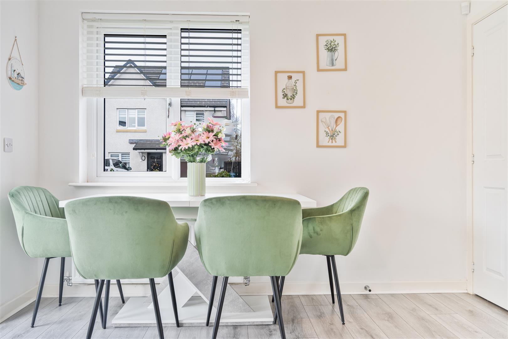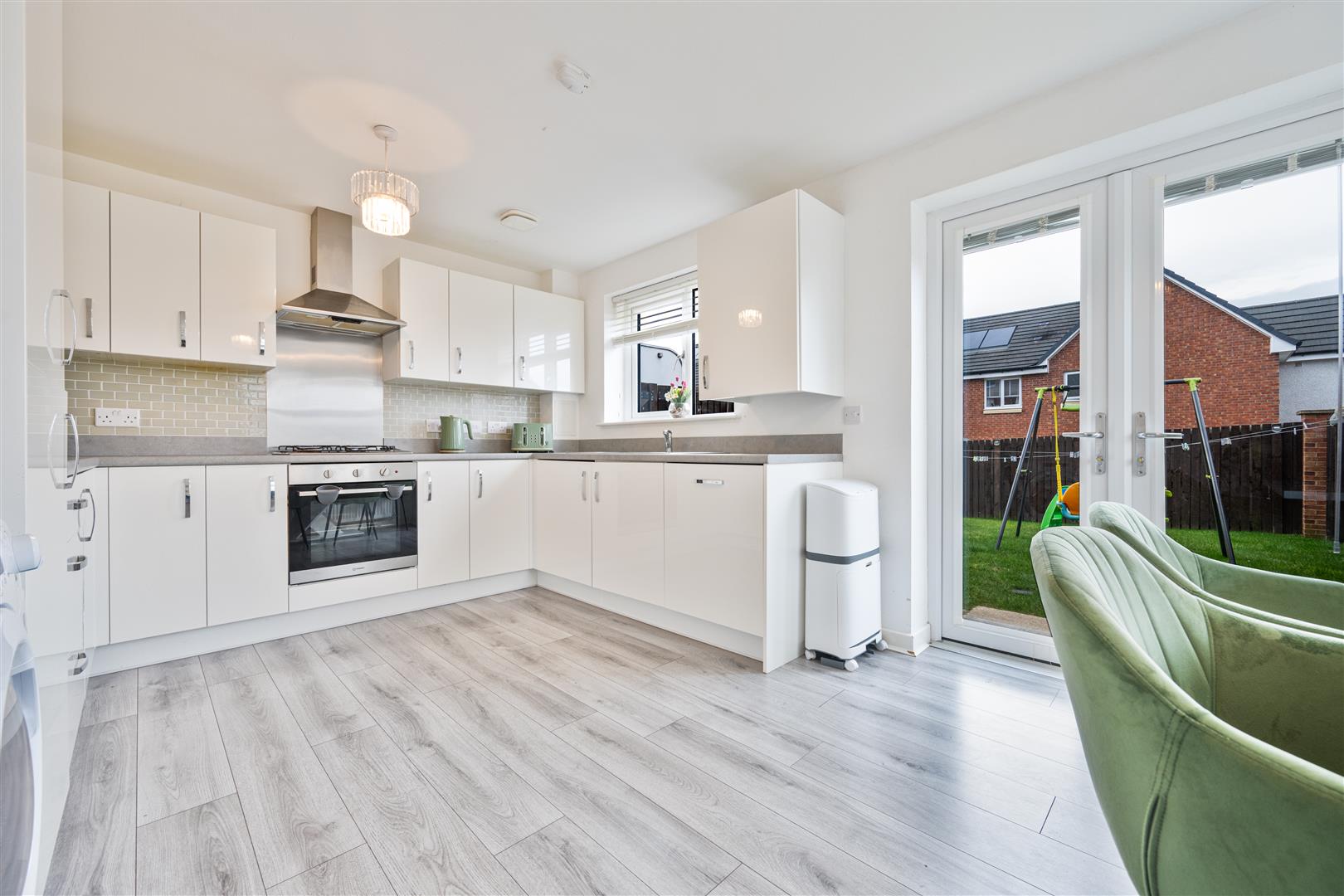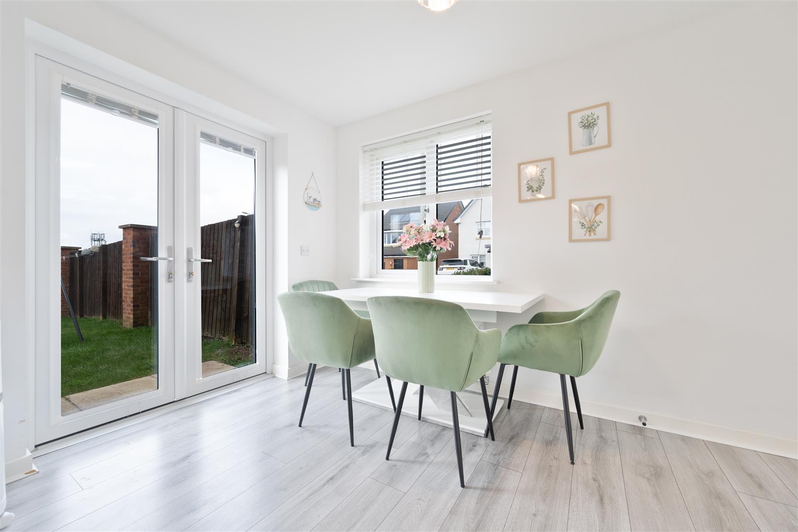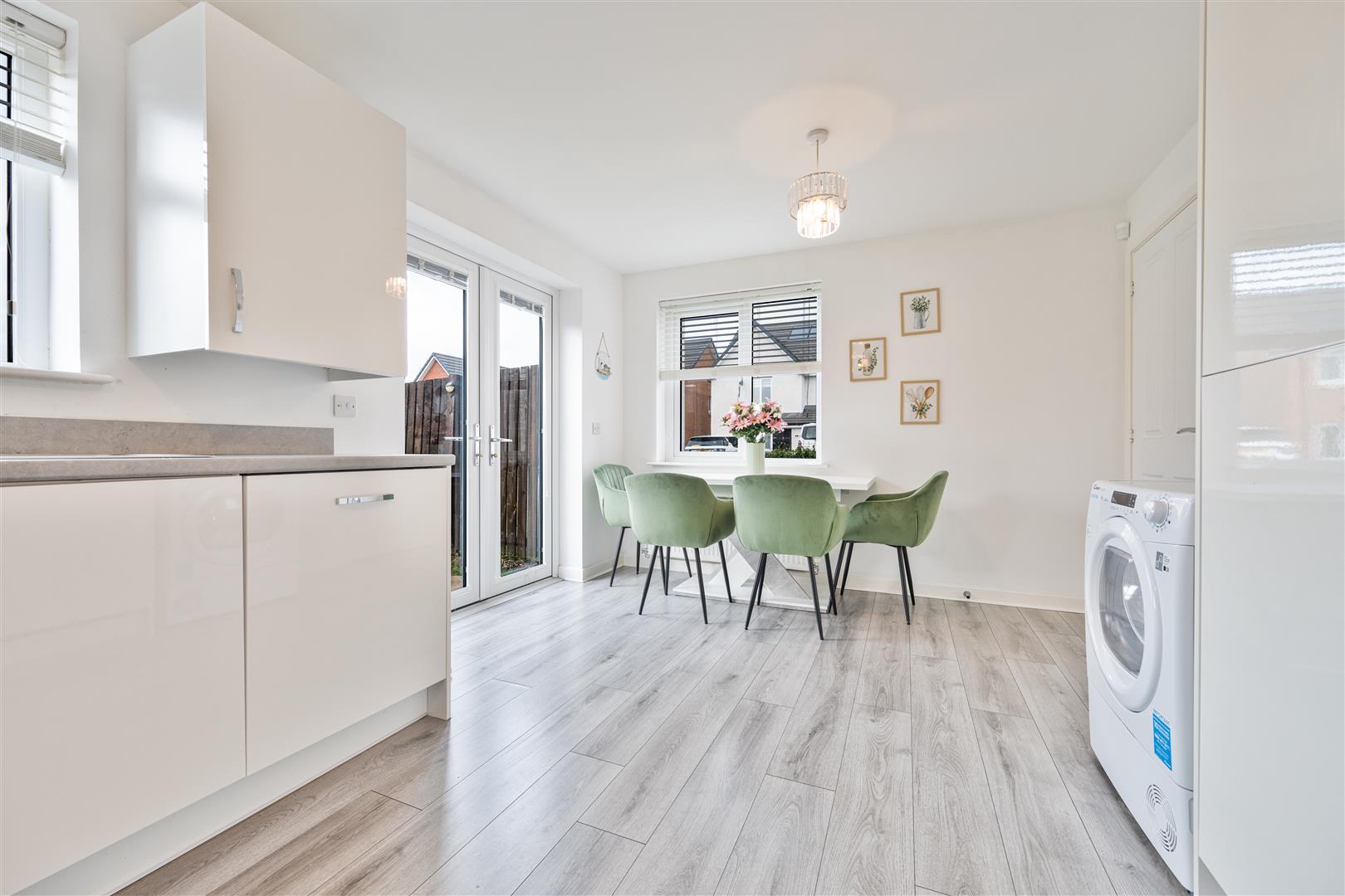 The ground floor comprises a welcoming entrance hallway leading to a generous and light-filled lounge, ideal for relaxing or entertaining. To the rear, the stylish kitchen and dining area forms the heart of the home, featuring a wide range of modern base and wall-mounted units, ample worktop space, and integrated appliances. The dedicated dining space comfortably accommodates a family table, while French doors open directly onto the rear garden, creating a seamless indoor-outdoor flow and flooding the room with natural light. A convenient downstairs WC completes the lower level.