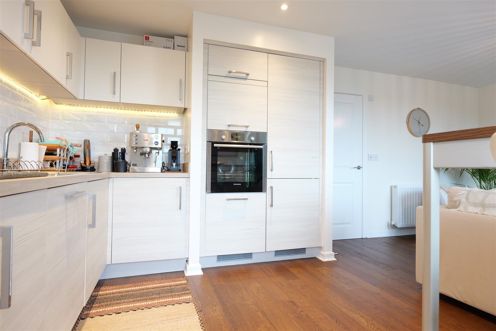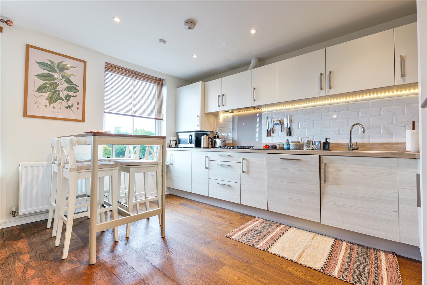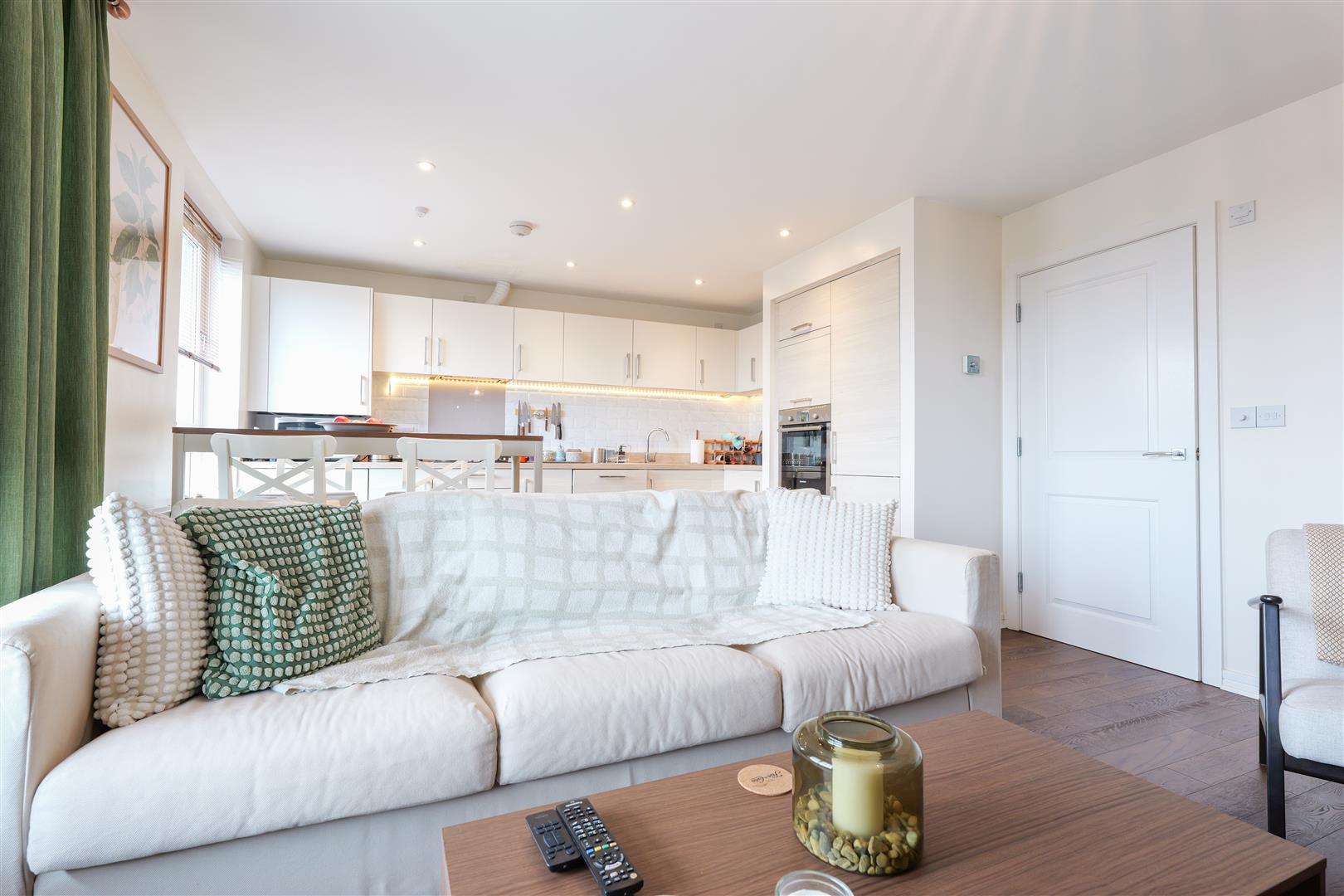 The welcoming entrance hallway with quality hardwood flooring leads to a spacious open-plan lounge and kitchen, where the windows flood the space with natural light. The modern fitted kitchen features a range of wall and base units, integrated appliances, and generous space for dining, perfect for both everyday living and entertaining.