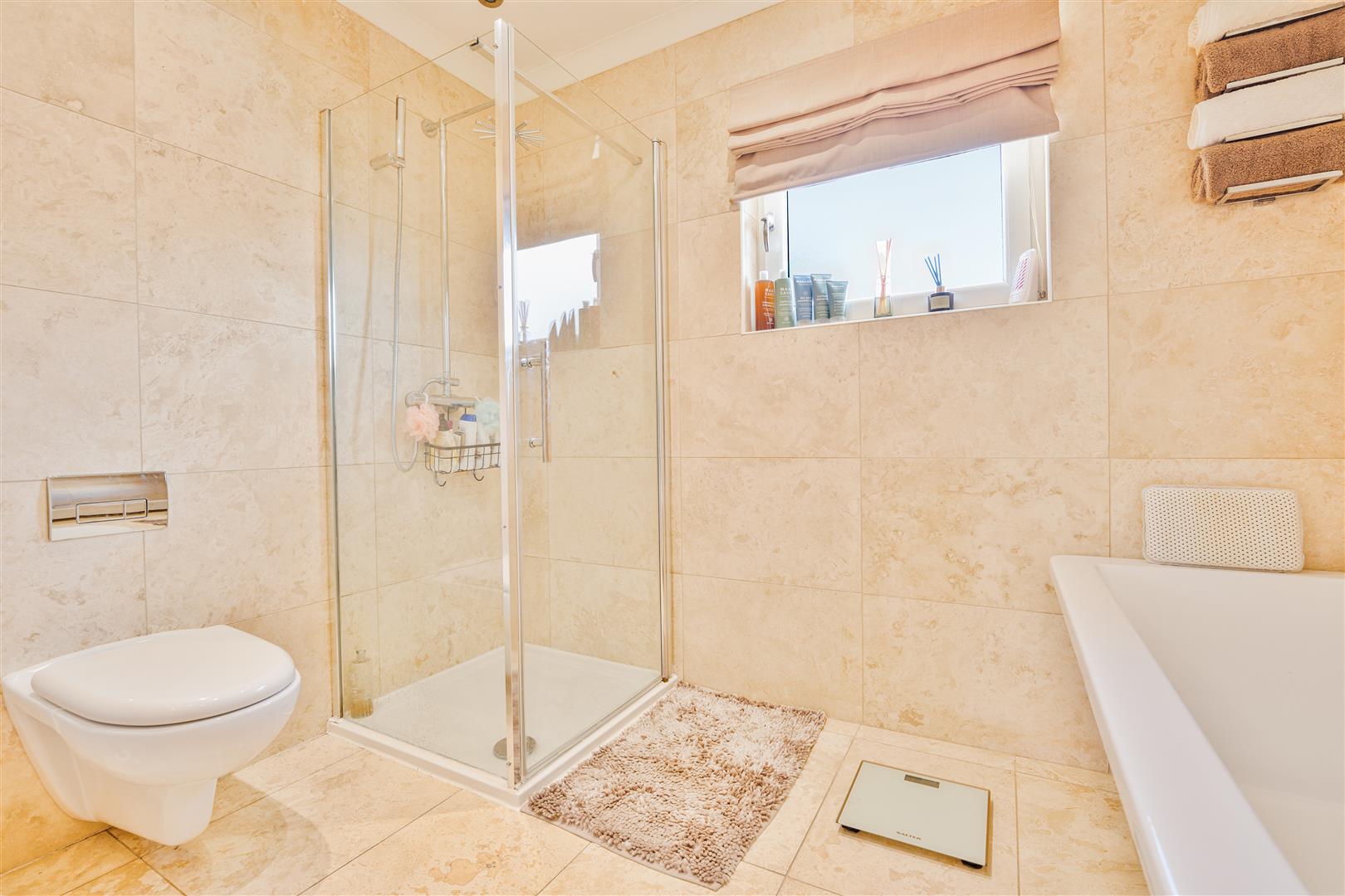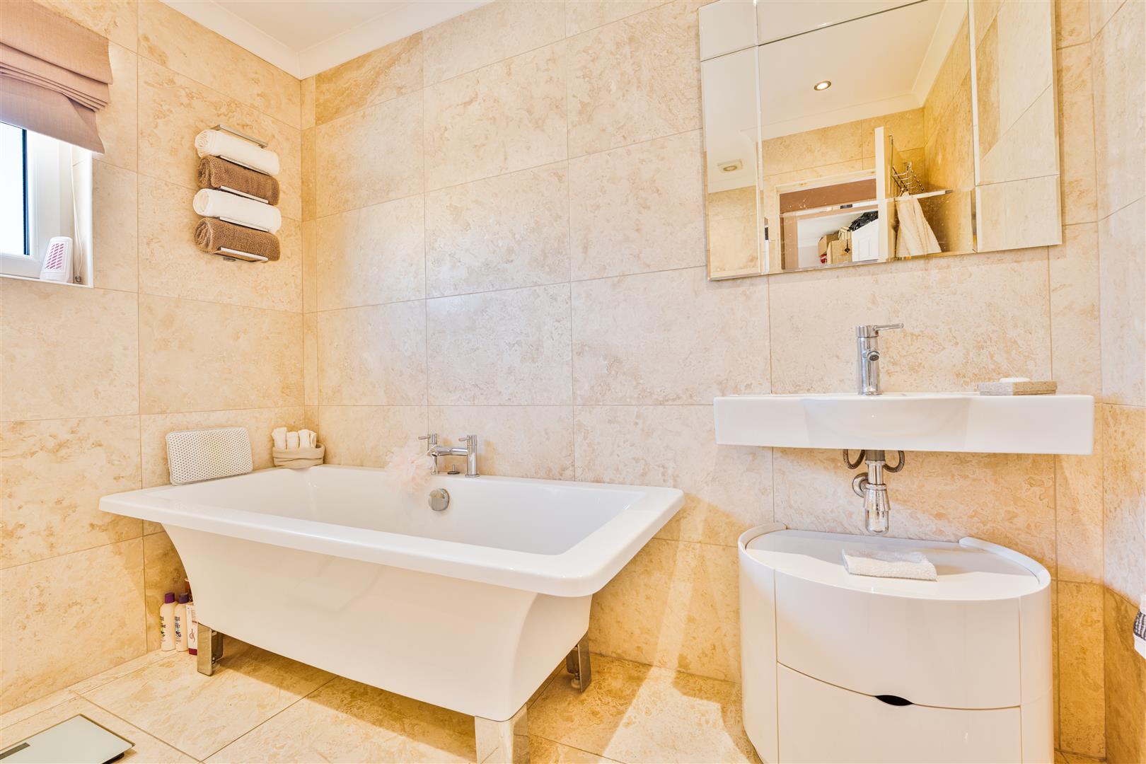Upstairs, the property boasts three generously sized bedrooms, offering ample space for family life or home working. The fully tiled family bathroom is a luxurious space, featuring a standalone bath and enclosed shower.