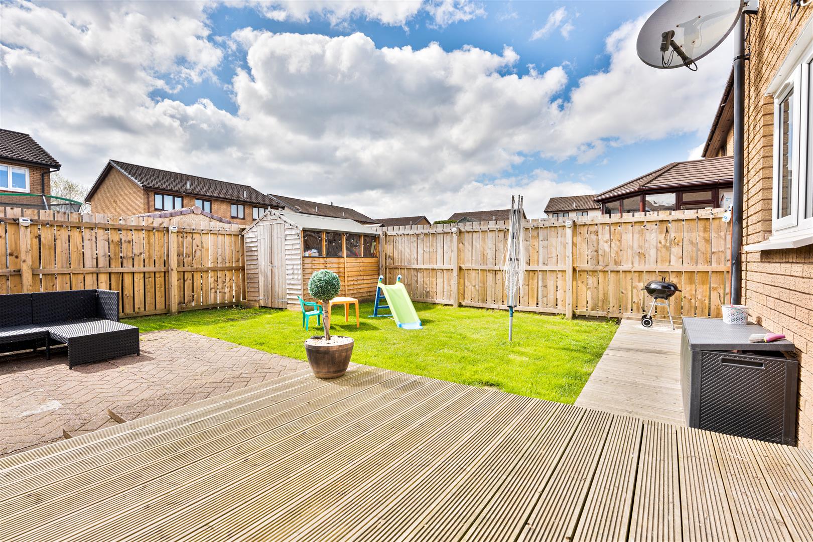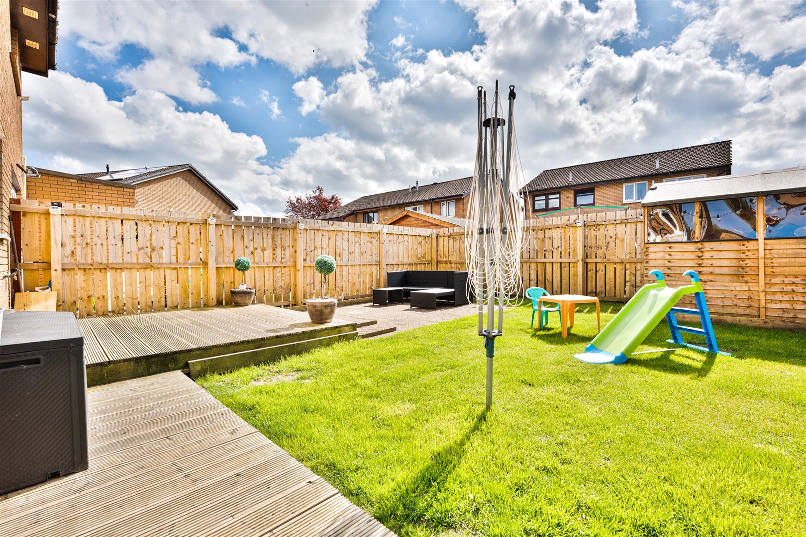 Additional highlights include gas central heating, double-glazed windows throughout, a private driveway offering convenient off-street parking, and a sizeable enclosed rear garden. The outdoor space has a raised decked area leading down to a slabbed patio and lawn.