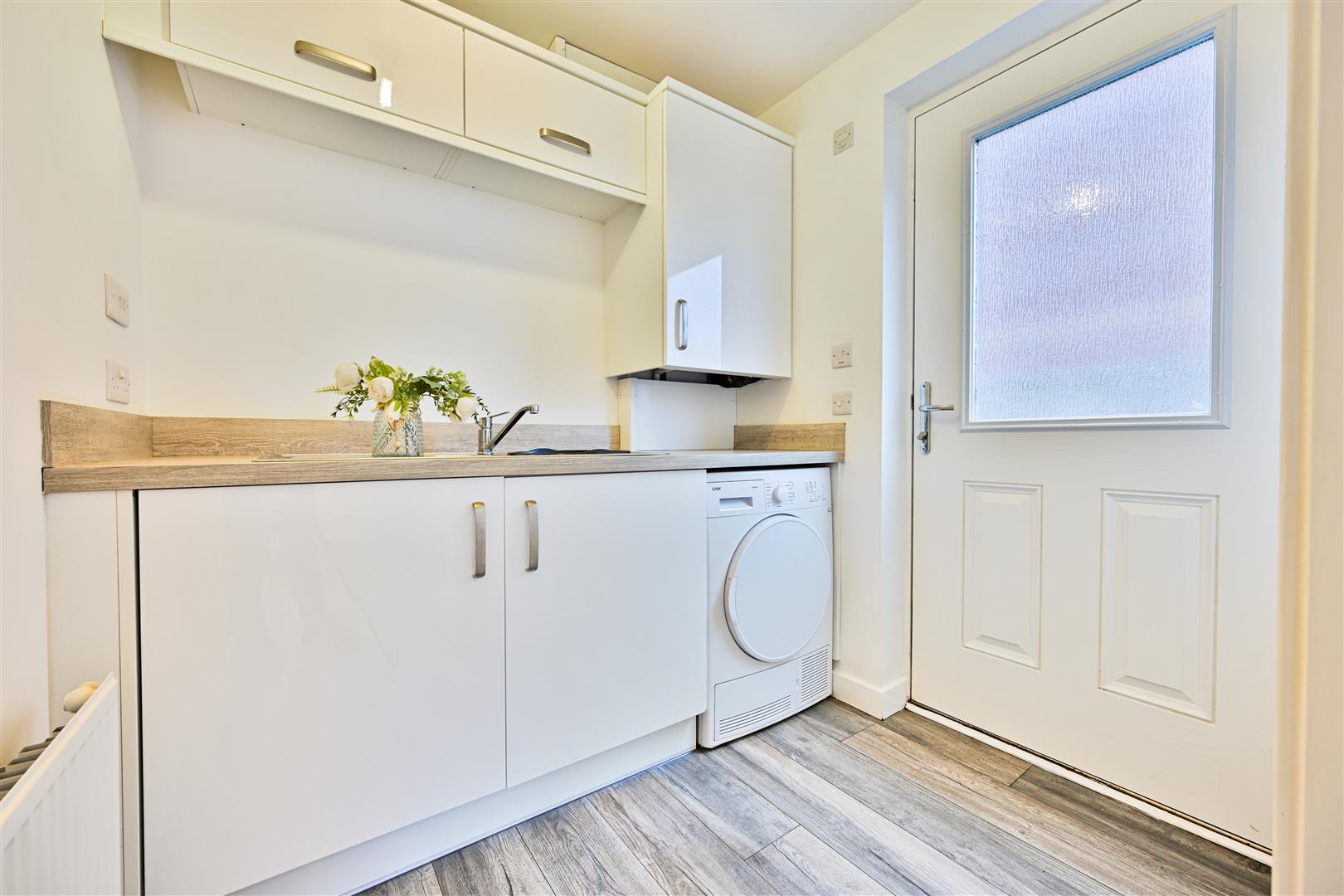 The ground floor opens with a welcoming entrance hall, leading through to a bright and generously proportioned front-facing lounge, ideal for relaxing or entertaining guests. To the rear, the impressive fitted dining kitchen forms the heart of the home, featuring integrated appliances, ample space for dining, and French doors that open directly onto the rear garden, seamlessly blending indoor and outdoor living. A practical utility room provides additional storage and appliance space, with convenient side access to the driveway, while a ground floor cloakroom W.C. completes the level.