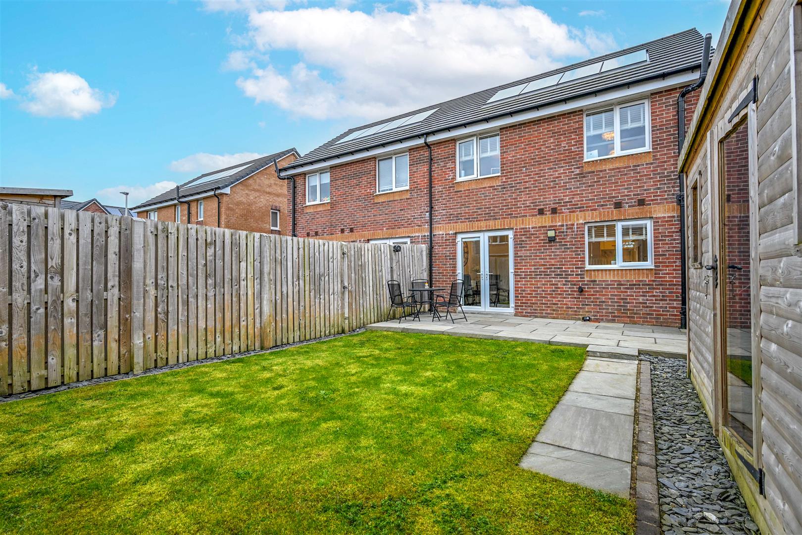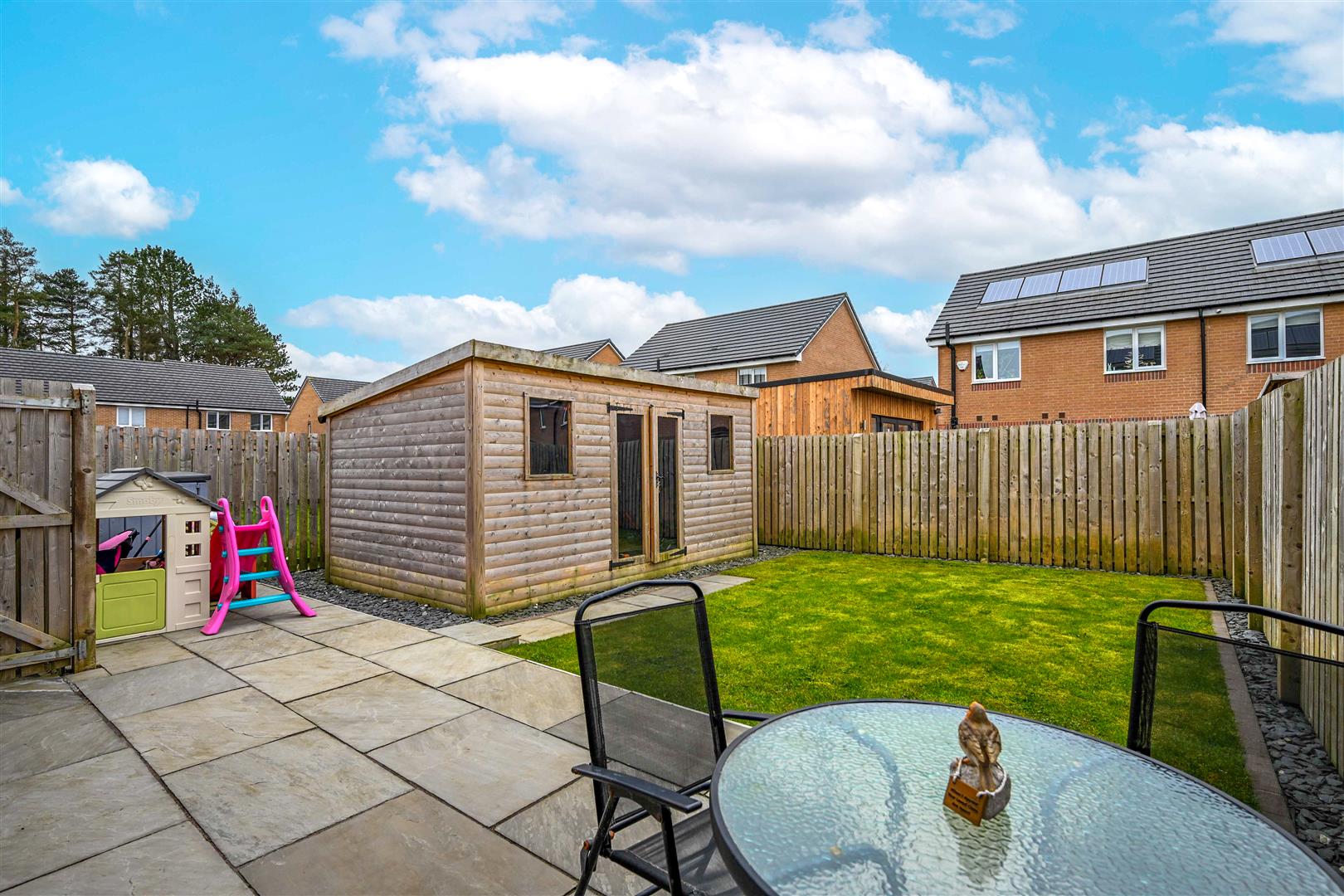 Further enhancing this attractive home are gas central heating, double glazing, and energy-efficient solar panels. Externally, a tarmac driveway provides off-street parking, while the enclosed rear garden features a combination of paving and grass, perfect for both relaxing and entertaining, along with a substantial timber shed/outbuilding for additional storage or outdoor use.