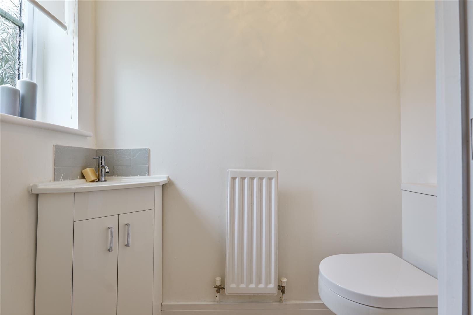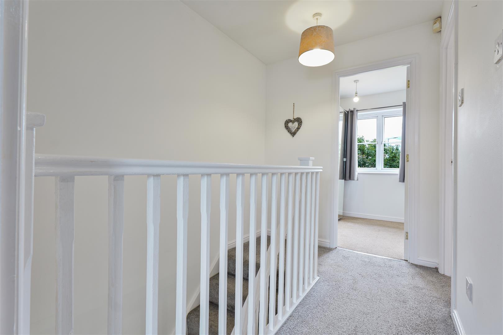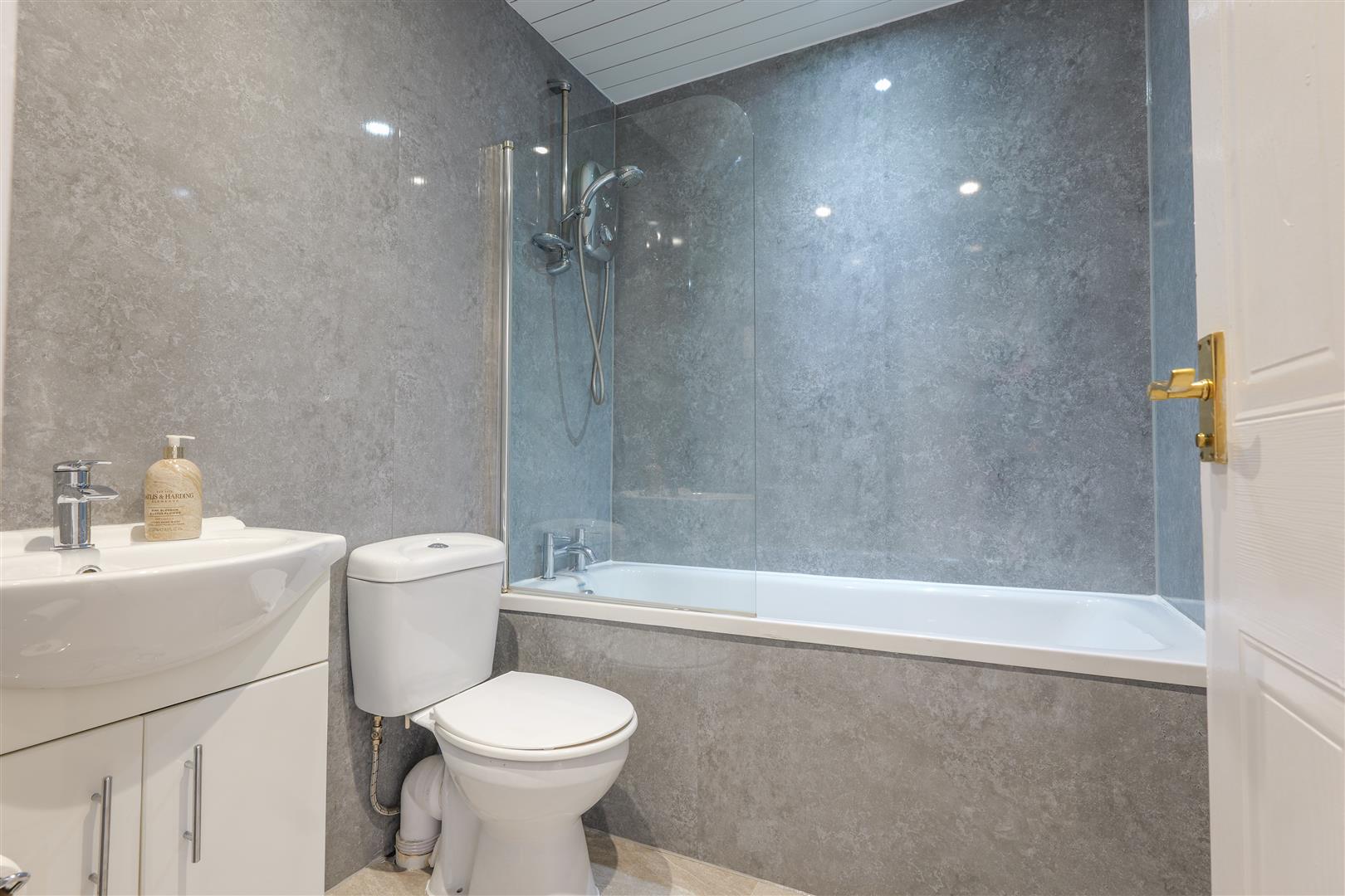 Upstairs, a well-proportioned landing gives access to three carpeted bedrooms, along with a modern family bathroom comprising a WC, vanity sink unit, and bath with overhead shower, all finished with stylish wet wall panelling.