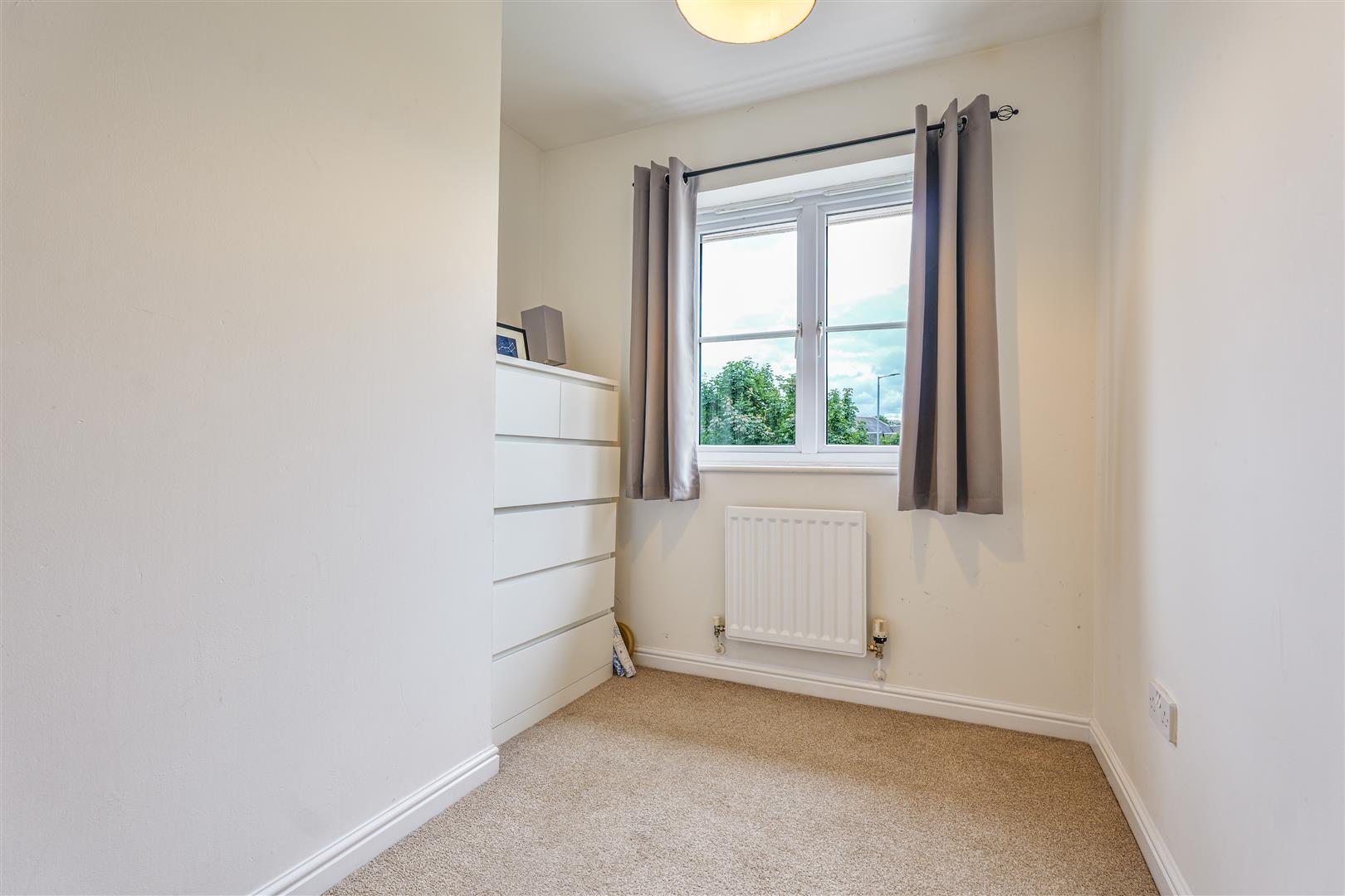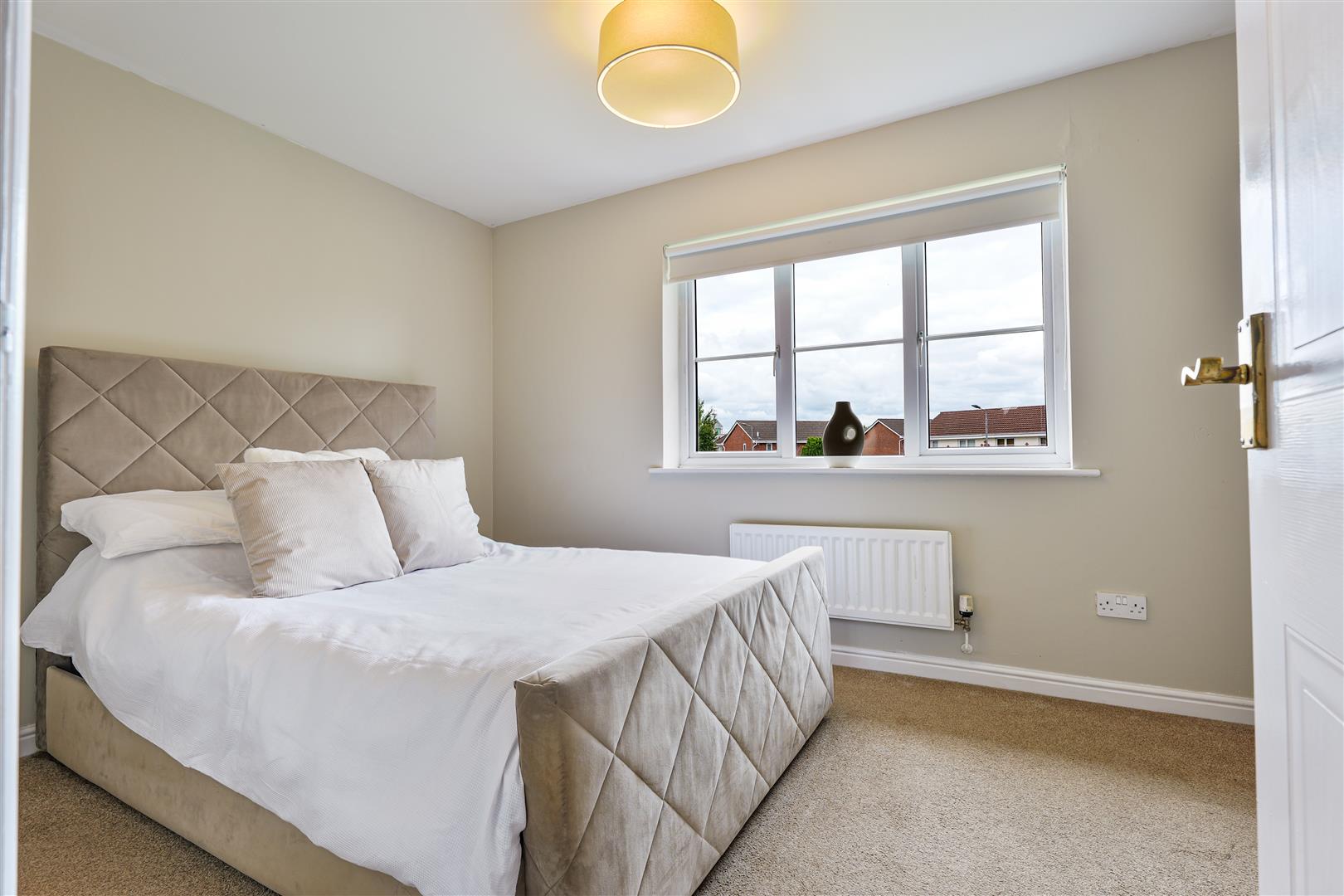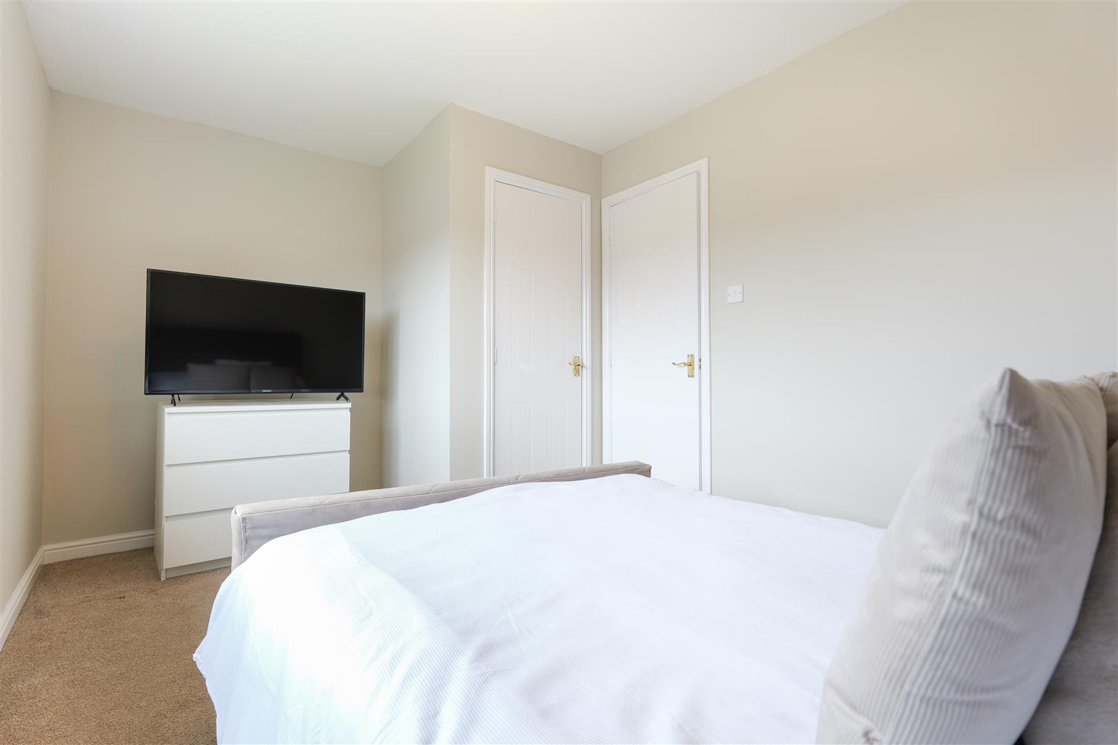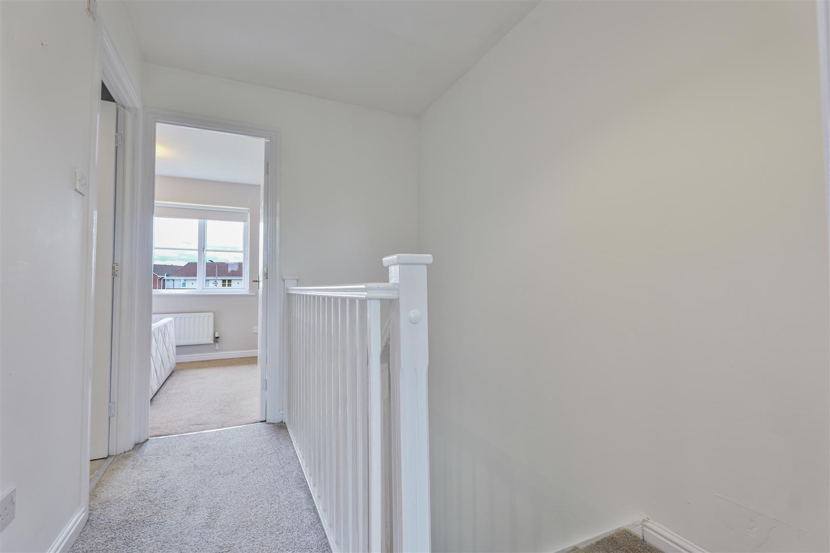 Upstairs, a well-proportioned landing gives access to three carpeted bedrooms, along with a modern family bathroom comprising a WC, vanity sink unit, and bath with overhead shower, all finished with stylish wet wall panelling.