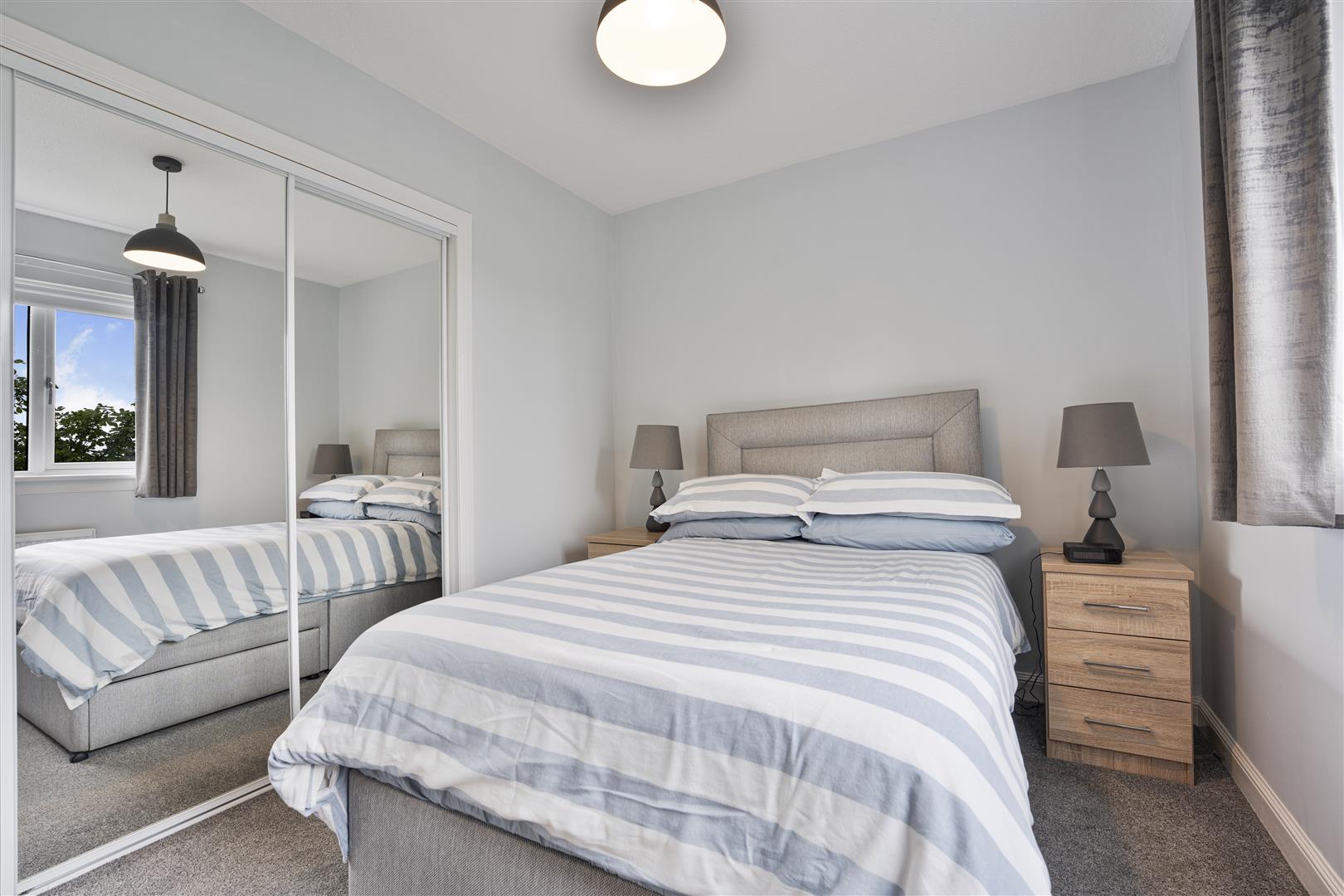 Both bedrooms are fully carpeted, with the master bedroom featuring stylish mirrored fitted wardrobes for ample storage. The modern bathroom is part-tiled and includes a back-to-wall WC and sink unit, along with a bath and overhead shower.