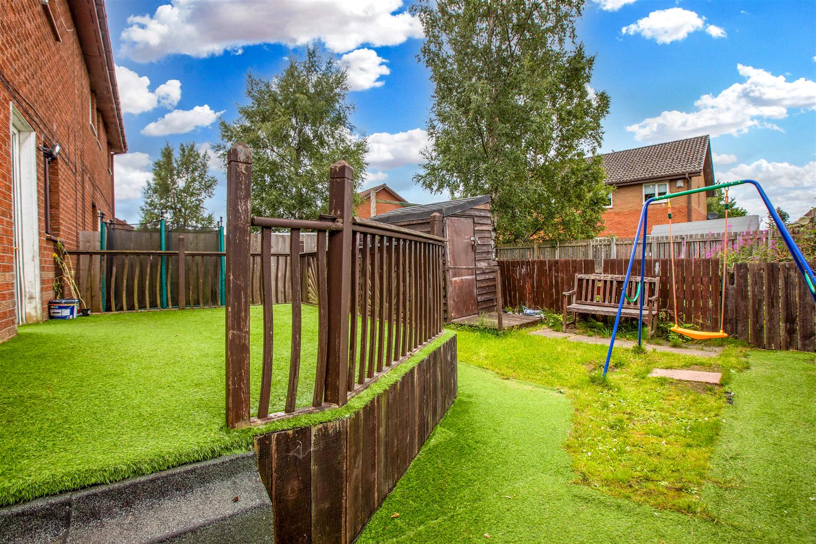 Additional features include gas central heating, double glazing throughout, and both front and rear gardens. The rear garden features a raised decked patio ideal for outdoor entertaining, along with low-maintenance artificial grass.